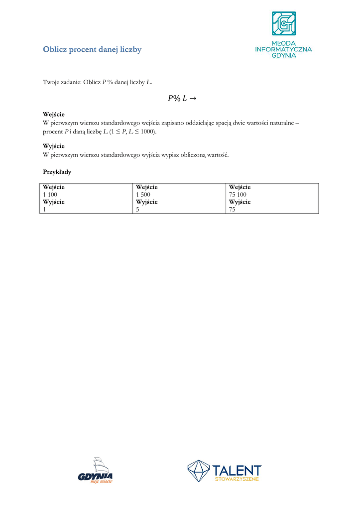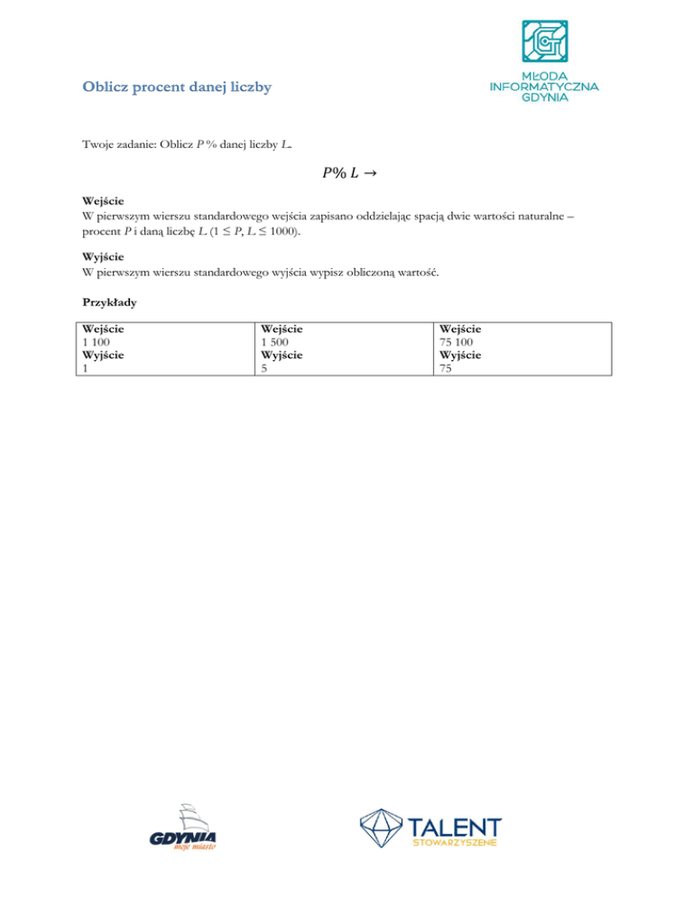 Oblicz procent danej liczby Twoje zadanie: Oblicz P % danej liczby L. 𝑃% 𝐿 → Wejście W pierwszym wierszu standardowego wejścia zapisano oddzielając spacją dwie wartości naturalne – procent P i daną liczbę L (1 ≤ P, L ≤ 1000). Wyjście W pierwszym wierszu standardowego wyjścia wypisz obliczoną wartość. Przykłady Wejście 1 100 Wyjście 1 Wejście 1 500 Wyjście 5 Wejście 75 100 Wyjście 75