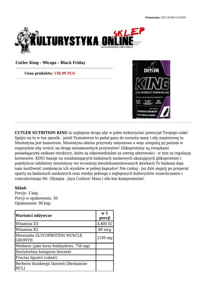 Utworzono: 2017-03-08 14:29:09 Cutler King - 90caps - Black Friday Cena produktu: 158,99 PLN CUTLER NUTRITION KING to najlepsza droga aby w pełni wykorzystać potencjał Twojego ciała! Spójrz na to w ten sposób - jeżeli Testosteron to pedał gazu do wzrostu masy i siły mięśniowej to Miostatyna jest hamulcem. Miostatyna obniża przyrosty mięsniowe a więc ureguluj jej poziom w organiźmie aby wrócić na drogę niesamowitych przyrostów! Glikoproteiny są związkami posiadającymi unikane struktury, które są odpowiedzialne za szereg aktywności - w tym za regulację hormonów. KING bazuje na oszałamiających badaniach naukowych ukazujących glikoproteiny i pojedyńcze inhibitory miostatyny we wcześniej nieudokumentowanych dawkach.Te badania daja nam możliwość zamknięcia ich wyników w jednej kapsułce! Nie czekaj - juz dziś sięgnij po preparat oparty na badaniach naukowych oraz wiedzy jednego z najlepszych kulturystów wszechczasów i czterokrotnego Mr. Olympia - Jaya Cutlera! Masa i siła bez kompromisów! Skład: Porcja: 3 kap. Porcji w opakowaniu: 30 Opakowanie: 90 kap. Wartości odżywcze w1 porcji Witamina D3 4,800 IU Witamina K2 80 mcg Mieszanka GLYCOPROTEIN MUSCLE GROWTH Mediator (jako kwas fosfatydowy, 750 mg) Dactylorhiza hatagirea (korzeń) Fructus ligustri (całość) Berberis thunbergii (korzeń) [Berbamine HCL] 2100 mg NIAGEN (jako rybozyd nikotynamidowy) Dawkowanie: 1 porcja dziennie : 1 kapsułka rano , 1 kapsułka po południu, 1 kapsułka wieczorem. Adres: http://www.ko.sklep.pl/ Telefon: kom. 782 010 880 Email: [email protected]