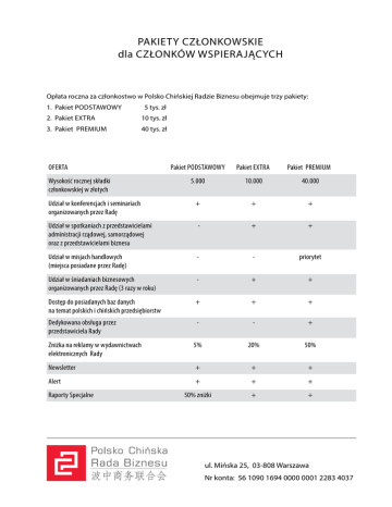 PAKIETY CZŁONKOWSKIE dla CZŁONKÓW WSPIERAJĄCYCH Opłata roczna za członkostwo w Polsko Chińskiej Radzie Biznesu obejmuje trzy pakiety: 1. Pakiet PODSTAWOWY 5 tys. zł 2. Pakiet EXTRA 10 tys. zł 3. Pakiet PREMIUM 40 tys. zł OFERTA Pakiet PODSTAWOWY Pakiet EXTRA Pakiet PREMIUM 5.000 10.000 40.000 Udział w konferencjach i seminariach organizowanych przez Radę + + + Udział w spotkaniach z przedstawicielami administracji rządowej, samorządowej oraz z przedstawicielami biznesu - + + Udział w misjach handlowych (miejsca posiadane przez Radę) - - priorytet Udział w śniadaniach biznesowych organizowanych przez Radę (3 razy w roku) - + + Dostęp do posiadanych baz danych na temat polskich i chińskich przedsiębiorstw + + + Dedykowana obsługa przez przedstawiciela Rady - - + Zniżka na reklamy w wydawnictwach elektronicznych Rady 5% 20% 50% Newsletter + + + Alert + + + 50% zniżki + + Wysokość rocznej składki członkowskiej w złotych Raporty Specjalne ul. Mińska 25, 03-808 Warszawa Nr konta: 56 1090 1694 0000 0001 2283 4037