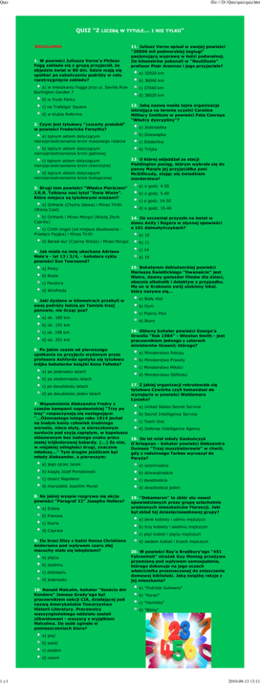 Quiz 1z1 file:///D:/Quiz/quiz/quiz.htm QUIZ "Z LICZBĄ W TYTULE... I NIE TYLKO" REGULAMIN 1. W powieści Juliusza Verne'a Phileas Fogg zakłada się z grupą przyjaciół, że objedzie świat w 80 dni. Gdzie mają się spotkać po zakończeniu podróży w celu rozstrzygnięcia zakładu? a) w mieszkaniu Fogga przy ul. Saville Row Burlington Garden 7 11. Juliusz Verne opisał w swojej powieści "20000 mil podmorskiej żeglugi" pasjonującą wyprawę w łodzi podwodnej. Ile kilometrów pokonali w "Nautiliusie" profesor Piotr Aronnax i jego przyjaciele? a) 32020 km b) 36040 km c) 37040 km d) 38020 km b) w Hyde Parku c) na Trafalgar Square d) w klubie Reforma 2. Czym jest tytułowy "czwarty protokół" w powieści Fredericka Forsytha? 12. Jaką nazwę nosiła tajna organizacja istniejąca na terenie uczelni Carolina Military Institute w powieści Pata Conroya "Władcy dyscypliny"? a) Jedenastka a) tajnym aktem dotyczącym nierozprzestrzeniania broni masowego rażenia b) Dziewiątka b) tajnym aktem dotyczącym nierozprzestrzeniania broni jądrowej d) Trójka c) tajnym aktem dotyczącym nierozprzestrzeniania broni chemicznej d) tajnym aktem dotyczącym nierozprzestrzeniania broni biologicznej 3. Drugi tom powieści "Władca Pierścieni" J.R.R. Tolkiena nosi tytuł "Dwie Wieże". Które miejsca są tytułowymi wieżami? a) Orthank (Chytra Głowa) i Minas Tirith (Wieża Czat) b) Orthank i Minas Morgul (Wieżą Złych Czarów) c) Cirith Ungol (od miejsca zbudowania Przełęcz Pająka) i Minas Tirith d) Barad-dur (Czarna Wieża) i Minas Morgul 4. Jak miała na imię ukochana Adriana Mole'a - lat 13 i 3/4, - bohatera cyklu powieści Sue Townsend? a) Pinky b) Rosie c) Pandora d) Winifreda 5. Jaki dystans w kilometrach przebyli w swej podróży łodzią po Tamizie trzej panowie, nie licząc psa? a) ok. 185 km c) Siódemka 13. O której odjeżdżał ze stacji Paddington pociąg, którym wybrała się do panny Marple jej przyjaciółka pani McGillicudy, stając się świadkiem morderstwa? a) o godz. 4.50 b) o godz. 5.40 c) o godz. 14.50 d) o godz. 15.40 14. Ile szczeniąt przyszło na świat w domu Anity i Rogera w słynnej opowieści o 101 dalmatyńczykach? a) 10 b) 11 c) 14 d) 15 15. Bohaterem debiutanckiej powieści Mariusza Świetlickiego "Dwanaście" jest Mistrz, dawny gwiazdor filmów dla dzieci, obecnie alkoholik i detektyw z przypadku. Ma on w Krakowie swój ulubiony lokal, który nazywa się... a) Biały Kieł b) Dym c) Piękny Pies d) Biuro b) ok. 191 km c) ok. 198 km d) ok. 201 km 6. Po jakim czasie od pierwszego spotkania na przyjęciu wydanym przez profesora Ashforda spotyka się tytułowa trójka bohaterów książki Kena Folletta? a) po jedenastu latach 16. Główny bohater powieści George'a Orwella "Rok 1984" - Winston Smith - jest pracownikiem jednego z czterech ministerstw Oceanii; którego? a) Ministerstwo Pokoju b) Ministerstwo Prawdy c) Ministerstwo Miłości d) Ministerstwo Obfitości b) po siedemnastu latach c) po dwudziestu latach d) po dwudziestu jeden latach 7. Wspomnienia Aleksandra Fredry z czasów kampanii napoleońskiej "Trzy po trzy" rozpoczynają się następująco: "...Óśmnastego lutego roku 1814 jechał na białym koniu człowiek średniego wzrostu, nieco otyły, w sieroczkowym surducie pod szyją zapiętym, w kapeluszu stósowanym bez żadnego znaku prócz małej trójkolorowej kokardy. (...) Za nim, w niejakiej odległości drugi, znacznie młodszy..." Tym drugim jeźdźcem był młody Aleksander, a pierwszym: 17. Z jakiej organizacji rekrutowała się tytułowa Czwórka czyli komandosi do wynajęcia w powieści Waldemara Łysiaka? a) United States Secret Service b) Secret Intelligence Service c) Team One d) Defense Intelligence Agency 18. Ile lat miał młody Gaskończyk D'Artagnan - bohater powieści Aleksandra Dumasa "Trzej muszkieterowie" w chwili, gdy z rodzinnego Tarbes wyruszył do Paryża? a) jego ojciec Jacek a) osiemnaście b) książę Józef Poniatowski b) dziewiętnaście c) cesarz Napoleon c) dwadzieścia d) marszałek Joachim Murat d) dwadzieścia jeden 8. Na jakiej wyspie rozgrywa się akcja powieści "Paragraf 22" Josepha Hellera? a) Eubea b) Pianosa c) Ikaria d) Capraia 9. Ilu braci Elizy z baśni Hansa Christiana Andersena pod wpływem czaru złej macochy stało się łabędziami? a) pięciu b) siedmiu c) dziesięciu d) jedenastu 10. Ronald Malcolm, bohater "Sześciu dni Kondora" Jamesa Grady'ego był pracownikiem sekcji CIA, działającej pod nazwą Amerykańskie Towarzystwo Historii Literatury. Pracownicy waszyngtońskiego oddziału zostali zlikwidowani - wszyscy z wyjątkiem Malcolma. Ile osób zginęło w pomieszczeniach biura? 19. "Dekameron" to zbiór stu nowel opowiedzianych przez grupę szlachetnie urodzonych mieszkańców Florencji. Jaki był skład tej dziesięcioosobowej grupy? a) dwie kobiety i ośmiu mężczyzn b) trzy kobiety i siedmiu mężczyzn c) pięć kobiet i pięciu mężczyzn d) siedem kobiet i trzech mężczyzn 20. W powieści Ray'a Bradbury'ego "451 Fahrenheit" strażak Guy Montag przeżywa przemianę pod wpływem samospalenia, którego dokonuje na jego oczach właścicielka przeznaczonej do zniszczenia domowej biblioteki. Jaką książkę ratuje z jej mieszkania? a) "Podróże Guliwera" b) "Koran" c) "Hamleta" d) "Biblię" a) pięć b) sześć c) siedem d) osiem 2010-09-13 13:11