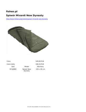 fisheo.pl Śpiwór Mivardi New Dynasty http://www.fisheo.pl/produkt/spiwor-mivardi-new-dynasty Cena 549.00 PLN Cena netto 446.34 PLN Kod Model Wymiary M-SLBND Śpiwór New Dynasty 235 x 95 cm TXT_PDF_PAGE_NUMBER 1 TXT_PDF_PAGE_OUT_OF 1