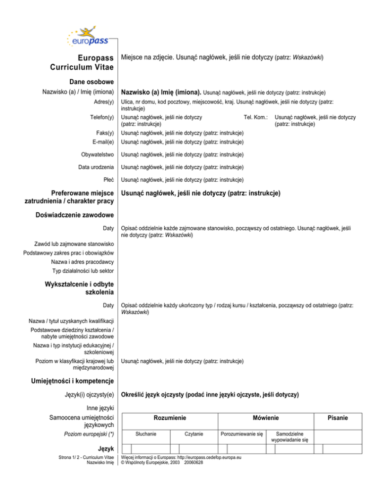 Europass Miejsce na zdjęcie. Usunąć nagłówek, jeśli nie dotyczy (patrz: Wskazówki) Curriculum Vitae Dane osobowe Nazwisko (a) / Imię (imiona) Adres(y) Telefon(y) Nazwisko (a) Imię (imiona). Usunąć nagłówek, jeśli nie dotyczy (patrz: instrukcje) Ulica, nr domu, kod pocztowy, miejscowość, kraj. Usunąć nagłówek, jeśli nie dotyczy (patrz: instrukcje) Usunąć nagłówek, jeśli nie dotyczy (patrz: instrukcje) Tel. Kom.: Faks(y) Usunąć nagłówek, jeśli nie dotyczy (patrz: instrukcje) E-mail(e) Usunąć nagłówek, jeśli nie dotyczy (patrz: instrukcje) Obywatelstwo Usunąć nagłówek, jeśli nie dotyczy (patrz: instrukcje) Data urodzenia Usunąć nagłówek, jeśli nie dotyczy (patrz: instrukcje) Płeć Usunąć nagłówek, jeśli nie dotyczy (patrz: instrukcje) Usunąć nagłówek, jeśli nie dotyczy (patrz: instrukcje) Preferowane miejsce Usunąć nagłówek, jeśli nie dotyczy (patrz: instrukcje) zatrudnienia / charakter pracy Doświadczenie zawodowe Daty Opisać oddzielnie kaŜde zajmowane stanowisko, począwszy od ostatniego. Usunąć nagłówek, jeśli nie dotyczy (patrz: Wskazówki) Zawód lub zajmowane stanowisko Podstawowy zakres prac i obowiązków Nazwa i adres pracodawcy Typ działalności lub sektor Wykształcenie i odbyte szkolenia Daty Opisać oddzielnie kaŜdy ukończony typ / rodzaj kursu / kształcenia, począwszy od ostatniego (patrz: Wskazówki) Nazwa / tytuł uzyskanych kwalifikacji Podstawowe dziedziny kształcenia / nabyte umiejętności zawodowe Nazwa i typ instytucji edukacyjnej / szkoleniowej Poziom w klasyfikacji krajowej lub międzynarodowej Usunąć nagłówek, jeśli nie dotyczy (patrz: instrukcje) Umiejętności i kompetencje Język(i) ojczysty(e) Określić język ojczysty (podać inne języki ojczyste, jeśli dotyczy) Inne języki Samoocena umiejętności językowych Poziom europejski (*) Rozumienie Słuchanie Czytanie Mówienie Porozumiewanie się Język Strona 1/ 2 - Curriculum Vitae Nazwisko Imię Więcej informacji o Europass: http://europass.cedefop.europa.eu © Wspólnoty Europejskie, 2003 20060628 Samodzielne wypowiadanie się Pisanie Język (*) Europejski system opisu kształcenia językowego Umiejętności kompetencje społeczne Opisać tego rodzaju kompetencje i podać miejsce ich uzyskania. Usunąć nagłówek, jeśli nie dotyczy (patrz: instrukcje) Umiejętności i kompetencje organizacyjne Opisać tego rodzaju kompetencje i podać miejsce ich uzyskania. Usunąć nagłówek, jeśli nie dotyczy (patrz: instrukcje) Umiejętności i kompetencje techniczne Opisać tego rodzaju kompetencje i podać miejsce ich uzyskania. Usunąć nagłówek, jeśli nie dotyczy (patrz: instrukcje) Umiejętności i kompetencje w zakresie obsługi komputera Opisać tego rodzaju kompetencje i podać miejsce ich uzyskania. Usunąć nagłówek, jeśli nie dotyczy (patrz: instrukcje) Umiejętności i kompetencje artystyczne Opisać tego rodzaju kompetencje i podać miejsce ich uzyskania. Usunąć nagłówek, jeśli nie dotyczy (patrz: instrukcje) Inne umiejętności i kompetencje Opisać tego rodzaju kompetencje i podać miejsce ich uzyskania. Usunąć nagłówek, jeśli nie dotyczy (patrz: instrukcje) Prawo jazdy Podać, czy posiada się prawo jazdy; jeśli tak, to jakiej kategorii. Usunąć nagłówek, jeśli nie dotyczy (patrz: instrukcje) Informacje dodatkowe Podać inne informacje, które mogą być istotne, np. osoby kontaktowe, referencje, itd. Usunąć nagłówek, jeśli nie dotyczy (patrz: instrukcje) Załączniki Wymienić wszystkie załączniki. Usunąć nagłówek, jeśli nie dotyczy (patrz: instrukcje) Strona 2/ 2 - Curriculum Vitae Nazwisko Imię Więcej informacji o Europass: http://europass.cedefop.europa.eu © Wspólnoty Europejskie, 2003 20060628
