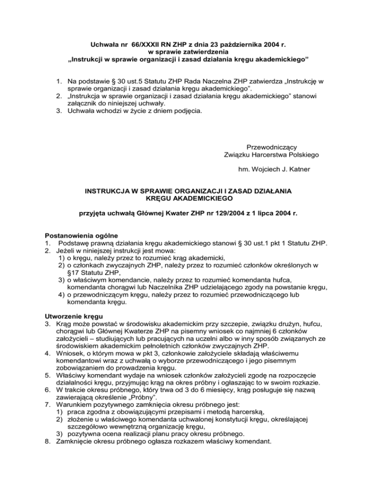Uchwała nr 66/XXXII RN ZHP z dnia 23 października 2004 r. w sprawie zatwierdzenia „Instrukcji w sprawie organizacji i zasad działania kręgu akademickiego” 1. Na podstawie § 30 ust.5 Statutu ZHP Rada Naczelna ZHP zatwierdza „Instrukcję w sprawie organizacji i zasad działania kręgu akademickiego”. 2. „Instrukcja w sprawie organizacji i zasad działania kręgu akademickiego” stanowi załącznik do niniejszej uchwały. 3. Uchwała wchodzi w życie z dniem podjęcia. Przewodniczący Związku Harcerstwa Polskiego hm. Wojciech J. Katner INSTRUKCJA W SPRAWIE ORGANIZACJI I ZASAD DZIAŁANIA KRĘGU AKADEMICKIEGO przyjęta uchwałą Głównej Kwater ZHP nr 129/2004 z 1 lipca 2004 r. Postanowienia ogólne 1. Podstawę prawną działania kręgu akademickiego stanowi § 30 ust.1 pkt 1 Statutu ZHP. 2. Jeżeli w niniejszej instrukcji jest mowa: 1) o kręgu, należy przez to rozumieć krąg akademicki, 2) o członkach zwyczajnych ZHP, należy przez to rozumieć członków określonych w §17 Statutu ZHP, 3) o właściwym komendancie, należy przez to rozumieć komendanta hufca, komendanta chorągwi lub Naczelnika ZHP udzielającego zgody na powstanie kręgu, 4) o przewodniczącym kręgu, należy przez to rozumieć przewodniczącego lub komendanta kręgu. Utworzenie kręgu 3. Krąg może powstać w środowisku akademickim przy szczepie, związku drużyn, hufcu, chorągwi lub Głównej Kwaterze ZHP na pisemny wniosek co najmniej 6 członków założycieli – studiujących lub pracujących na uczelni albo w inny sposób związanych ze środowiskiem akademickim pełnoletnich członków zwyczajnych ZHP. 4. Wniosek, o którym mowa w pkt 3, członkowie założyciele składają właściwemu komendantowi wraz z uchwałą o wyborze przewodniczącego i jego pisemnym zobowiązaniem do prowadzenia kręgu. 5. Właściwy komendant wydaje na wniosek członków założycieli zgodę na rozpoczęcie działalności kręgu, przyjmując krąg na okres próbny i ogłaszając to w swoim rozkazie. 6. W trakcie okresu próbnego, który trwa od 3 do 6 miesięcy, krąg posługuje się nazwą zawierającą określenie „Próbny”. 7. Warunkiem pozytywnego zamknięcia okresu próbnego jest: 1) praca zgodna z obowiązującymi przepisami i metodą harcerską, 2) złożenie u właściwego komendanta uchwalonej konstytucji kręgu, określającej szczegółowo wewnętrzną organizację kręgu, 3) pozytywna ocena realizacji planu pracy okresu próbnego. 8. Zamknięcie okresu próbnego ogłasza rozkazem właściwy komendant. 9. Po zamknięciu okresu próbnego z wynikiem pozytywnym: 1) właściwy komendant może przyznać kręgowi prawo posiadania imienia i sztandaru, a także nadać mu nazwę; tryb przyznawania nazwy, imienia i sztandaru określa odrębna instrukcja, 2) krąg ma prawo używania pieczęci zarejestrowanych przez właściwego komendanta. Członkowie kręgu 10. Członkami kręgu mogą być studiujący lub pracujący na uczelni albo w inny sposób związani ze środowiskiem akademickim pełnoletni członkowie zwyczajni ZHP. 11. Członkostwo w kręgu może być łączone z członkostwem w innych podstawowych jednostkach organizacyjnych ZHP. W takim przypadku na wniosek członka kręgu określany jest jego podstawowy przydział służbowy. 12. Osoby niewymienione w pkt 10, w tym zwłaszcza osoby niezrzeszone w ZHP, mogą działać przy kręgu na zasadach koła przyjaciół harcerstwa. Zasady działania koła przyjaciół harcerstwa określa odrębna instrukcja. 13. Konstytucja kręgu może przyznawać osobom, o których mowa w pkt 12, szczególne uprawnienia, w tym zwłaszcza prawo do czynnego udziału w życiu kręgu i prawo do używania symboli kręgu. Nie może im jednak przyznać biernego prawa wyborczego do władz kręgu. Funkcyjni kręgu 14. Kręgiem kieruje jego przewodniczący wybierany przez krąg. Przewodniczącym kręgu może być instruktor lub członek zwyczajny ZHP przygotowany do pracy metodyką wędrowniczą. Decyzję kręgu zatwierdza rozkazem właściwy komendant. 15. Przewodniczący kręgu: 1) reprezentuje krąg, 2) odpowiada za realizację planu pracy kręgu, 3) wydaje rozkazy, 4) odpowiada za prowadzenie dokumentacji kręgu, 5) odpowiada za działalność finansowo-gospodarczą kręgu, 6) wykonuje inne czynności powierzone mu przez krąg lub właściwego komendanta. 16. W zależności od potrzeb danego kręgu mogą być powoływane inne organy i funkcyjni kręgu. Szczegółowe zasady ich powoływania i działania określa konstytucja kręgu. Cele, zadania i zasady działania kręgu 17. Celami kręgu są: 1) rozwój harcerski i instruktorski jego członków, 2) podejmowanie służby społecznej na rzecz harcerstwa, środowiska i swych członków, 3) utrzymywanie więzi ze środowiskiem harcerskim i wspólnotą instruktorską, 4) szeroko pojęta promocja harcerstwa. 18. Krąg pracuje zgodnie z metodą harcerską i samodzielnie planuje swoją pracę. 19. Krąg działa na podstawie konstytucji kręgu zgodnej ze Statutem ZHP i niniejszą instrukcją. Konstytucja kręgu musi szczegółowo określać przynajmniej wewnętrzną organizację kręgu. Inne sprawy mogą być w niej regulowane, jeśli krąg uzna je za ważne dla swego działania. 20. Krąg liczy co najmniej 6 członków. 21. Zbiórki kręgu odbywają się systematycznie. 22. Do zadań kręgu należy w szczególności: 1) stwarzanie warunków do rozwoju duchowego, społecznego, intelektualnego, emocjonalnego i fizycznego członków kręgu, w tym zwłaszcza przez umożliwienie im zdobywania stopni, sprawności, znaków służb i uprawnień państwowych, 2) stwarzanie warunków do wymiany doświadczeń oraz doskonalenia metod i form pracy członków kręgu oraz innych członków ZHP, 3) inicjowanie i organizowanie działalności programowej i wychowawczej, 4) aktywna współpraca ze środowiskiem swego działania, 5) rzecznictwo spraw swoich członków, 6) podejmowanie konkretnych działań służących promowaniu harcerstwa, w tym zwła