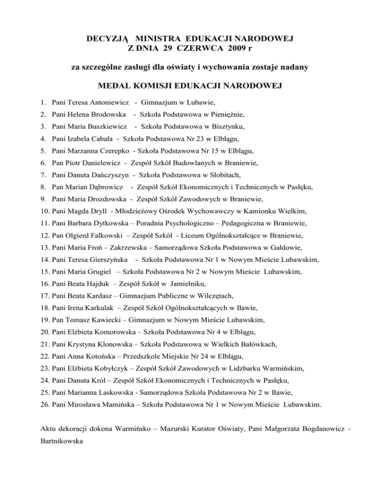 DECYZJĄ MINISTRA EDUKACJI NARODOWEJ Z DNIA 29 CZERWCA 2009 r za szczególne zasługi dla oświaty i wychowania zostaje nadany MEDAL KOMISJI EDUKACJI NARODOWEJ 1. Pani Teresa Antoniewicz - Gimnazjum w Lubawie, 2. Pani Helena Brodowska - Szkoła Podstawowa w PienięŜnie, 3. Pani Maria Buszkiewicz - Szkoła Podstawowa w Bisztynku, 4. Pani Izabela Cabała - Szkoła Podstawowa Nr 23 w Elblągu, 5. Pani Marzanna Czerepko - Szkoła Podstawowa Nr 15 w Elblągu, 6. Pan Piotr Danielewicz - Zespół Szkół Budowlanych w Braniewie, 7. Pani Danuta Dańczyszyn - Szkoła Podstawowa w Słobitach, 8. Pan Marian Dąbrowicz - Zespół Szkół Ekonomicznych i Technicznych w Pasłęku, 9. Pani Maria Drozdowska - Zespół Szkół Zawodowych w Braniewie, 10. Pani Magda Dryll - MłodzieŜowy Ośrodek Wychowawczy w Kamionku Wielkim, 11. Pani Barbara Dytkowska – Poradnia Psychologiczno – Pedagogiczna w Braniewie, 12. Pan Olgierd Falkowski – Zespół Szkół - Liceum Ogólnokształcące w Braniewie, 13. Pani Maria Froń – Zakrzewska – Samorządowa Szkoła Podstawowa w Gałdowie, 14. Pani Teresa Gierszyńska - Szkoła Podstawowa Nr 1 w Nowym Mieście Lubawskim, 15. Pani Maria Grugiel – Szkoła Podstawowa Nr 2 w Nowym Mieście Lubawskim, 16. Pani Beata Hajduk – Zespół Szkół w Jamielniku, 17. Pani Beata Kardasz – Gimnazjum Publiczne w Wilczętach, 18. Pani Irena Karkulak – Zespół Szkół Ogólnokształcących w Iławie, 19. Pan Tomasz Kawiecki – Gimnazjum w Nowym Mieście Lubawskim, 20. Pani ElŜbieta Komorowska – Szkoła Podstawowa Nr 4 w Elblągu, 21. Pani Krystyna Klonowska – Szkoła Podstawowa w Wielkich Bałówkach, 22. Pani Anna Kotońska – Przedszkole Miejskie Nr 24 w Elblągu, 23. Pani ElŜbieta Kobyłczyk – Zespół Szkół Zawodowych w Lidzbarku Warmińskim, 24. Pani Danuta Król – Zespół Szkół Ekonomicznych i Technicznych w Pasłęku, 25. Pani Marianna Laskowska - Samorządowa Szkoła Podstawowa Nr 2 w Iławie, 26. Pani Mirosława Mamińska – Szkoła Podstawowa Nr 1 w Nowym Mieście Lubawskim. Aktu dekoracji dokona Warmińsko – Mazurski Kurator Oświaty, Pani Małgorzata Bogdanowicz – Bartnikowska DECYZJĄ MINISTRA EDUKACJI NARODOWEJ Z DNIA 29 CZERWCA 2009 r za szczególne zasługi dla oświaty i wychowania zostaje nadany MEDAL KOMISJI EDUKACJI NARODOWEJ 27. Pani GraŜyna Mańka – Szkoła Podstawowa w Słobitach, 28. Pani Halina Miedzińska– Specjalny Ośrodek Szkolno – Wychowawczy Nr 2 w Elblągu, 29. Pani Urszula Myk – Szkoła Podstawowa Nr 15 w Elblągu, 30. Pani Justyna Neuman – Gimnazjum w Nowym Mieście Lubawskim, 31. Pani Jolanta Piekarska – Szkoła Podstawowa Nr 12 w Elblągu, 32. Pani Małgorzata Potomska – Szkoła Podstawowa Nr 2 w Nowym Mieście Lubawskim, 33. Pani Joanna Poźnikiewicz – Kuratorium Oświaty w Olsztynie Delegatura w Elblągu, 34. Pani Stanisława Rysz – Zespół Szkół Ogólnokształcących w Iławie, 35. Pan Marek Sarnowski – Zespół Szkół Powszechnych w Pasłęku, 36. Pan Ryszard Sawicki – Gimnazjum w Gronowie Elbląskim, 37. Pani GraŜyna Sendlewska – Zespół Szkół Ogólnokształcących w Iławie, 38. Pani GraŜyna Sendrowicz – Zespół Szkół im. Bohaterów Września 1939 Roku w Iławie, 39. Pani Irena Siedlecka – Szkoła Podstawowa w Nowicy, 40. Pani ElŜbieta Skałecka – Zespół Szkół im. Bohaterów Września 1939 Roku w Iławie, 41. Pani Mirella StróŜowska – Przedszkole Nr 10 w Elblągu, 42. Pani Joanna Szaduro – Cydzik – Szkoła Policealna w Elblągu, 43. Pani Teresa Ślesińska – Poradnia Psychologiczno – Pedagogiczna w Pasłęku, 44. Pani Marlena Tomczyk – Zespół Szkół w Suszu, 45. Pani Zofia Warszawik – Zespół Szkół w Pasłęku, 46. Pani Małgorzata Zawacka – Zespół Szkół w Jamielniku, 47. Pani Laura Złamaniec – Przedszkole Miejskie Nr 34 w Elblągu. Aktu dekoracji dokona Warmińsko – Mazurski Kurator Oświaty, Pani Małgorzata Bogdanowicz – Bartnikowska.