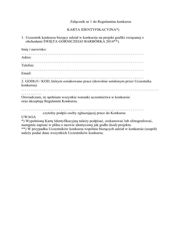 Załącznik nr 1 do Regulaminu konkursu KARTA IDENTYFIKACYJNA*) 1. Uczestnik konkursu biorący udział w konkursie na projekt grafiki związanej z obchodami ŚWIĘTA GÓRNICZEGO BARBÓRKA 2014**). Imię i nazwisko: ................................................................. Adres: ................................................................. Telefon: ................................................................. Email: ................................................................. 2. GODŁO / KOD, którym oznakowano prace (dowolnie ustalonym przez Uczestnika konkursu). ......................................................................... ........... Oświadczam, że spełniam wszystkie warunki uczestnictwa w konkursie oraz akceptuję Regulamin Konkursu. ................................................................. czytelny podpis osoby zgłaszającej prace do Konkursu UWAGA *) Wypełnioną Kartę Identyfikacyjną należy podpisać, zeskanować lub sfotografować, następnie zapisać w pliku o nazwie identycznej jak godło (kod) projektu. **) W przypadku Uczestników konkursu wspólnie biorących udział w konkursie (zespół) należy podać dane wszystkich Uczestników konkursu.