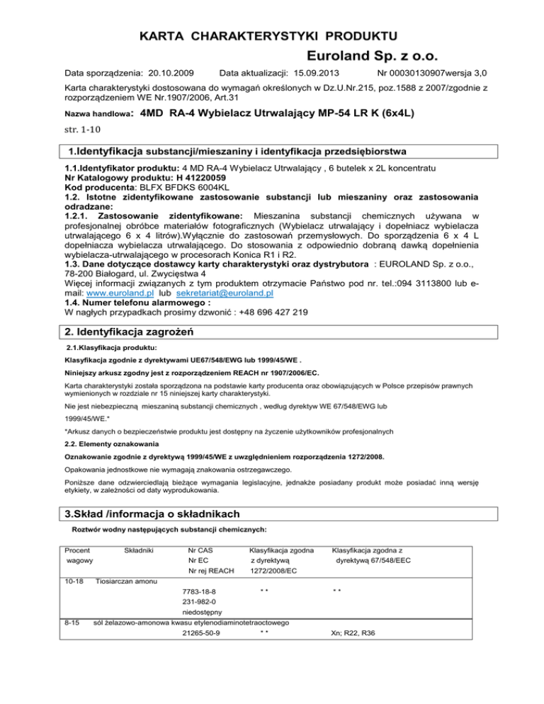 KARTA CHARAKTERYSTYKI PRODUKTU Euroland Sp. z o.o. Data sporządzenia: 20.10.2009 Data aktualizacji: 15.09.2013 Nr 00030130907wersja 3,0 Karta charakterystyki dostosowana do wymagań określonych w Dz.U.Nr.215, poz.1588 z 2007/zgodnie z rozporządzeniem WE Nr.1907/2006, Art.31 Nazwa handlowa: 4MD RA-4 Wybielacz Utrwalający MP-54 LR K (6x4L) str. 1-10 1.Identyfikacja substancji/mieszaniny i identyfikacja przedsiębiorstwa 1.1.Identyfikator produktu: 4 MD RA-4 Wybielacz Utrwalający , 6 butelek x 2L koncentratu Nr Katalogowy produktu: H 41220059 Kod producenta: BLFX BFDKS 6004KL 1.2. Istotne zidentyfikowane zastosowanie substancji lub mieszaniny oraz zastosowania odradzane: 1.2.1. Zastosowanie zidentyfikowane: Mieszanina substancji chemicznych używana w profesjonalnej obróbce materiałów fotograficznych (Wybielacz utrwalający i dopełniacz wybielacza utrwalającego 6 x 4 litrów).Wyłącznie do zastosowań przemysłowych. Do sporządzenia 6 x 4 L dopełniacza wybielacza utrwalającego. Do stosowania z odpowiednio dobraną dawką dopełnienia wybielacza-utrwalającego w procesorach Konica R1 i R2. 1.3. Dane dotyczące dostawcy karty charakterystyki oraz dystrybutora : EUROLAND Sp. z o.o., 78-200 Białogard, ul. Zwycięstwa 4 Więcej informacji związanych z tym produktem otrzymacie Państwo pod nr. tel.:094 3113800 lub email: www.euroland.pl lub [email protected] 1.4. Numer telefonu alarmowego : W nagłych przypadkach prosimy dzwonić : +48 696 427 219 2. Identyfikacja zagrożeń 2.1.Klasyfikacja produktu: Klasyfikacja zgodnie z dyrektywami UE67/548/EWG lub 1999/45/WE . Niniejszy arkusz zgodny jest z rozporządzeniem REACH nr 1907/2006/EC. Karta charakterystyki została sporządzona na podstawie karty producenta oraz obowiązujących w Polsce przepisów prawnych wymienionych w rozdziale nr 15 niniejszej karty charakterystyki. Nie jest niebezpieczną mieszaniną substancji chemicznych , według dyrektyw WE 67/548/EWG lub 1999/45/WE.* *Arkusz danych o bezpieczeństwie produktu jest dostępny na życzenie użytkowników profesjonalnych 2.2. Elementy oznakowania Oznakowanie zgodnie z dyrektywą 1999/45/WE z uwzględnieniem rozporządzenia 1272/2008. Opakowania jednostkowe nie wymagają znakowania ostrzegawczego. Poniższe dane odzwierciedlają bieżące wymagania legislacyjne, jednakże posiadany produkt może posiadać inną wersję etykiety, w zależności od daty wyprodukowania. 3.Skład /informacja o składnikach Roztwór wodny następujących substancji chemicznych: Procent Składniki wagowy 10-18 Nr CAS Klasyfikacja zgodna Nr EC z dyrektywą Nr rej REACH 1272/2008/EC Klasyfikacja zgodna z dyrektywą 67/548/EEC Tiosiarczan amonu 7783-18-8 ** ** 231-982-0 niedostępny 8-15 sól żelazowo-amonowa kwasu etylenodiaminotetraoctowego 21265-50-9 ** Xn; R22, R36 KARTA CHARAKTERYSTYKI PRODUKTU Euroland Sp. z o.o. Data sporządzenia: 20.10.2009 Data aktualizacji: 15.09.2013 Nr 00030130907wersja 3,0 Karta charakterystyki dostosowana do wymagań określonych w Dz.U.Nr.215, poz.1588 z 2007/zgodnie z rozporządzeniem WE Nr.1907/2006, Art.31 Nazwa handlowa: 4MD RA-4 Wybielacz Utrwalający MP-54 LR K (6x4L) str. 2-10 244-302-2 niedostęony 1-4 wodorosiarczan (IV) amonowy 10192-30-0 ** C; R31, R34 233-469-7 * * niedostępny 1-4 siarczan (IV) amonu 10196-04-0 * Xi; R31, R 36/38 233-484-9 niedostępny 1-4 ** wodorosiarczan (IV) sodu 7631-90-5 Acute Tox. H 302 Xn; R22, R31 231-548-0 niedostępny 1-5 ** kwas octowy. 64-19-7 Flam.Liq. 3 H226 200-580-7 Skin Corr 1A H314 C; R10, R35 * niedostępny Pełen tekst zwrotów R- i H- patrz: Rozdział 16 * Klasyfikacja substancji zgodnie z Załącznikiem VI rozporządzenia(EC) Nr 1272/2008 * * Substancje nie wymienione w Załączniku VI rozporządzenia (EC) Nr 1272/2008 4.Środki pierwszej pomocy 4.1. Opis środków pierwszej pomocy 4.1.1. Wdychanie: W przypadku wystąpienia objawów wyprowadzić poszkodowanego na świeże powietrze. W przypadku utrzymywania się dolegliwości zwrócić się o pomoc medyczną. 4.1.2. Skóra: Natychmiast spłukać skórę dużą ilością wody z mydłem. W przypadku utrzymywania się dolegliwości zwrócić się o pomoc lekarską. 4.1.3. Oczy: Natychmiast przemyć oczy dużą ilością czystej, bieżącej wody przez minimum 15 minut. W przypadku utrzymywania się dolegliwości zwrócić się o pomoc lekarską. 4.1.4. Połknięcie: NIE WYWOŁYWAĆ wymiotów. Osobie poszkodowanej podać szklankę wody. Zwrócić się o pomoc medyczną. Nigdy nie podawać osobie nieprzytomnej żadnych środków doustnie. 4.2. Najważniejsze ostre i opóźnione objawy oraz skutki narażenia: Brak dostępnej informacji. 4.3. Wskazania dotyczące wszelkiej natychmiastowej pomocy lekarskiej i szczególnego postępowania z poszkodowanym: Brak dostępnej informacji. 5. Postępowanie w przypadku pożaru 5.1.Środki gaśnicze: Produkt jest niepalny. Środki gaśnicze stosowne do materiałów znajdujących się w strefie pożaru: stosować zraszacze wodne, gaśnice wodne, gaśnice pianowe odporne na alkohol, gaśnice chemiczne lub gaśnice zawierające dwutlenek węgla. Spłukiwać dużą ilością wody. 5.2. Szczególne zagrożenia związane z substancją lub mieszaniną 5.2.1.Niebezpieczne produkty spalania: Ogień lub wysoka temperatura może wytworzyć wydzielanie się niebezpiecznych KARTA CHARAKTERYSTYKI PRODUKTU Euroland Sp. z o.o. Data sporządzenia: 20.10.2009 Data aktualizacji: 15.09.2013 Nr 00030130907wersja 3,0 Karta charakterystyki dostosowana do wymagań określonych w Dz.U.Nr.215, poz.1588 z 2007/zgodnie z rozporządzeniem WE Nr.1907/2006, Art.31 Nazwa handlowa: 4MD RA-4 Wybielacz Utrwalający MP-54 LR K (6x4L) str. 3-10 produktów rozkładu ( patrz punkt 10 niniejszej karty charakterystyki – Stabilność i reaktywność). Produkty spalania mogą działać jako czynniki redukujące. Reagują gwałtownie z utleniaczami .Mogą wtedy spowodować gwałtowne reakcje w których wydziela się duża ilość ciepła oraz zapłon, zwłaszcza jeżeli skła