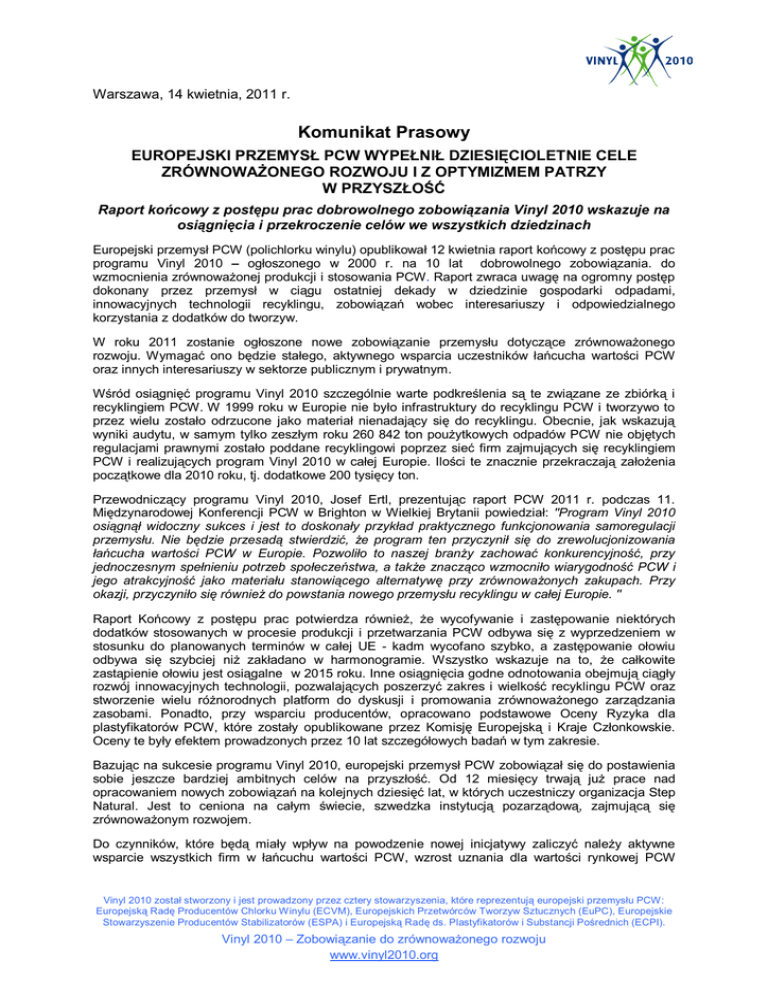 Warszawa, 14 kwietnia, 2011 r. Komunikat Prasowy EUROPEJSKI PRZEMYSŁ PCW WYPEŁNIŁ DZIESIĘCIOLETNIE CELE ZRÓWNOWAŻONEGO ROZWOJU I Z OPTYMIZMEM PATRZY W PRZYSZŁOŚĆ Raport końcowy z postępu prac dobrowolnego zobowiązania Vinyl 2010 wskazuje na osiągnięcia i przekroczenie celów we wszystkich dziedzinach Europejski przemysł PCW (polichlorku winylu) opublikował 12 kwietnia raport końcowy z postępu prac programu Vinyl 2010 – ogłoszonego w 2000 r. na 10 lat dobrowolnego zobowiązania. do wzmocnienia zrównoważonej produkcji i stosowania PCW. Raport zwraca uwagę na ogromny postęp dokonany przez przemysł w ciągu ostatniej dekady w dziedzinie gospodarki odpadami, innowacyjnych technologii recyklingu, zobowiązań wobec interesariuszy i odpowiedzialnego korzystania z dodatków do tworzyw. W roku 2011 zostanie ogłoszone nowe zobowiązanie przemysłu dotyczące zrównoważonego rozwoju. Wymagać ono będzie stałego, aktywnego wsparcia uczestników łańcucha wartości PCW oraz innych interesariuszy w sektorze publicznym i prywatnym. Wśród osiągnięć programu Vinyl 2010 szczególnie warte podkreślenia są te związane ze zbiórką i recyklingiem PCW. W 1999 roku w Europie nie było infrastruktury do recyklingu PCW i tworzywo to przez wielu zostało odrzucone jako materiał nienadający się do recyklingu. Obecnie, jak wskazują wyniki audytu, w samym tylko zeszłym roku 260 842 ton poużytkowych odpadów PCW nie objętych regulacjami prawnymi zostało poddane recyklingowi poprzez sieć firm zajmujących się recyklingiem PCW i realizujących program Vinyl 2010 w całej Europie. Ilości te znacznie przekraczają założenia początkowe dla 2010 roku, tj. dodatkowe 200 tysięcy ton. Przewodniczący programu Vinyl 2010, Josef Ertl, prezentując raport PCW 2011 r. podczas 11. Międzynarodowej Konferencji PCW w Brighton w Wielkiej Brytanii powiedział: "Program Vinyl 2010 osiągnął widoczny sukces i jest to doskonały przykład praktycznego funkcjonowania samoregulacji przemysłu. Nie będzie przesadą stwierdzić, że program ten przyczynił się do zrewolucjonizowania łańcucha wartości PCW w Europie. Pozwoliło to naszej branży zachować konkurencyjność, przy jednoczesnym spełnieniu potrzeb społeczeństwa, a także znacząco wzmocniło wiarygodność PCW i jego atrakcyjność jako materiału stanowiącego alternatywę przy zrównoważonych zakupach. Przy okazji, przyczyniło się również do powstania nowego przemysłu recyklingu w całej Europie. " Raport Końcowy z postępu prac potwierdza również, że wycofywanie i zastępowanie niektórych dodatków stosowanych w procesie produkcji i przetwarzania PCW odbywa się z wyprzedzeniem w stosunku do planowanych terminów w całej UE - kadm wycofano szybko, a zastępowanie ołowiu odbywa się szybciej niż zakładano w harmonogramie. Wszystko wskazuje na to, że całkowite zastąpienie ołowiu jest osiągalne w 2015 roku. Inne osiągnięcia godne odnotowania obejmują ciągły rozwój innowacyjnych technologii, pozwalających poszerzyć zakres i wielkość recyklingu PCW oraz stworzenie wielu różnorodnych platform do dyskusji i promowania zrównoważonego zarządzania zasobami. Ponadto, przy wsparciu producentów, opracowano podstawowe Oceny Ryzyka dla plastyfikatorów PCW, które zostały opublikowane przez Komisję Europejską i Kraje Członkowskie. Oceny te były efektem prowadzonych przez 10 lat szczegółowych badań w tym zakresie. Bazując na sukcesie programu Vinyl 2010, europejski przemysł PCW zobowiązał się do postawienia sobie jeszcze bardziej ambitnych celów na przyszłość. Od 12 miesięcy trwają już prace nad opracowaniem nowych zobowiązań na kolejnych dziesięć lat, w których uczestniczy organizacja Step Natural. Jest to ceniona na całym świecie, szwedzka instytucją pozarządową, zajmującą się zrównoważonym rozwojem. Do czynników, które będą miały wpływ na powodzenie nowej inicjatywy zaliczyć należy aktywne wsparcie wszystkich firm w łańcuchu wartości PCW, wzrost uznania dla wartości rynkowej PCW Vinyl 2010 został stworzony i jest prowadzony przez cztery stowarzyszenia, które reprezentują europejski przemysłu PCW: Europejską Radę Producentów Chlorku Winylu (ECVM), Europejskich Przetwórców Tworzyw Sztucznych (EuPC), Europejskie Stowarzyszenie Producentów Stabilizatorów (ESPA) i Europejską Radę ds. Plastyfikatorów i Substancji Pośrednich (ECPI). Vinyl 2010 – Zobowiązanie do zrównoważonego rozwoju www.vinyl2010.org pochodzącego z recyklingu i coraz większe zaangażowanie władz publicznych i innych zainteresowanych stron w usuwania odpadów ze składowisk odpadów. Komentując powyższe, Josef Ertl dodał, że "niektóre przedsiębiorstwa z łańcucha wartości czerpały korzyści z Vinyl 2010 bez przystępowania do niego. Ponieważ kryteria zrównoważonego rozwoju stają się coraz bardziej istotne przy zamówieniach publicznych i prywatnych, ci „wolni strzelcy” narażają się na wykluczenie ich produktów z rynku. Urzędnicy zajmujący się zamówieniami publicznymi, projektanci i odbiorcy mają ważną rolę do odegrania poprzez aktywne wspieranie odpowiedzialnego zakupu PCW. " VinylPlus, jako nowe, dobrowolne zobowiązanie zostanie zaprezentowany oficjalnie w czerwcu 2011 roku. Kontakt: Krzysztof Wojdyło Kierownik Biura Marketingu ANWIL S.A. Tel: 054 414 36 00, 603 91 53 19 e-mail: [email protected] Nota Edytorska Vinyl 2010 Program Vinyl 2010 został stworzony i jest prowadzony przez cztery stowarzyszenia, które reprezentują europejski przemysłu PCW: Europejską Radę Producentów Chlorku Winylu (ECVM), Europejskich Przetwórców Tworzyw Sztucznych (EuPC), Europejskie Stowarzyszenie Producentów Stabilizatorów (ESPA) i Europejską Radę ds. Plastyfikatorów i Substancji Pośrednich (ECPI). Realizacja programu Vinyl 2010 była nadzorowana przez niezależny komitet monitorujący, składający się z przedstawicieli Komisji Europejs