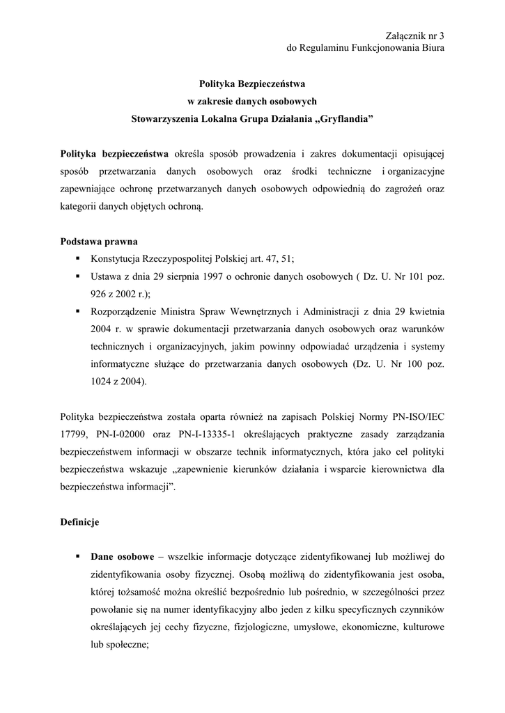 Załącznik nr 3 do Regulaminu Funkcjonowania Biura Polityka Bezpieczeństwa w zakresie danych osobowych Stowarzyszenia Lokalna Grupa Działania ,,Gryflandia” Polityka bezpieczeństwa określa sposób prowadzenia i zakres dokumentacji opisującej sposób przetwarzania danych osobowych oraz środki techniczne i organizacyjne zapewniające ochronę przetwarzanych danych osobowych odpowiednią do zagrożeń oraz kategorii danych objętych ochroną. Podstawa prawna Konstytucja Rzeczypospolitej Polskiej art. 47, 51; Ustawa z dnia 29 sierpnia 1997 o ochronie danych osobowych ( Dz. U. Nr 101 poz. 926 z 2002 r.); Rozporządzenie Ministra Spraw Wewnętrznych i Administracji z dnia 29 kwietnia 2004 r. w sprawie dokumentacji przetwarzania danych osobowych oraz warunków technicznych i organizacyjnych, jakim powinny odpowiadać urządzenia i systemy informatyczne służące do przetwarzania danych osobowych (Dz. U. Nr 100 poz. 1024 z 2004). Polityka bezpieczeństwa została oparta również na zapisach Polskiej Normy PN-ISO/IEC 17799, PN-I-02000 oraz PN-I-13335-1 określających praktyczne zasady zarządzania bezpieczeństwem informacji w obszarze technik informatycznych, która jako cel polityki bezpieczeństwa wskazuje „zapewnienie kierunków działania i wsparcie kierownictwa dla bezpieczeństwa informacji”. Definicje Dane osobowe – wszelkie informacje dotyczące zidentyfikowanej lub możliwej do zidentyfikowania osoby fizycznej. Osobą możliwą do zidentyfikowania jest osoba, której tożsamość można określić bezpośrednio lub pośrednio, w szczególności przez powołanie się na numer identyfikacyjny albo jeden z kilku specyficznych czynników określających jej cechy fizyczne, fizjologiczne, umysłowe, ekonomiczne, kulturowe lub społeczne; Zbiór danych osobowych - każdy posiadający strukturę zestaw danych o charakterze osobowym, dostępnych według określonych kryteriów, niezależnie od tego, czy zestaw ten jest rozproszony (jego części znajdują się w różnych miejscach) lub podzielony funkcjonalnie (przetwarzany za pomocą programów realizujących różne funkcje); Przetwarzanie danych osobowych – jakiekolwiek operacje wykonywane na danych osobowych, takie jak zbieranie, utrwalanie, przechowywanie, opracowywanie, zmienianie, udostępnianie i usuwanie; zwłaszcza takie, które wykonuje się w systemach informatycznych; System informatyczny – system przetwarzania informacji wraz ze związanymi z nimi ludźmi oraz zasobami technicznymi i finansowymi, który dostarcza i rozprowadza informacje. Systemem informatycznym jest również system, w którym nie ma żadnego komputera, a wyłącznie dokumenty papierowe, skoroszyty oraz ludzie tam pracujący, wyposażenie pokoi, czy też organizacja pracy. Ochronie podlegają nie tylko informacje osobowe, ale także ludzie, zasoby techniczne i finansowe; Bezpieczeństwo systemu informatycznego – wdrożenie stosownych środków administracyjnych, technicznych i fizycznych w celu zabezpieczenia zasobów technicznych oraz ochrony przed nieuprawnionym przetwarzaniem danych; Administrator Danych Osobowych (ADO) – organ, jednostka organizacyjna, podmiot lub osoba decydująca o celach i środkach przetwarzania danych osobowych. Administratorem danych jest Przewodniczący Zarządu, który ponosi pełnię odpowiedzialności wynikającej z przepisów ustawy o ochronie danych osobowych w odniesieniu do zbiorów danych osobowych znajdujących się w jego ustawowej dyspozycji; Administrator Bezpieczeństwa Informacji (ABI) – należy przez to rozumieć pracownika Stowarzyszenia wyznaczonego przez Administratora Danych Osobowych do wdrażania oraz nadzorowania przestrzegania zasad ochrony oraz wymagań w zakresie ochrony, wynikających z powszechnie obowiązujących przepisów o ochronie danych osobowych; Administrator Systemów Informatycznych (ASI) – należy przez to rozumieć pracownika lub pracowników informatyki odpowiedzialnych za stosowanie technicznych i organizacyjnych środków ochrony danych osobowych przetwarzanych w systemie informatycznym; Osoba upoważniona lub użytkownik systemu – osoba posiadająca upoważnienie wydane przez ADO lub osoba uprawniona przez niego do przetwarzania danych osobowych w systemie informatycznym w zakresie wskazanym w upoważnieniu, zwana dalej użytkownikiem; Osoba uprawniona – osoba posiadająca uprawnienie wydane przez ADO na mocy którego wykonuje w jego imieniu określone czynności; Sieć Lokalna (LAN Local Area Network) – Lokalna sieć teleinformatyczna; Sieć rozległa (WAN) – Rozległa sieć teleinformatyczna; Identyfikator użytkownika (LOGIN) – ciąg znaków literowych i cyfrowych, lub innych, jednoznacznie identyfikujących osobę upoważnioną do przetwarzania danych osobowych w systemie informatycznym; Hasło (Password)– ciąg znaków literowych cyfrowych lub innych, znany jedynie osobie upoważnionej do pracy w systemie informatycznym; Zalogowanie – uwierzytelnienie czyli działanie, którego celem jest weryfikacja deklarowanej tożsamości podmiotu; Odbiorcy danych – rozumie się przez to każdego, komu udostępnia się dane osobowe, z wyłączeniem: osoby, której dane dotyczą, osoby, upoważnionej do przetwarzania danych, przedstawiciela, o którym mowa w art. 31a ustawy o ochronie danych osobowych, podmiotu, o którym mowa w art. 31 ustawy o ochronie danych osobowych, organów państwowych lub organów samorządu terytorialnego, którym dane są udostępniane w związku z prowadzonym postępowaniem. Cele Celem wdrożenia polityki bezpieczeństwa jest ochrona systemu informatycznego jako całości, jego poszczególnych elementów, przetwarzanych przez system zbiorów danych, obszaru, w którym przetwarzane są dane osobowe, a przede wszystkim zapewnienie technicznych i organizacyjnych uwarunkowań mających wpływ na zarządzanie systemami informatycznymi, w których przetwarzane są dane osobowe. Niniejsza polityka bezpieczeństwa zawiera: 1) wykaz budy
