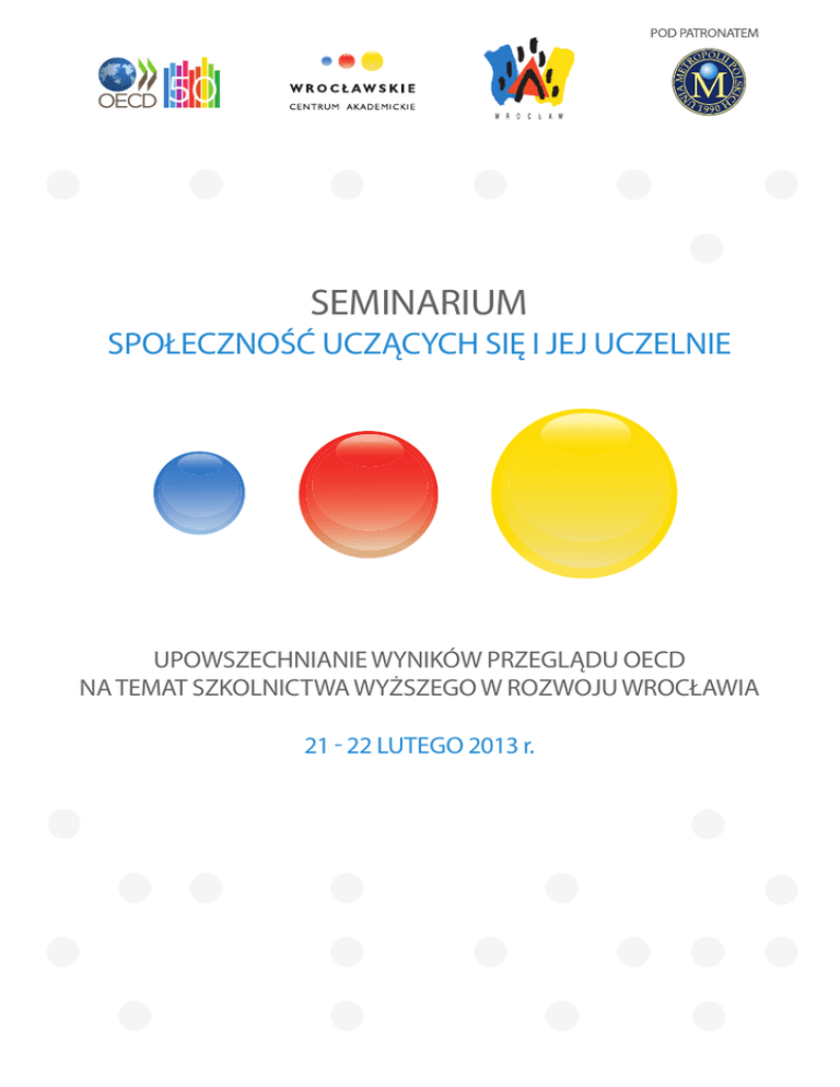 SEMINARIUM SPOŁECZNOŚĆ UCZĄCYCH SIĘ I JEJ UCZELNIE UPOWSZECHNIANIE WYNIKÓW PRZEGLĄDU OECD NA TEMAT SZKOLNICTWA WYŻSZEGO W ROZWOJU WROCŁAWIA 21 - 22 LUTEGO 2013 r. BLOK 1: WROCŁAW I JEGO UNIWERSYTETY DZIŚ | 21 LUTEGO 2013 r. ORGANIZATORZY Miasto Wrocław i Organizacja Współpracy Gospodarczej i Rozwoju (OECD) 14:00 - 14:20 MIEJSCE KONFERENCJI JĘZYKI KONFERENCJI Sala Sesyjna Rady Miejskiej Wrocławia Seminarium odbywać się będzie w języku polskim i angielskim POWITANIE UCZESTNIKÓW Dr Rafał Dutkiewicz, Prezydent Wrocławia Prof. Daria Lipińska-Nałęcz, Podsekretarz Stanu, Ministerstwo Nauki i Szkolnictwa Wyższego Prof. Roman Kołacz, Rektor Uniwersytetu Przyrodniczego we Wrocławiu; Przewodniczący Kolegium Rektorów Uczelni Wrocławia, Opola i Zielonej Góry 21 LUTEGO 2013 r. | BLOK 1: WROCŁAW I JEGO UNIWERSYTETY DZIŚ 14:20 - 15:50 SESJA 1 Niezwykły dorobek i zwykłe wyzwania? Wrocław na tle krajowym i regionalnym »Jakie są najważniejsze wyniki Przeglądu? »Wyzwania i szanse »Jakie charakterystyczne cechy/potencjał można wykorzystać do stworzenia przewagi konkurencyjnej w szkolnictwie wyższym i regionalnej gospodarce? »Co wynika z Przeglądu, jeśli chodzi o praktyczne kroki, jakie można podjąć, aby zmierzyć się ze “skrzywieniem akademickim” oraz “niedostateczną różnorodnością misji” szkolnictwa wyższego w Polsce? Moderator: Prof. Tadeusz Luty, Doradca Prezydenta Wrocławia ds. Współpracy z Uczelniami Wyższymi 15:5 0 - 16:20 15:50 - 16:20 Paneliści: Jaana Puukka, Lider Przeglądu, OECD Prof. Daria Lipińska-Nałęcz, Podsekretarz Stanu, Ministerstwo Nauki i Szkolnictwa Wyższego Prof. Wiesław Banyś, Rektor Uniwersytetu Śląskiego w Katowicach; Przewodniczący Konferencji Rektorów Akademickich Szkół Polskich PRZERWA KAWOWA BLOK 2: WROCŁAW I JEGO UNIWERSYTETY JUTRO | 22 LUTEGO 2013 r. 16:20 - 17:20 SESJA 2 Szkolnictwo wyższe i rozwój miast 20 lat po transformacji w Polsce »Połączenie polityki szkolnictwa wyższego i polityki rozwoju regionalnego (perspektywa S3) »Czy da się pokonać bariery integracji metropolii z ich zapleczem? »Wyzwania związane z finansowaniem unijnym (decyzje i strategie oparte na danych, trwałość projektów, paradoksy związane z dodatkowymi źródłami finansowania) »Rola organizacji pośrednich: eksperci od rozwiązywania problemów czy darmozjady? Moderator: Prof. Jerzy Langer, Prezes Zarządu, Wrocławskie Centrum Badań EIT+ Sp. z o.o. Paneliści: Patrick Amblard, Dyrektor Wydziału ds. Polski, Dyrekcja Generalna ds. Polityki Regionalnej i Miejskiej Komisji Europejskiej Marcin Łata, Dyrektor Departamentu Zarządzania Programami Konkurencyjności i Innowacyjności, Ministerstwo Rozwoju Regionalnego Prof. Andrzej Łoś, Doradca Unii Metropolii Polskich Maciej Litwin, Dyrektor, Wrocławskie Centrum Akademickie 18:00 KOLACJA | Ratusz, Rynek 1, Wrocław 22 LUTEGO 2013 r. | BLOK 2: WROCŁAW I JEGO UNIWERSYTETY JUTRO 9:00 - 9:30 WYKŁAD 16:20 - 17:20 Przywództwo strategiczne uniwersytetów w XXI wieku: jak sensownie podejść do społeczeństwa opartego na wiedzy? Prof. Georg Winckler, Uniwersytet Wiedeński Wprowadzenie: Prof. Tadeusz Luty, Doradca Prezydenta Wrocławia ds. Współpracy z Uczelniami Wyższymi 9:30 - 10:30 SESJA 3 Kultura i kreatywność jako siła napędowa rozwoju »„Creative spill-over”: jaka rola dla uczelni? »Produkty edukacyjne na styku instytucji: czego potrzebuje klasa kreatywna? »Kreatywne jednostki: jak szkolnictwo wyższe może lepiej przygotować je do drogi zawodowej otwartej na ryzyko? 18:00 9:00 - 9:30 Moderator: Prof. Jacek Szewczyk, Akademia Sztuk Pięknych we Wrocławiu Paneliści: Jarosław Obremski, Senator RP; Przewodniczący Rady Programowej ds. Europejskiej Stolicy Kultury 2016 Krzysztof Czyżewski, Dyrektor Artystyczny, Wrocław - Europejska Stolica Kultury 2016 Jakub Jernajczyk, Akademia Młodych Uczonych i Artystów BLOK 2: WROCŁAW I JEGO UNIWERSYTETY JUTRO | 22 LUTEGO 2013 r. 10:30 - 10:45 PRZERWA KAWOWA 10:45 - 11:45 SESJA 4 Wszyscy na pokład! Co może dać szkolnictwo wyższe rozwojowi społecznemu i rewitalizacji »Edukacja i badania zrośnięte z tkanką miasta: » Uniwersytety a lokalne cele polityki » Uniwersytety i trzeci sektor »Polityka międzysektorowa i potrzeba integracji instytucji kształcenia Moderator: Maciej Litwin, Dyrektor, Wrocławskie Centrum Akademickie 10:30 - 10:45 1 11:45 - 13:15 Paneliści: Dr Kamila Kamińska, Uniwersytet Wrocławski; Dyrektor, Centrum Zrównoważonego Rozwoju Społeczności Wrocławia Prof. Bohdan Aniszczyk, Przewodniczący, Komisja Edukacji i Młodzieży Rady Miejskiej Wrocławia Maciej Zarański, Asystent Prorektora ds. Rozwoju Uczelni, Uniwersytet Przyrodniczy we Wrocławiu Anna Szarycz, Dyrektor, Wydział Zdrowia i Spraw Społecznych, Urząd Miejski Wrocławia SESJA 5 Różnorodność doświadczeń edukacyjnych i rosnące zróżnicowanie odbiorców »Strategie międzynarodowe jutro: rozwój marki a rozwój produktu » „Koniec świata!” Czy niesprzyjające trendy demograficzne są szansą, aby zwiększyć efektywność i jakość zarządzania strategicznego i edukacji oferowanej przez uczelnie? Strategie uczenia się przez całe życie »Więcej uprawnień dla kadry zarządzającej na uczelniach: warunek konieczny dla większej efektywności? »Mobilność: biznes-uczelnie; uczelnie-biznes 11:45 - 13:15 Moderator: Prof. Bogusław Fiedor, Prorektor ds. Współpracy z Zagranicą, Uniwersytet Ekonomiczny we Wrocławiu Paneliści: Dr Sebastian Płóciennik, Uniwersytet Wrocławski Maria Hryceniak, Koordynator Projektu „Teraz Wrocław”, Uniwersytet Ekonomiczny we Wrocławiu Agnieszka Orłowska, Prezes, Globalne Centrum Biznesowe HP we Wrocławiu Dr hab. Aldona Wiktorska-Święcka, Business Centre Club; Prezes, Polish Governance Institute 13:15 - 13:30 SESJA ZAMYKAJĄCA Prof. Tadeusz Luty, Doradca Prezydenta Wrocławia ds. Współpracy z Uczelniami Wyższymi Maciej Litwin, Dyrektor, Wrocła