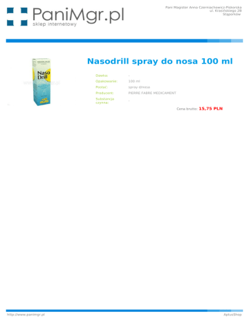 Pani Magister Anna Czerniachowicz-Piskorska ul. Krasińskiego 2B Stąporków Nasodrill spray do nosa 100 ml Dawka: - Opakowanie: 100 ml Postać: spray d/nosa Producent: PIERRE FABRE MEDICAMENT Substancja czynna: Cena brutto: http://www.panimgr.pl 15,75 PLN AptusShop