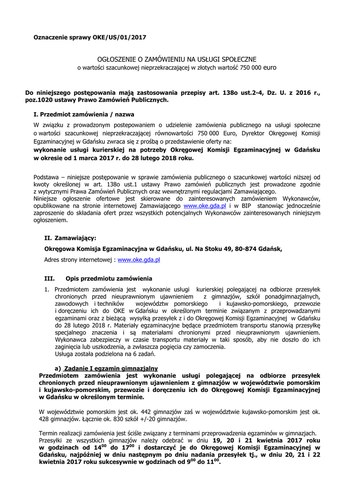 Oznaczenie sprawy OKE/US/01/2017 OGŁOSZENIE O ZAMÓWIENIU NA USŁUGI SPOŁECZNE o wartości szacunkowej nieprzekraczającej w złotych wartość 750 000 euro Do niniejszego postępowania mają zastosowania przepisy art. 138o ust.2-4, Dz. U. z 2016 r., poz.1020 ustawy Prawo Zamówień Publicznych. I. Przedmiot zamówienia / nazwa W związku z prowadzonym postepowaniem o udzielenie zamówienia publicznego na usługi społeczne o wartości szacunkowej nieprzekraczającej równowartości 750 000 Euro, Dyrektor Okręgowej Komisji Egzaminacyjnej w Gdańsku zwraca się z prośbą o przedstawienie oferty na: wykonanie usługi kurierskiej na potrzeby Okręgowej Komisji Egzaminacyjnej w Gdańsku w okresie od 1 marca 2017 r. do 28 lutego 2018 roku. Podstawa – niniejsze postępowanie w sprawie zamówienia publicznego o szacunkowej wartości niższej od kwoty określonej w art. 138o ust.1 ustawy Prawo zamówień publicznych jest prowadzone zgodnie z wytycznymi Prawa Zamówień Publicznych oraz wewnętrznymi regulacjami Zamawiającego. Niniejsze ogłoszenie ofertowe jest skierowane do zainteresowanych zamówieniem Wykonawców, opublikowane na stronie internetowej Zamawiającego www.oke.gda.pl i w BIP stanowiąc jednocześnie zaproszenie do składania ofert przez wszystkich potencjalnych Wykonawców zainteresowanych niniejszym ogłoszeniem. II. Zamawiający: Okręgowa Komisja Egzaminacyjna w Gdańsku, ul. Na Stoku 49, 80-874 Gdańsk, Adres strony internetowej : www.oke.gda.pl III. Opis przedmiotu zamówienia 1. Przedmiotem zamówienia jest wykonanie usługi kurierskiej polegającej na odbiorze przesyłek chronionych przed nieuprawnionym ujawnieniem z gimnazjów, szkół ponadgimnazjalnych, zawodowych i techników województw pomorskiego i kujawsko-pomorskiego, przewozie i doręczeniu ich do OKE w Gdańsku w określonym terminie związanym z przeprowadzanymi egzaminami oraz z bieżącą wysyłką przesyłek z i do Okręgowej Komisji Egzaminacyjnej w Gdańsku do 28 lutego 2018 r. Materiały egzaminacyjne będące przedmiotem transportu stanowią przesyłkę specjalnego znaczenia i są materiałami chronionymi przed nieuprawnionym ujawnieniem. Wykonawca zabezpieczy w czasie transportu materiały w taki sposób, aby nie doszło do ich zaginięcia lub uszkodzenia, a zwłaszcza pogięcia czy zamoczenia. Usługa została podzielona na 6 zadań. a) Zadanie I egzamin gimnazjalny Przedmiotem zamówienia jest wykonanie usługi polegającej na odbiorze przesyłek chronionych przed nieuprawnionym ujawnieniem z gimnazjów w województwie pomorskim i kujawsko-pomorskim, przewozie i doręczeniu ich do Okręgowej Komisji Egzaminacyjnej w Gdańsku w określonym terminie. W województwie pomorskim jest ok. 442 gimnazjów zaś w województwie kujawsko-pomorskim jest ok. 428 gimnazjów. Łącznie ok. 830 szkół +/-20 gimnazjów. Termin realizacji zamówienia jest ściśle związany z terminami przeprowadzenia egzaminów w gimnazjach. Przesyłki ze wszystkich gimnazjów należy odebrać w dniu 19, 20 i 21 kwietnia 2017 roku w godzinach od 1400 do 1700 i dostarczyć je do Okręgowej Komisji Egzaminacyjnej w Gdańsku, najpóźniej w dniu następnym po dniu nadania przesyłek tj., w dniu 20, 21 i 22 kwietnia 2017 roku sukcesywnie w godzinach od 900 do 1100. 2 Zamawiający wymaga dostarczenie przesyłek najpóźniej w dniu następnym po dniu nadania oraz żeby pierwsza partia dostawy przesyłek rozpoczęła się najpóźniej o godz. 9:00 w dniu następnym po dniu nadania. Spis miejscowości , w których znajdują się szkoły gimnazjalne stanowi załącznik nr 6 do niniejszego ogłoszenia. Szacunkowa ilość wszystkich przesyłek wynosi ok. 2610 szt. +/-20 szt. Szacunkowa waga przesyłek każdego dnia wynosi: - do 5,0 kg , ok. 300 szt. - od 5,0 do 10,0 kg ok. 210 szt. - od 10,0 do 20,0 kg ok. 310 szt. - od 20,0 do 30,0 kg ok. 30 szt. - od 30,0 do 50,0 kg ok. 20 szt. w tym szacunkowa ilość przesyłek dostarczonych w sobotę wynosi: - do 5,0 kg , ok. 300 szt. - od 5,0 do 10,0 kg ok. 210 szt. - od 10,0 do 20,0 kg ok. 300 szt. - od 20,0 do 30,0 kg ok. 30 szt. - od 30,0 do 50,0 kg ok. 10 szt. Sposób zapakowania przesyłek - kartonowe pudełka, ewentualnie koperty zabezpieczone przez indywidualnych nadawców (szkoły). Wykonawca przygotowuje nalepki adresowe, na podstawie dostarczonych do dnia 7 kwietnia 2017 r. danych przez Zamawiającego. Nalepki adresowe dostarczone zostaną do szkół przez Wykonawcę rano w dniu 19 kwietnia 2017 r. b) Zadanie II egzamin maturalny Przedmiotem zamówienia jest : wykonanie usługi odbioru przesyłek z materiałami chronionymi przed nieuprawnionym ujawnieniem ze szkół/zespołów ponadgimnazjalnych na obszarze województw pomorskiego i kujawsko-pomorskiego, przewóz przesyłek z materiałami egzaminacyjnymi w samochodach zabezpieczonych przed dostępem osób nieuprawnionych dostarczenie przesyłek z materiałami egzaminacyjnymi do Okręgowej Komisji Egzaminacyjnej w Gdańsku w określonych terminach. W województwie pomorskim jest ok. 320 szkół/zespołów ponadgimnazjalnych, zaś w województwie kujawsko-pomorskim są ok. 320 szkoły/zespoły ponadgimnazjalne. Łącznie ok. 640 szkół/zespołów ponadgimnazjalnych (+/-10 szkół/zespołów ponadgimnazjalnych). Przesyłki ze szkół/zespołów ponadgimnazjalnych należy odebrać w dniach: 4, 5, 9, 12, 18 maja 2017r. w godzinach od 13:30 do 18:00 oraz 25 maja 2017r. w godzinach od 10:00 do 14:00 i dostarczyć w dniach następnych po każdym odbiorze tj. 5, 6, 10, 13, 19 i 26 maja 2017r. w godzinach od 9:00 do 11:00 do Okręgowej Komisji Egzaminacyjnej w Gdańsku. Zamawiający wymaga dostarczenie przesyłek najpóźniej w dniu następnym po dniu nadania oraz żeby pierwsza partia dostawy przesyłek rozpoczęła się najpóźniej o godz. 9:00 w dniu następnym po dniu nadania . Spis miejscowości, w których znajdują się szkoły/zespoły ponadgimnazjalne objęte Zadaniem II stanowi załącznik nr 6 do niniejszego ogłoszenia. Szacunkowa wag