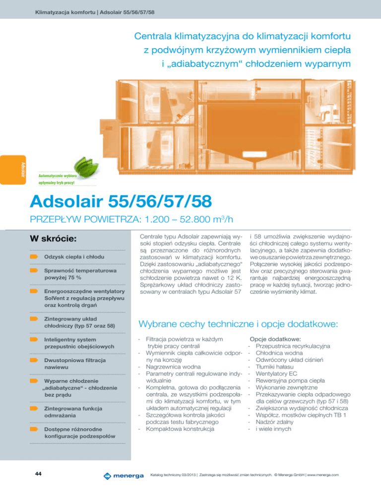 Klimatyzacja komfortu | Adsolair 55/56/57/58 Centrala klimatyzacyjna do klimatyzacji komfortu z podwójnym krzyżowym wymiennikiem ciepła i „adiabatycznym“ chłodzeniem wyparnym Adsolair Automatycznie wybiera optymalny tryb pracy! Adsolair 55/56/57/58 Przepływ powietrza: 1.200 – 52.800 m3/h W skrócie: Odzysk ciepła i chłodu Sprawność temperaturowa powyżej 75 % Energooszczędne wentylatory SolVent z regulacją przepływu oraz kontrolą drgań Zintegrowany układ chłodniczy (typ 57 oraz 58) Inteligentny system przepustnic obejściowych Dwustopniowa filtracja nawiewu Wyparne chłodzenie „adiabatyczne“ - chłodzenie bez prądu Zintegrowana funkcja odmrażania Dostępne różnorodne konfiguracje podzespołów 44 Centrale typu Adsolair zapewniają wysoki stopień odzysku ciepła. Centrale są przeznaczone do różnorodnych zastosowań w klimatyzacji komfortu. Dzięki zastosowaniu „adiabatycznego“ chłodzenia wyparnego możliwe jest schłodzenie powietrza nawet o 12 K. Sprężarkowy układ chłodniczy zastosowany w centralach typu Adsolair 57 i 58 umożliwia zwiększenie wydajności chłodniczej całego systemu wentylacyjnego, a także zapewnia dodatkowe osuszanie powietrza zewnętrznego. Połączenie wysokiej jakości podzespołów oraz precyzyjnego sterowania gwarantuje najbardziej energooszczędną pracę w każdej sytuacji, tworząc jednocześnie wyśmienity klimat. Wybrane cechy techniczne i opcje dodatkowe: - Filtracja powietrza w każdym trybie pracy centrali -Wymiennik ciepła całkowicie odporny na korozję - Nagrzewnica wodna - Parametry centrali regulowane indywidualnie - Kompletna, gotowa do podłączenia centrala, ze wszystkimi podzespołami do klimatyzacji komfortu, w tym układem automatycznej regulacji - Szczegółowa kontrola jakości podczas testu fabrycznego - Kompaktowa konstrukcja Opcje dodatkowe: - Przepustnica recyrkulacyjna - Chłodnica wodna -Odwrócony układ ciśnień -Tłumiki hałasu -Wentylatory EC -Rewersyjna pompa ciepła -Wykonanie zewnętrzne - Przekazywanie ciepła odpadowego dla celów grzewczych (typ 57 i 58) -Zwiększona wydajność chłodnicza -Współcz. mostków cieplnych TB 1 - Nadzór zdalny - i wiele innych Katalog techniczny 03/2013 | Zastrzega się możliwość zmian technicznych. © Menerga GmbH | www.menerga.com Klimatyzacja komfortu | Adsolair 55/56/57/58 (+) K (-) POW. NAWIEW ZEWN. POW. USUW. (+) WYWIEW (+) * K (-) POW. NAWIEW ZEWN. Tryb letni Jeśli temperatura zewnętrzna będzie wyższa niż temperatura wywiewu, centrala przełączy się w wysoce efektywny tryb odzy- sku chłodu. Gorące powietrze zewnętrzne jest wstępnie schładzane przez powietrze wywiewane. Adsolair WYWIEW (+) pustnice obejściowe pozwalają zmniejszyć odzysk ciepła, aby uzyskać żądaną temperaturę nawiewu. nika ciepła gwarantuje obniżenie oporów przepływu przez centralę, a co za tymidzie niskie zużycie energii elektrycznej przez wentylatory. Ogrzewanie w recyrkulacji* W trybie recyrkulacji przepustnice powietrza zewnętrznego i usuwanego są zamknięte. Powietrze obiegowe ogrzewane jest za pośrednictwem nagrzewnicy wodnej. Ogrzewanie w recyrkulacji przydatne jest do szybkiego rozgrzania * POW. USUW. Free cooling Wraz z dalszym wzrostem temperatury zewnętrznej, przepustnice obejściowe otwierają się całkowicie i odzysk ciepła ustaje. Zastosowanie przepustnic obejściowych po obu stronach wymien- Pośrednie „adiabatyczne“ chłodzenie wyparne W centralach typu Adsolair wykorzystano zalety pośredniego „adiabatycznego“ chłodzenia wyparnego, unikając jednocześnie niekorzystnego nawilżania powietrza nawiewanego. Istotnym elementem rozwiązania Adsolair jest podwójny krzyżowy wymiennik ciepła, w których powietrze wywiewane chłodzone jest „adiabatyczne“. Po drugiej stronie wymiennika powietrze zewnętrzne odbiera chłód od schłodzonego i (+) (+) * K (-) POW. NAWIEW ZEWN. POW. USUW. (+) WYWIEW (+) * K (-) POW. NAWIEW ZEWN. POW. USUW. WYWIEW (+) Okres przejściowy Wraz ze wzrostem temperatury zewnętrznej spada zapotrzebowanie na odzysk ciepła. Zainstalowane prze- ciepła jest chwilowo zredukowany. Wymiennik jest rozmrażany dzięki ciepłu pochodzącemu z powietrza zewnętrznego. Proces rozmrażania jest regulowany zmienną ilością powietrza zewnętrznego omijającego wymiennik. POW. USUW. WYWIEW (+) * K (-) POW. NAWIEW ZEWN. POW. USUW. WYWIEW nawilżonego powietrza wywiewanego. Wysoka efektywność procesu chłodzenia wynika z faktu, że obydwa procesy („adiabatyczne“ chłodzenie wyparne oraz schładzanie powietrza zewnętrznego) odbywają się w tym samym miejscu. Dzięki wysokiej sprawności odzysku ciepła, powietrze zewnętrzne może schłodzić się nawet o 12K. W razie potrzeby powietrze jest dalej ochładzane przy użyciu parownika. (+) Tryb rozmrażania Z wysokim odzyskiem ciepła wiąże się konieczność zabezpieczenia wymiennika ciepła przed zamarzaniem. W trybie rozmrażania otwiera się bypass powietrza zewnętrznego, a strumień powietrza zewnętrznego płynący przez wymiennik Praca w zimie W okresie niskich temperatur zewnętrznych centrala pracuje w trybie odzysku ciepła, przy pełnym przepływie powietrza. Nagrzewnica wodna, standardowo montowana w centrali, zapewnia pokrycie strat ciepła przez przegrody pomieszczenia i strat wentylacyjnych. (+) * K (-) POW. NAWIEW ZEWN. POW. USUW. okresowo używanych pomieszczeń, takich jak sale konferencyjne lub sportowe. WYWIEW (+) Opis funkcji (+) NAWIEW * K (-) POW. ZEWN. * konieczna przepustnica recyrkulacyjna (wyposażenie dodatkowe) Katalog techniczny 03/2013 | Zastrzega się możliwość zmian technicznych. © Menerga GmbH | www.menerga.com 45