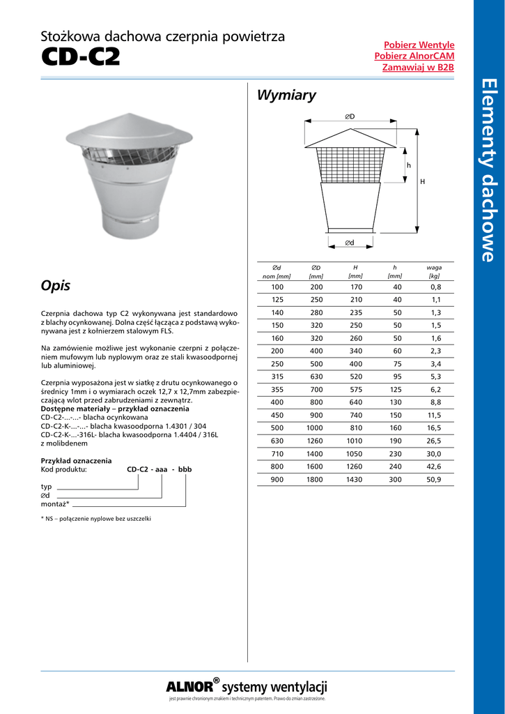Stożkowa dachowa czerpnia powietrza Pobierz Wentyle Pobierz AlnorCAM Zamawiaj w B2B CD-C2 Elementy dachowe Wymiary D h H d Opis d nom [mm] D [mm] H [mm] h [mm] waga [kg] 100 200 170 40 0,8 125 250 210 40 1,1 Czerpnia dachowa typ C2 wykonywana jest standardowo z blachy ocynkowanej. Dolna część łącząca z podstawą wykonywana jest z kołnierzem stalowym FLS. 140 280 235 50 1,3 150 320 250 50 1,5 160 320 260 50 1,6 Na zamówienie możliwe jest wykonanie czerpni z połączeniem mufowym lub nyplowym oraz ze stali kwasoodpornej lub aluminiowej. 200 400 340 60 2,3 250 500 400 75 3,4 315 630 520 95 5,3 355 700 575 125 6,2 400 800 640 130 8,8 Czerpnia wyposażona jest w siatkę z drutu ocynkowanego o średnicy 1mm i o wymiarach oczek 12,7 x 12,7mm zabezpieczającą wlot przed zabrudzeniami z zewnątrz. Dostępne materiały – przykład oznaczenia CD-C2-...-...- blacha ocynkowana CD-C2-K-...-...- blacha kwasoodporna 1.4301 / 304 CD-C2-K-...-316L- blacha kwasoodporna 1.4404 / 316L z molibdenem Przykład oznaczenia Kod produktu: CD-C2-aaa - bbb typ d montaż* 450 900 740 150 11,5 500 1000 810 160 16,5 630 1260 1010 190 26,5 710 1400 1050 230 30,0 800 1600 1260 240 42,6 900 1800 1430 300 50,9 * NS – połączenie nyplowe bez uszczelki http://www.alnor.com.pl/produkty_pl/podstawy-i-czerpnie-dachowe.html ALNOR® systemy wentylacji jest prawnie chronionym znakiem i technicznym patentem. Prawo do zmian zastrzeżone.