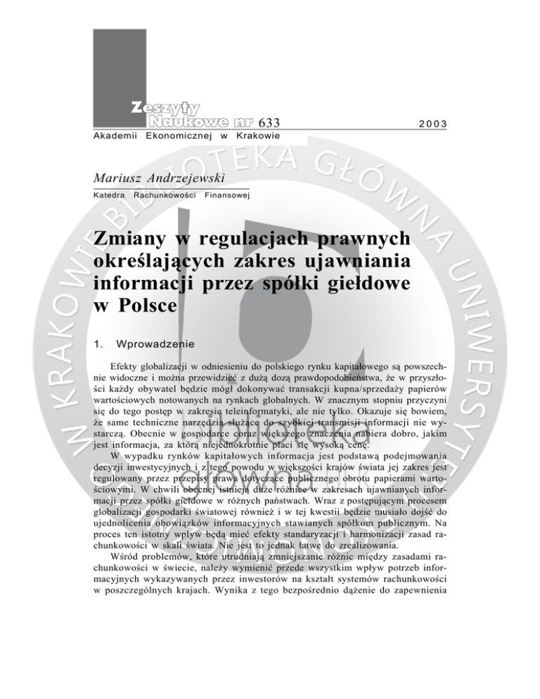 633 2003 Akademii Ekonomicznej w Krakowie Mariusz Andrzejewski Katedra Rachunkowoœci Finansowej Zmiany w regulacjach prawnych okreœlaj¹cych zakres ujawniania informacji przez spó³ki gie³dowe w Polsce 1. Wprowadzenie Efekty globalizacji w odniesieniu do polskiego rynku kapita³owego s¹ powszechnie widoczne i mo¿na przewidzieæ z du¿¹ doz¹ prawdopodobieñstwa, ¿e w przysz³oœci ka¿dy obywatel bêdzie móg³ dokonywaæ transakcji kupna/sprzeda¿y papierów wartoœciowych notowanych na rynkach globalnych. W znacznym stopniu przyczyni siê do tego postêp w zakresie teleinformatyki, ale nie tylko. Okazuje siê bowiem, ¿e same techniczne narzêdzia s³u¿¹ce do szybkiej transmisji informacji nie wystarcz¹. Obecnie w gospodarce coraz wiêkszego znaczenia nabiera dobro, jakim jest informacja, za któr¹ niejednokrotnie p³aci siê wysok¹ cenê. W wypadku rynków kapita³owych informacja jest podstaw¹ podejmowania decyzji inwestycyjnych i z tego powodu w wiêkszoœci krajów œwiata jej zakres jest regulowany przez przepisy prawa dotycz¹ce publicznego obrotu papierami wartoœciowymi. W chwili obecnej istniej¹ du¿e ró¿nice w zakresach ujawnianych informacji przez spó³ki gie³dowe w ró¿nych pañstwach. Wraz z postêpuj¹cym procesem globalizacji gospodarki œwiatowej równie¿ i w tej kwestii bêdzie musia³o dojœæ do ujednolicenia obowi¹zków informacyjnych stawianych spó³kom publicznym. Na proces ten istotny wp³yw bêd¹ mieæ efekty standaryzacji i harmonizacji zasad rachunkowoœci w skali œwiata. Nie jest to jednak ³atwe do zrealizowania. Wœród problemów, które utrudniaj¹ zmniejszanie ró¿nic miêdzy zasadami rachunkowoœci w œwiecie, nale¿y wymieniæ przede wszystkim wp³yw potrzeb informacyjnych wykazywanych przez inwestorów na kszta³t systemów rachunkowoœci w poszczególnych krajach. Wynika z tego bezpoœrednio d¹¿enie do zapewnienia 8 6 Mariusz Andrzejewski porównywalnoœci danych zawartych w sprawozdaniach finansowych spó³ek notowanych na ró¿nych gie³dach œwiata. Jest to jednoczeœnie g³ówne zadanie miêdzynarodowych organizacji i instytucji bior¹cych czynny udzia³ w procesie standaryzacji zasad rachunkowoœci. Polska, d¹¿¹c do w³¹czenia siê w nurt globalnej gospodarki, dostrzega szansê i zagro¿enia wynikaj¹ce z koniecznoœci wprowadzenia zmian w systemie rachunkowoœci. Je¿eli sprawozdania finansowe polskich spó³ek gie³dowych bêd¹ zrozumia³e i ³atwe w interpretacji dla inwestorów nie tylko krajowych, ale tak¿e zagranicznych, to zapewne przyczyni siê to do dalszego rozwoju naszego rynku kapita³owego. Zmiany w polskich regulacjach prawnych, jakie zosta³y wprowadzone w ci¹gu ostatnich dwóch lat, niew¹tpliwie przybli¿¹ polski rynek kapita³owy do osi¹gniêcia tego celu. 2. Podstawy prawne ujawniania informacji przez spó³ki notowane na GPW w Warszawie 2.1. Kodeks spó³ek handlowych Do najwa¿niejszych aktów prawnych, maj¹cych bezpoœredni wp³yw na zakres ujawniania informacji przez spó³ki gie³dowe notowane na GPW w Warszawie, zaliczyæ nale¿y: – ustawê z dnia 15 wrzeœnia 2000 r. – Kodeks spó³ek handlowych1, – ustawê z dnia 29 wrzeœnia 1994 r. o rachunkowoœci2, – ustawê z dnia 21 sierpnia 1997 r. – Prawo o publicznym obrocie papierami wartoœciowymi. W 2000 r. nast¹pi³y zmiany w polskim prawodawstwie okreœlaj¹cym miêdzy innymi zasady dzia³ania spó³ek gie³dowych. Nowe regulacje w istotny sposób bêd¹ wp³ywaæ na zmiany w zakresie ujawniania informacji przez spó³ki gie³dowe. Zmiany w regulacjach dotycz¹cych spó³ek handlowych by³y od dawna oczekiwane. Kodeks spó³ek handlowych uwzglêdni³ wiele nowych sytuacji z ¿ycia gospodarczego tego typu jednostek, które powsta³y w ci¹gu ostatnich kilkunastu lat odradzania siê w Polsce gospodarki wolnorynkowej. Wybrane ró¿nice pomiêdzy rozwi¹zaniami zawartymi w kodeksie handlowym z 1934 r., a now¹ ustaw¹ – Kodeks spó³ek handlowych z dnia 15 wrzeœnia 2000 r. ilustruje tabela 1. Forma prawna spó³ki akcyjnej kojarzona jest w naszym spo³eczeñstwie z przedsiêbiorstwami najlepiej zorganizowanymi i rozwiniêtymi i czêsto budzi wiêksze zaufanie ni¿ inne typy spó³ek wystêpuj¹ce w Polsce. Niew¹tpliwie status spó³ki publicznej stanowi dla firm pewn¹ wartoœæ niematerialn¹ zwiêkszaj¹c¹ jej renomê. 1 Ustawa – Kodeks spó³ek handlowych zast¹pi³a z dniem 1 stycznia 2001 r. dotychczas obowi¹zuj¹cy kodeks handlowy z 1934 r. 2 Nowelizacja ustawy o rachunkowoœci, któr¹ Sejm i Senat uchwali³ w 2000 r. wprowadza wiele zmian w zakresie polskich zasad rachunkowoœci. Czêœæ nowych regulacji obowi¹zuje od 1 stycznia 2001 r., jednak wiêkszoœæ z nich zosta³a wprowadzona w ¿ycie 1 stycznia 2002 r. Zmiany w regulacjach prawnych... 8 7 Tabela 1. Wybrane ró¿nice i podobieñstwa pomiêdzy regulacjami prawnymi zawartymi w Kodeksie handlowym z 1934 r., a ustaw¹ – Kodeks spó³ek handlowych z 2000 r. Obszar zmian Kodeks handlowy z 1934 r. Kodeks spółek handlowych z 2000 r. Liczba osób mogących założyć spółkę akcyjną Art. 308 – Statut spółki akcyjnej powinien być sporządzony w formie aktu notarialnego pod rygorem nieważności. Osoby podpisujące statut są założycielami spółki. Założycieli powinno być trzech, z wyjątkiem gdy założycielem spółki jest Państwo lub związek samorządu terytorialnego. Art. 301, par. 1 – Zawiązać spółkę akcyjną może jedna albo więcej osób. Spółka akcyjna nie może być zawiązana wyłącznie przez jednoosobową spółkę ziograniczoną odpowiedzialnością. Minimalna wartość kapitału akcyjnego Art. 311, par. 1 – Kapitał akcyjny spółki powinien wynosić przynajmniej sto tysięcy złotych. Art. 308, par. 1 – Kapitał zakładowy spółki powinien wynosić co najmniej 500 000 złotych. A. Powstanie spółki B. Prawa i obowiązki akcjonariuszy Uprawnienia brak akcjonariuszy spółek publicznych Art. 328 [...] par. 6 – Ak