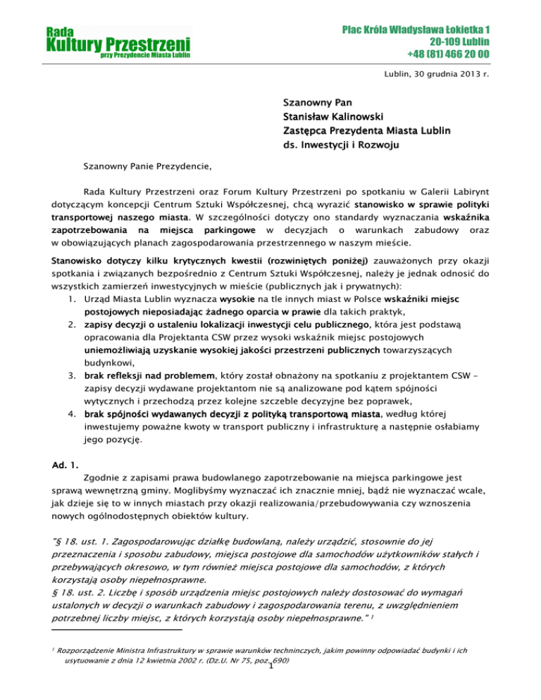 Plac Króla Władysława Łokietka 1 20-109 Lublin +48 (81) 466 20 00 Lublin, 30 grudnia 2013 r. Szanowny Pan Stanisław Kalinowski Zastępca Prezydenta Miasta Lublin ds. Inwestycji i Rozwoju Szanowny Panie Prezydencie, Rada Kultury Przestrzeni oraz Forum Kultury Przestrzeni po spotkaniu w Galerii Labirynt dotyczącym koncepcji Centrum Sztuki Współczesnej, chcą wyrazić stanowisko w sprawie polityki transportowej naszego miasta. miasta W szczególności dotyczy ono standardy wyznaczania wskaźnika zapotrzebowania na miejsca parkingowe w decyzjach o warunkach zabudowy oraz w obowiązujących planach zagospodarowania przestrzennego w naszym mieście. Stanowisko dotyczy kilku krytycznych kwestii (rozwiniętych poniżej) zauważonych przy okazji spotkania i związanych bezpośrednio z Centrum Sztuki Współczesnej, należy je jednak odnosić do wszystkich zamierzeń inwestycyjnych w mieście (publicznych jak i prywatnych): 1. Urząd Miasta Lublin wyznacza wysokie na tle innych miast w Polsce wskaźniki miejsc postojowych nieposiadając nieposiadając żadnego żadnego oparcia w prawie dla takich praktyk, 2. zapisy decyzji o ustaleniu lokalizacji inwestycji celu publicznego, publicznego która jest podstawą opracowania dla Projektanta CSW przez wysoki wskaźnik miejsc postojowych uniemożliwiają uzyskanie wysokiej jakości przestrzeni publicznych towarzyszących budynkowi, 3. brak refleksji nad problemem, problemem który został obnażony na spotkaniu z projektantem CSW – zapisy decyzji wydawane projektantom nie są analizowane pod kątem spójności wytycznych i przechodzą przez kolejne szczeble decyzyjne bez poprawek, 4. brak spójności wydawanych decyzji z polityką transportową miasta miasta, według której inwestujemy poważne kwoty w transport publiczny i infrastrukturę a następnie osłabiamy jego pozycję. Ad. 1. Zgodnie z zapisami prawa budowlanego zapotrzebowanie na miejsca parkingowe jest sprawą wewnętrzną gminy. Moglibyśmy wyznaczać ich znacznie mniej, bądź nie wyznaczać wcale, jak dzieje się to w innych miastach przy okazji realizowania/przebudowywania czy wznoszenia nowych ogólnodostępnych obiektów kultury. "§ 18. ust. 1. Zagospodarowując działkę budowlaną, należy urządzić, stosownie do jej przeznaczenia i sposobu zabudowy, miejsca postojowe dla samochodów użytkowników stałych i przebywających okresowo, w tym również miejsca postojowe dla samochodów, z których korzystają osoby niepełnosprawne. § 18. ust. 2. Liczbę i sposób urządzenia miejsc postojowych należy dostosować do wymagań ustalonych w decyzji o warunkach zabudowy i zagospodarowania terenu, z uwzględnieniem potrzebnej liczby miejsc, z których korzystają osoby niepełnosprawne." 1 1 Rozporządzenie Ministra Infrastruktury w sprawie warunków techninczych, jakim powinny odpowiadać budynki i ich usytuowanie z dnia 12 kwietnia 2002 r. (Dz.U. Nr 75, poz. 690) 1 Problem ten dotyczy również inwestycji prywatnych, tj. domów jednorodzinnych, budynków wielorodzinnych itp., gdzie wymagania te również są niewytłumaczalnie wysokie względem innych miast. Sytuacja ta zmienia się dopiero w opracowywanych obecnie miejscowych planach zagospodarowania przestrzennego, lecz plany te nie dotyczą obszarów centrum i śródmieścia, gdzie kwestia ta jest najważniejsza. Za przykład może posłużyć wspólna polityka transportowa prowadzona w Warszawie, gdzie w jednym dokumencie zawarto wskaźniki parkingowe oraz wstępne wytyczne na temat transportu alternatywnego (KM, rower, przejścia piesze), omijając w ten sposób oczekiwanie na MPZP – "(...) dokonano podziału miasta na 3 główne strefy różniące się: - stopniem uprzywilejowania transportu publicznego; - stopniem ograniczenia ruchu samochodów osobowych i ciężarowych; - wymaganiami dotyczącymi liczby miejsc parkingowych."2 Różnice pomiędzy strefami definiuje poniższa tabela: WARSZAWA – wskaźnik miejsc postojowych dla całego miasta STREFA BIURA I URZĘDY HANDEL I USŁUGI MIESZKANIA Il. miejsc / 1000 m2 pow. użytk. Il. miejsc / 1000 m2 pow. użytk. Il. miejsc / 1 mieszkanie 1A 0-5 0-10 1 1B 0-10 0-15 1 1C 10-15 15-25 1 2 18-30 25-38 1, lecz min. 1 na 60m2 mieszkania 3 25-30 30-60 1, lecz min. 1 na 60m2 mieszkania Co istotne, w dokumencie tym nie ma ustaleń dotyczących innych obiektów. Oznacza to zupełną dowolność (którą przewidział ustawodawca) w określaniu ilości miejsc postojowych obsługujących ogólnodostępny obiekt kulturalny3. W przypadku CSW po interwencji projektanta wymagania obniżono do 25 miejsc parkingowych na 1000 m2 pow. użytkowej budynku. Odnosząc to do skali obu miast przedmiotowy teren znalazłby się w warszawskiej strefie 1B, 1B gdzie widełki wskaźnika wahają się od 0 do 15 miejsc na 1000 m2 pow. użytkowej. Mamy zatem stosunek 0-15 : 25 (WWA : LBN). W tabelce widoczne są również wskaźniki dla budynków mieszkalnych – w warunkach lokalnych należałoby wprowadzić na stałe zapisy o miejscach postojowych dla rowerów, np równając wymagania ze stanowiskami parkingowymi dla samochodów. Monitorując rozwój ruchu rowerowego wskaźniki te można by zmieniać. Ad. 2. Posiłkując się wiedzą ze spotkania z Projektantem należy wspomnieć, iż pierwotna wersja zagospodarowania terenu była niezadowalająca ze względu na zbyt duży udział powierzchniowy parkingu względem przestrzeni publicznej przed budynkiem. Około ¾ najatrakcyjniejszego terenu w wyniku zapisów decyzji miało zostać zagospodarowane na parking. Jest to szczególnie kuriozalna sytuacja gdy przypomnimy, iż taki parking w tym miejscu już istniał i został zlikwidowany ze względów użytkowych oraz estetycznych jako początek dobrych przemian w tym miejscu, kiedy zaczęła działać tu instytucja kultury. 2 3 Fragment Uchwały Nr LXXXII/2746/2006 Rady Miasta Stołecznego Warszawy z 10.10.2006 r. Polska Klasyfikacja Obiektów Budowlanych (PKOB) wprowadzona rozporządzeniem Rady Ministrów z 