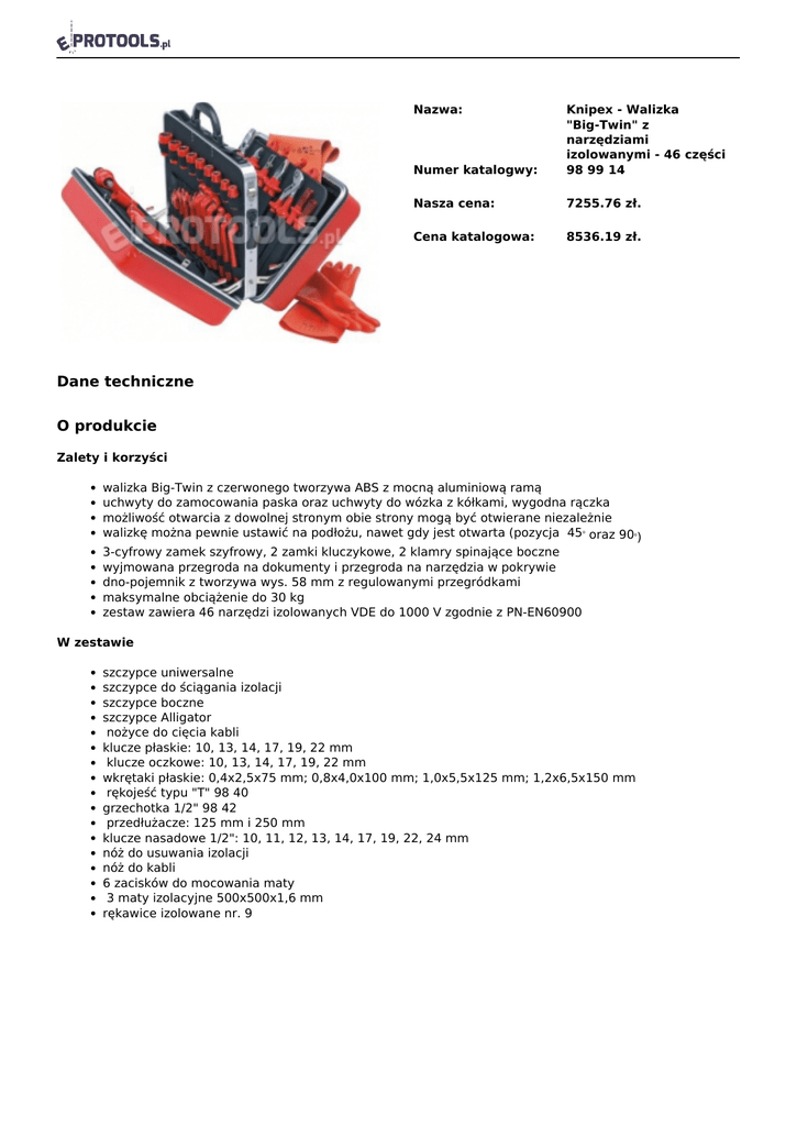 Nazwa: Numer katalogwy: Knipex - Walizka "Big-Twin" z narzędziami izolowanymi - 46 części 98 99 14 Nasza cena: 7255.76 zł. Cena katalogowa: 8536.19 zł. Dane techniczne O produkcie Zalety i korzyści walizka Big-Twin z czerwonego tworzywa ABS z mocną aluminiową ramą uchwyty do zamocowania paska oraz uchwyty do wózka z kółkami, wygodna rączka możliwość otwarcia z dowolnej stronym obie strony mogą być otwierane niezależnie walizkę można pewnie ustawić na podłożu, nawet gdy jest otwarta (pozycja 45 oraz 90 ) 3-cyfrowy zamek szyfrowy, 2 zamki kluczykowe, 2 klamry spinające boczne wyjmowana przegroda na dokumenty i przegroda na narzędzia w pokrywie dno-pojemnik z tworzywa wys. 58 mm z regulowanymi przegródkami maksymalne obciążenie do 30 kg zestaw zawiera 46 narzędzi izolowanych VDE do 1000 V zgodnie z PN-EN60900 o o W zestawie szczypce uniwersalne szczypce do ściągania izolacji szczypce boczne szczypce Alligator nożyce do cięcia kabli klucze płaskie: 10, 13, 14, 17, 19, 22 mm klucze oczkowe: 10, 13, 14, 17, 19, 22 mm wkrętaki płaskie: 0,4x2,5x75 mm; 0,8x4,0x100 mm; 1,0x5,5x125 mm; 1,2x6,5x150 mm rękojeść typu "T" 98 40 grzechotka 1/2" 98 42 przedłużacze: 125 mm i 250 mm klucze nasadowe 1/2": 10, 11, 12, 13, 14, 17, 19, 22, 24 mm nóż do usuwania izolacji nóż do kabli 6 zacisków do mocowania maty 3 maty izolacyjne 500x500x1,6 mm rękawice izolowane nr. 9 Powered by TCPDF (www.tcpdf.org)