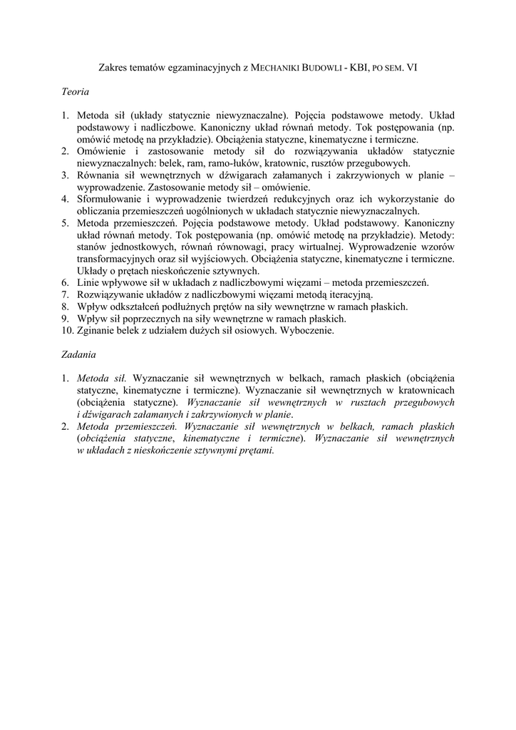 Zakres tematów egzaminacyjnych z MECHANIKI BUDOWLI - KBI, PO SEM. VI Teoria 1. Metoda sił (układy statycznie niewyznaczalne). Pojęcia podstawowe metody. Układ podstawowy i nadliczbowe. Kanoniczny układ równań metody. Tok postępowania (np. omówić metodę na przykładzie). Obciążenia statyczne, kinematyczne i termiczne. 2. Omówienie i zastosowanie metody sił do rozwiązywania układów statycznie niewyznaczalnych: belek, ram, ramo-łuków, kratownic, rusztów przegubowych. 3. Równania sił wewnętrznych w dźwigarach załamanych i zakrzywionych w planie – wyprowadzenie. Zastosowanie metody sił – omówienie. 4. Sformułowanie i wyprowadzenie twierdzeń redukcyjnych oraz ich wykorzystanie do obliczania przemieszczeń uogólnionych w układach statycznie niewyznaczalnych. 5. Metoda przemieszczeń. Pojęcia podstawowe metody. Układ podstawowy. Kanoniczny układ równań metody. Tok postępowania (np. omówić metodę na przykładzie). Metody: stanów jednostkowych, równań równowagi, pracy wirtualnej. Wyprowadzenie wzorów transformacyjnych oraz sił wyjściowych. Obciążenia statyczne, kinematyczne i termiczne. Układy o prętach nieskończenie sztywnych. 6. Linie wpływowe sił w układach z nadliczbowymi więzami – metoda przemieszczeń. 7. Rozwiązywanie układów z nadliczbowymi więzami metodą iteracyjną. 8. Wpływ odkształceń podłużnych prętów na siły wewnętrzne w ramach płaskich. 9. Wpływ sił poprzecznych na siły wewnętrzne w ramach płaskich. 10. Zginanie belek z udziałem dużych sił osiowych. Wyboczenie. Zadania 1. Metoda sił. Wyznaczanie sił wewnętrznych w belkach, ramach płaskich (obciążenia statyczne, kinematyczne i termiczne). Wyznaczanie sił wewnętrznych w kratownicach (obciążenia statyczne). Wyznaczanie sił wewnętrznych w rusztach przegubowych i dźwigarach załamanych i zakrzywionych w planie. 2. Metoda przemieszczeń. Wyznaczanie sił wewnętrznych w belkach, ramach płaskich (obciążenia statyczne, kinematyczne i termiczne). Wyznaczanie sił wewnętrznych w układach z nieskończenie sztywnymi prętami.