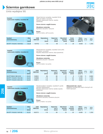 pobrano ze strony www.imbth.com.pl Ściernice garnkowe Linia wydajna SG Wszechstronne narzędzie, twardość M do szlifu na mokro i na sucho. Wysokie właściwości ścierne, wysoka żywotność. Kamień wykonanie miękkie, twardość M Ziarno ścierne: węglik krzemu Obrabiane materiały Kamienie naturalne i sztuczne ����� Proces Szlif na mokro, szlif na sucho. Symbol zamówieniowy Otw. ø [mm] EAN 4007220 Największa ø [mm] Najmniejsza ø [mm] Wysokość garnka [mm] Grub. ścíanek [mm] Maks. obroty [min-¹] 50 ETT 110-20 C 16 M SG 22,23 164792 110 90 55 20 8.600 2 1,350 5 2 2 0,860 1,350 1,350 Wszechstronne narzędzie, twardość Q do szlifu na mokro i na sucho. Wysokie właściwości ścierne, duża żywotność. Kamień wykonanie miękkie, twardość Q Ziarno ścierne: węglik krzemu Obrabiane materiały Kamienie sztuczne i naturalne Proces Szlif na mokro i na sucho. 206 ����� Symbol zamówieniowy Otw. ø [mm] EAN 4007220 Największa ø [mm] Najmniejsza ø [mm] Wysokość garnka [mm] Grub. ścíanek [mm] Maks. obroty [min-¹] 50 ETT 80-8 C 80 Q SG 50 ETT 110-20 C 16 Q SG 50 ETT 110-20 C 30 Q SG 22,23 22,23 22,23 164822 164808 164815 80 110 110 80 90 90 27 55 55 8 20 20 11.900 8.600 8.600 Wysokowydajne narzędzie, twardość R, profesjonalne zastosowanie. Wysokie właściwości ścierne, bardzo wysoka żywotność. Kamień wykonanie twarde, twardość R Wskazówki dot. użycia Najlepsze rezultaty przy użyciu mocnych szlifierek kątowych. Ziarno ścierne: węglik krzemu Obrabiane materiały Kamienie naturalne, kamienie sztuczne ����� Proces Szlif na mokro i na sucho. Symbol zamówieniowy Otw. ø [mm] EAN 4007220 Największa ø [mm] Najmniejsza ø [mm] Wysokość garnka [mm] Grub. ścíanek [mm] Maks. obroty [min-¹] 50 ETT 110-20 C 16 R SG 22,23 642573 110 90 55 20 8.600 18 206 Menu główne 2 1,350