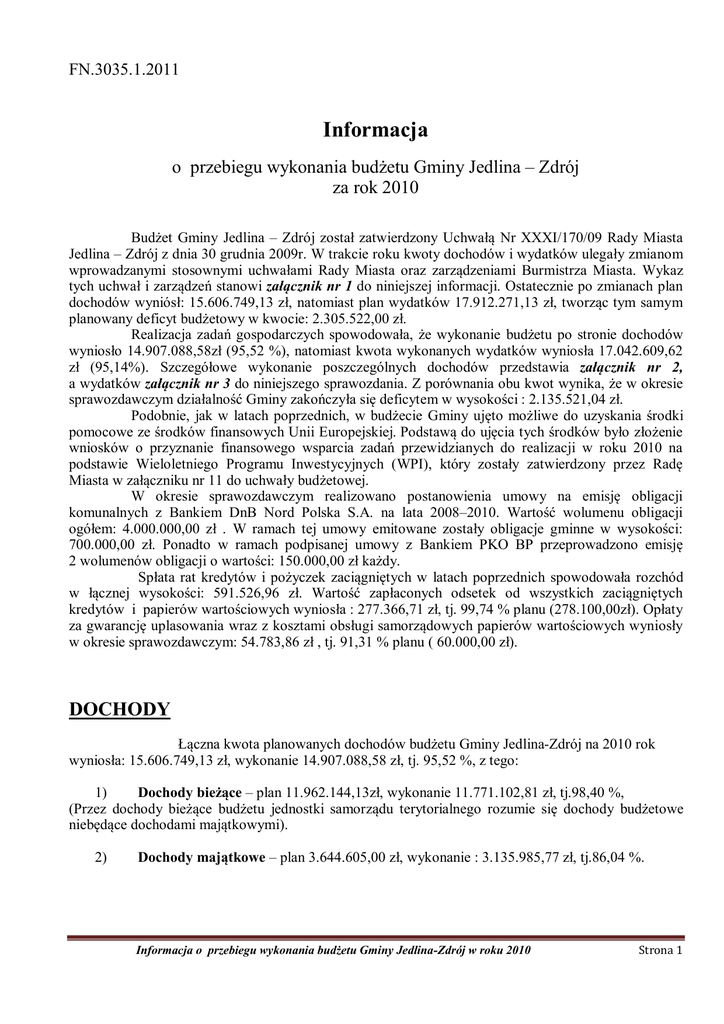 FN.3035.1.2011 Informacja o przebiegu wykonania budżetu Gminy Jedlina – Zdrój za rok 2010 Budżet Gminy Jedlina – Zdrój został zatwierdzony Uchwałą Nr XXXI/170/09 Rady Miasta Jedlina – Zdrój z dnia 30 grudnia 2009r. W trakcie roku kwoty dochodów i wydatków ulegały zmianom wprowadzanymi stosownymi uchwałami Rady Miasta oraz zarządzeniami Burmistrza Miasta. Wykaz tych uchwał i zarządzeń stanowi załącznik nr 1 do niniejszej informacji. Ostatecznie po zmianach plan dochodów wyniósł: 15.606.749,13 zł, natomiast plan wydatków 17.912.271,13 zł, tworząc tym samym planowany deficyt budżetowy w kwocie: 2.305.522,00 zł. Realizacja zadań gospodarczych spowodowała, że wykonanie budżetu po stronie dochodów wyniosło 14.907.088,58zł (95,52 %), natomiast kwota wykonanych wydatków wyniosła 17.042.609,62 zł (95,14%). Szczegółowe wykonanie poszczególnych dochodów przedstawia załącznik nr 2, a wydatków załącznik nr 3 do niniejszego sprawozdania. Z porównania obu kwot wynika, że w okresie sprawozdawczym działalność Gminy zakończyła się deficytem w wysokości : 2.135.521,04 zł. Podobnie, jak w latach poprzednich, w budżecie Gminy ujęto możliwe do uzyskania środki pomocowe ze środków finansowych Unii Europejskiej. Podstawą do ujęcia tych środków było złożenie wniosków o przyznanie finansowego wsparcia zadań przewidzianych do realizacji w roku 2010 na podstawie Wieloletniego Programu Inwestycyjnych (WPI), który zostały zatwierdzony przez Radę Miasta w załączniku nr 11 do uchwały budżetowej. W okresie sprawozdawczym realizowano postanowienia umowy na emisję obligacji komunalnych z Bankiem DnB Nord Polska S.A. na lata 2008–2010. Wartość wolumenu obligacji ogółem: 4.000.000,00 zł . W ramach tej umowy emitowane zostały obligacje gminne w wysokości: 700.000,00 zł. Ponadto w ramach podpisanej umowy z Bankiem PKO BP przeprowadzono emisję 2 wolumenów obligacji o wartości: 150.000,00 zł każdy. Spłata rat kredytów i pożyczek zaciągniętych w latach poprzednich spowodowała rozchód w łącznej wysokości: 591.526,96 zł. Wartość zapłaconych odsetek od wszystkich zaciągniętych kredytów i papierów wartościowych wyniosła : 277.366,71 zł, tj. 99,74 % planu (278.100,00zł). Opłaty za gwarancję uplasowania wraz z kosztami obsługi samorządowych papierów wartościowych wyniosły w okresie sprawozdawczym: 54.783,86 zł , tj. 91,31 % planu ( 60.000,00 zł). DOCHODY Łączna kwota planowanych dochodów budżetu Gminy Jedlina-Zdrój na 2010 rok wyniosła: 15.606.749,13 zł, wykonanie 14.907.088,58 zł, tj. 95,52 %, z tego: 1) Dochody bieżące – plan 11.962.144,13zł, wykonanie 11.771.102,81 zł, tj.98,40 %, (Przez dochody bieżące budżetu jednostki samorządu terytorialnego rozumie się dochody budżetowe niebędące dochodami majątkowymi). 2) Dochody majątkowe – plan 3.644.605,00 zł, wykonanie : 3.135.985,77 zł, tj.86,04 %. Informacja o przebiegu wykonania budżetu Gminy Jedlina-Zdrój w roku 2010 Strona 1 Do dochodów majątkowych zalicza się: a) Dotacje i środki otrzymane na inwestycje – (plan: 2.552.605,00 zł, wykonanie: 2.411.756,58 zł, z tego: 600-60016-6208 - plan w wysokości 642.605,00 zł, wykonanie 558.686,00 zł - dotacja celowa w ramach programów finansowych z udziałem środków europejskich oraz środków, o których mowa w art.5 ust.1 pkt 3 oraz ust.3 pkt 5 i 6 ustawy o finansach publicznych , lub płatności w ramach budżetu środków europejskich. Umowa o dofinansowanie projektu „Budowa i modernizacja dróg dojazdowych do miejsc atrakcyjnych turystycznie w Jedlinie-Zdroju nr UDA – RPDS.03.01.00-02033/09-00 w ramach Działania nr 3.1 „Infrastruktura drogowa” Regionalnego Programu Operacyjnego dla Województwa Dolnośląskiego na lata 2007-2013 ., 600-60016-6280 - plan w wysokości 162.000,00 zł, wykonanie 161.760,91 zł - dotacja celowa w ramach porozumienia zawartego z Powiatem Wałbrzyskim na dofinansowanie inwestycji. 630-63003-6208 - plan w wysokości 1.435.000,00 zł, wykonanie 1.401.200,50 zł – realizacja w II półroczu 2010 zgodnie z harmonogramem rzeczowo – finansowym. Umowa o dofinansowanie projektu „Uzdrowiskowy Szlak Turystyczno-Rekreacyjny w Jedlinie-Zdroju II etap nr WND – RPDS.06.01.00-02-005/09 w ramach Działania nr 6.1 „Turystyka Uzdrowiskowa” Regionalnego Programu Operacyjnego dla Województwa Dolnośląskiego na lata 2007-2013 , 801-80101-6330 - plan w wysokości 63.000,00 zł, wykonanie 63.000,00 zł (100,00%) – dotacja na pokrycie kosztów utworzenia szkolnego placu zabaw w ramach Rządowego Programu wspierania w latach 2009-2014 organów prowadzących w celu zapewnieniu bezpiecznych warunków nauki, wychowania i opieki w klasach I-III szkół podstawowych i ogólnokształcących szkół muzycznych I stopnia „Radosna szkoła”. 900-90078-6330 - plan w wysokości 250.000,00 zł, wykonanie 227.109,17zł – uzyskanie dotacji z rezerw celowych budżetu państwa na dofinansowanie zadania związanego z usuwaniem skutków powodzi z 2009 roku. b) Dochody ze sprzedaży majątku – plan 1.072.000,00 zł, wykonanie 704.859,54 zł, tj.65,76 %, z tego: 700-70005-0770 plan 1.060.000,00 zł, wykonanie 702.505,29 zł, 010-01095-0870 plan 10.000,00 zł, wykonanie 0,00 zł, 020-02001-0870 plan 2.000,00 zł, wykonanie 2.390,25 zł. Łączna kwota wpływów (702.505,29 zł) wynikała ze sprzedaży następujących składników majątkowych Gminy: - 24 lokale mieszkalne – kwota uzyskanych dochodów z tego tytułu: 85.866,15 zł, - 2 garaży na kwotę : 22.090,00 zł, - 3 lokali użytkowych (sprzedaż ratalna) uzyskano dochody z tego tytułu: 19.534,94 zł, - 5 nieruchomości gruntowych niezabudowanych, uzyskano dochody z tego tytułu: 345.010,00 zł, Współtworzyły ją również raty wpłacone na podstawie aktów notarialnych zawartych w latach ubiegłych (230.004,20 zł). Sprzedaż ratalna majątku Gminy dotyczyła następujących nieruchomości: - l