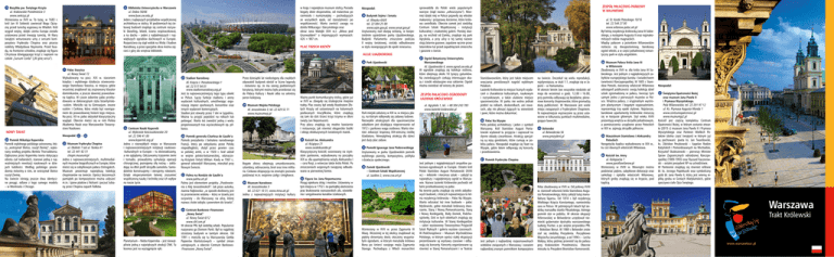 Bazylika pw. Świętego Krzyża w kraju i największe muzeum stolicy. Posiada bogaty zbiór eksponatów, od malarstwa po rzemiosło i numizmatykę – pochodzących ze wszystkich epok, od starożytności po współczesność. Warto zwrócić uwagę na dzieła Witkacego i Gierymskiego oraz obraz Jana Matejki (XIX w.): „Bitwa pod Grunwaldem” o imponujących wymiarach: 426 × 987 cm. Biblioteka Uniwersytecka w Warszawie ul. Krakowskie Przedmieście 3 www.swkrzyz.pl Wzniesiona w XVII w. To tutaj, w 1683 r. król Jan III Sobieski zawierzał Bogu Ojczyznę przed turecką wyprawą na Wiedeń. Król wygrał wojnę, dzięki czemu Europa została uratowana przed inwazją turecką. W filary świątyni wmurowano urny z sercami kompozytora Fryderyka Chopina oraz pisarza noblisty Władysława Reymonta. Przed fasadą, na frontonie schodów, znajduje się figura Chrystusa dźwigającego krzyż z napisem na cokole „Sursum Corda” („W górę serca”). ul. Dobra 56/66 www.buw.uw.edu.pl Jeden z najlepszych przykładów współczesnej architektury w stolicy. W podziemiach tej ciekawej budowli znajduje się centrum rozrywki (bowling, bilard, ściana wspinaczkowa), a na dachu – jeden z najładniejszych i największych ogrodów dachowych w Europie. Rozpościera się stąd widok na Wisłę i Stadion Narodowy, a przez specjalne okna można zajrzeć z góry do wnętrza biblioteki. PLAC TRZECH KRZYŻY Nieopodal: Budynek Sejmu i Senatu ul. Wiejska 4/6/8 tel. 22 694 25 00 www.sejm.gov.pl, www.senat.gov.pl Usytuowany nad skarpą wiślaną, w bezpośrednim sąsiedztwie parku Ujazdowskiego. Budynki Parlamentu zniszczone podczas II wojny światowej, zostały odbudowane w stylu nawiązującym do epoki renesansu. ALEJE UJAZDOWSKIE Park Ujazdowski Pałac Staszica NOWY ŚWIAT Pomnik Mikołaja Kopernika Pomnik wybitnego polskiego astronoma, który „wstrzymał Słońce, ruszył Ziemię”, wykonany według projektu Bertela Thorvaldsena. Ogłoszona przez Kopernika teoria dotycząca obrotu ciał niebieskich, stanowi jedną z najważniejszych rewolucji naukowych w dziejach ludzkości. Według polskiego powiedzenia mówimy o nim, że wstrzymał Słońce ruszył Ziemię. Na świecie istnieją jeszcze dwa identyczne posągi, odlane z tego samego modelu – w Montrealu i Chicago. ul. Nowy Świat 72 Wybudowany na pocz. XIX w. staraniem księdza i wybitnego działacza oświeceniowego Stanisława Staszica, w miejscu gdzie wcześniej znajdował się zrujnowany klasztor dominikanów, a jeszcze dawniej prawosławna kaplica. W czasie zaborów pałac przebudowano w dekoracyjnym stylu bizantyńsko-ruskim. Mieściło się tu Gimnazjum, zwane ruskim i Cerkiew, która miała być nawiązaniem do prawosławnej historii tego miejsca. Na pocz. XX w. pałac odzyskał klasycystyczny wygląd. Obecnie mieści się w nim Polska Akademia Nauk oraz Warszawskie Towarzystwo Naukowe. Nieopodal: – Muzeum Fryderyka Chopina ul. Okólnik 1 lub ul. Tamka 41 tel. 22 441 62 51 chopin.museum/pl Jedno z najnowocześniejszych, multimedialnych muzeów biograficznych w Europie, które mieści się w zabytkowym pałacu Ostrogskich. Muzeum prezentuje największą kolekcję chopinianów na świecie. Oprócz bezcennych pamiątek po kompozytorze można usłyszeć m.in.: śpiew ptaków z Nohant i poczuć lubiany przez Chopina zapach fiołków. Stadion Narodowy Centrum Nauki Kopernik ul. Wybrzeże Kościuszkowskie 20 tel. 22 596 41 00 www.kopernik.org.pl Jedno z niezwykłych miejsc w Warszawie i najnowocześniejszych instytucji naukowo-kulturalnych w Europie – tu doświadczamy, a nie oglądamy. Odczuwamy trzęsienie ziemi i tornado, prowadzimy symulację operacji chirurgicznej, poznajemy siłę nośną – zakładając na dłoń profil skrzydła samolotu. Samodzielnie konstruujemy i sterujemy robotami. Dzięki eksperymentom łatwiej zrozumieć współczesną naukę i technikę oraz ich wpływ na nasze życie. Al. Księcia J. Poniatowskiego 1 tel. 22 517 94 01 www.stadionnarodowy.org.pl Jest to najnowocześniejszy tego typu obiekt w Polsce. Łączy funkcje stadionu i areny wydarzeń kulturalnych, umożliwiając organizację imprez sportowych, koncertów oraz innych wydarzeń komercyjnych. Stadion jest otwarty przez 7 dni w tygodniu. Można tu przyjść pojeździć na rolkach lub pobiegać. Warto też zwiedzić jedną z wielu proponowanych tras wycieczkowych np. piłkarza. Przez dziesiątki lat niedostępny dla zwykłych obywateli budynek obrósł w liczne legendy - mówiono np. że ma szereg podziemnych korytarzy, którymi można było przedostać się do Pałacu Kultury i Nauki albo na sekretny peron kolejowy. Muzeum Wojska Polskiego Al. Jerozolimskie 3, tel. 22 629 52 71 www.muzeumwp.pl Pomnik generała Charlesa de Gaulle’a Pomnik prezydenta i bohatera narodowego Francji, który po odzyskaniu przez Polskę niepodległości, służył przez pewien czas w polskiej armii, a w 1920 r. brał udział w wojnie polsko-bolszewickiej, odznaczony Krzyżem Virtuti Militari. Kiedy w 1967 r., generał odwiedził Warszawę, mieszkał przy Nowym Świecie. Palma na Rondzie de Gaulle’a www.palma.art.pl Palma jest elementem projektu „Pozdrowienia z Alej Jerozolimskich”. Jak pisze autorka, Joanna Rajkowska: „w sposób dosłowny jest to przeniesienie widoku – który w Izraelu jest oczywisty – do Warszawy; na ulicę, której nazwa z kolei odsyła z powrotem do Izraela”. Ważny punkt komunikacyjny stolicy, gdzie już w XVII w. zbiegały się strategiczne miejskie trakty. Plac zwany był wtedy Rozdrożem Złotych Krzyży od ustawionych na kolumnach pozłacanych krucyfiksów, które znajdują się tam do dziś (trzeci krzyż trzyma w dłoni święty Jan Nepomucen). Przy placu znajdują się modne kawiarnie i restauracje, jak również eleganckie butiki i sklepy ekskluzywnych światowych marek. Kościół św. Aleksandra Bogate zbiory obejmują umundurowanie, sztandary, odznaczenia, broń oraz inne militaria. Ciekawa ekspozycja na zewnątrz pozwala podziwiać m.in. wo