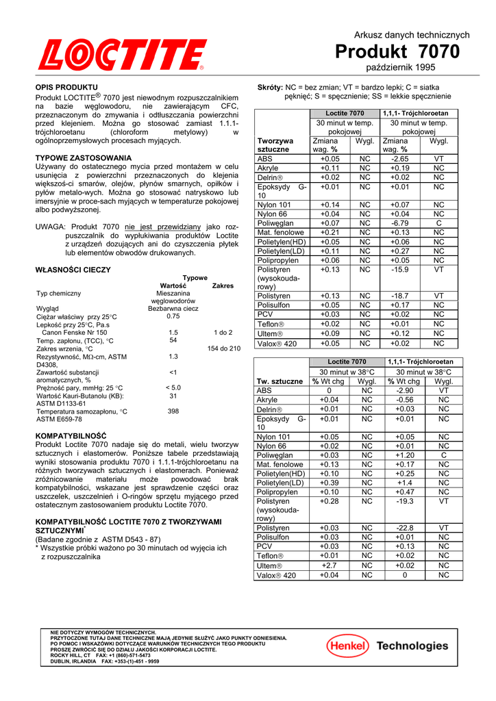 Arkusz danych technicznych Produkt 7070 październik 1995 OPIS PRODUKTU Produkt LOCTITE® 7070 jest niewodnym rozpuszczalnikiem na bazie węglowodoru, nie zawierającym CFC, przeznaczonym do zmywania i odtłuszczania powierzchni przed klejeniem. Można go stosować zamiast 1.1.1trójchloroetanu (chloroform metylowy) w ogólnoprzemysłowych procesach myjących. TYPOWE ZASTOSOWANIA Używany do ostatecznego mycia przed montażem w celu usunięcia z powierzchni przeznaczonych do klejenia większoś-ci smarów, olejów, płynów smarnych, opiłków i pyłów metalo-wych. Można go stosować natryskowo lub imersyjnie w proce-sach myjących w temperaturze pokojowej albo podwyższonej. UWAGA: Produkt 7070 nie jest przewidziany jako rozpuszczalnik do wypłukiwania produktów Loctite z urządzeń dozujących ani do czyszczenia płytek lub elementów obwodów drukowanych. WŁASNOŚCI CIECZY Typ chemiczny Wygląd Ciężar właściwy przy 25°C Lepkość przy 25°C, Pa.s Canon Fenske Nr 150 Temp. zapłonu, (TCC), °C Zakres wrzenia, °C Rezystywność, MΩ-cm, ASTM D4308, Zawartość substancji aromatycznych, % Prężność pary, mmHg: 25 °C Wartość Kauri-Butanolu (KB): ASTM D1133-61 Temperatura samozapłonu, °C ASTM E659-78 Typowe Wartość Zakres Mieszanina węglowodorów Bezbarwna ciecz 0.75 1.5 54 1 do 2 154 do 210 Skróty: NC = bez zmian; VT = bardzo lepki; C = siatka pęknięć; S = spęcznienie; SS = lekkie spęcznienie Loctite 7070 30 minut w temp. pokojowej Tworzywa Zmiana Wygl. sztuczne wag. % ABS +0.05 NC Akryle +0.11 NC +0.02 NC Delrin Epoksydy G+0.01 NC 10 Nylon 101 +0.14 NC Nylon 66 +0.04 NC Poliwęglan +0.07 NC Mat. fenolowe +0.21 NC Polietylen(HD) +0.05 NC Polietylen(LD) +0.11 NC Polipropylen +0.06 NC Polistyren +0.13 NC (wysokoudarowy) Polistyren +0.13 NC Polisulfon +0.05 NC PCV +0.03 NC +0.02 NC Teflon +0.09 NC Ultem +0.05 NC Valox 420 1.3 <1 < 5.0 31 398 KOMPATYBILNOŚĆ Produkt Loctite 7070 nadaje się do metali, wielu tworzyw sztucznych i elastomerów. Poniższe tabele przedstawiają wyniki stosowania produktu 7070 i 1.1.1-trójchloroetanu na różnych tworzywach sztucznych i elastomerach. Ponieważ zróżnicowanie materiału może powodować brak kompatybilności, wskazane jest sprawdzenie części oraz uszczelek, uszczelnień i O-ringów sprzętu myjącego przed ostatecznym zastosowaniem produktu Loctite 7070. KOMPATYBILNOŚĆ LOCTITE 7070 Z TWORZYWAMI * SZTUCZNYMI (Badane zgodnie z ASTM D543 - 87) * Wszystkie próbki ważono po 30 minutach od wyjęcia ich z rozpuszczalnika Loctite 7070 30 minut w 38°C Tw. sztuczne % Wt chg Wygl. ABS 0 NC Akryle +0.04 NC +0.01 NC Delrin Epoksydy G+0.01 NC 10 Nylon 101 +0.05 NC Nylon 66 +0.02 NC Poliwęglan +0.03 NC Mat. fenolowe +0.13 NC Polietylen(HD) +0.10 NC Polietylen(LD) +0.39 NC Polipropylen +0.10 NC Polistyren +0.28 NC (wysokoudarowy) Polistyren +0.03 NC Polisulfon +0.03 NC PCV +0.03 NC +0.01 NC Teflon +2.7 NC Ultem +0.04 NC Valox 420 NIE DOTYCZY WYMOGÓW TECHNICZNYCH. PRZYTOCZONE TUTAJ DANE TECHNICZNE MAJĄ JEDYNIE SŁUŻYĆ JAKO PUNKTY ODNIESIENIA. PO POMOC I WSKAZÓWKI DOTYCZĄCE WARUNKÓW TECHNICZNYCH TEGO PRODUKTU PROSZĘ ZWRÓCIĆ SIĘ DO DZIAŁU JAKOŚCI KORPORACJI LOCTITE. ROCKY HILL, CT FAX: +1 (860)-571-5473 DUBLIN, IRLANDIA FAX: +353-(1)-451 - 9959 1,1,1- Trójchloroetan 30 minut w temp. pokojowej Zmiana Wygl. wag. % -2.65 VT +0.19 NC +0.02 NC +0.01 NC +0.07 +0.04 -6.79 +0.13 +0.06 +0.27 +0.05 -15.9 NC NC C NC NC NC NC VT -18.7 +0.17 +0.02 +0.01 +0.12 +0.02 VT NC NC NC NC NC 1,1,1- Trójchloroetan 30 minut w 38°C % Wt chg Wygl. -2.90 VT -0.56 NC +0.03 NC +0.01 NC +0.05 +0.01 +1.20 +0.17 +0.25 +1.4 +0.47 -19.3 NC NC C NC NC NC NC VT -22.8 +0.01 +0.13 +0.02 +0.02 0 VT NC NC NC NC NC TDS Loctite®7070 październik 1995 KOMPATYBILNOŚĆ LOCTITE 7070 Z ELASTOMERAMI* (Badane zgodnie z ASTM D543-87) TEMPERATURA POWIETRZA POWINNA BYĆ NIŻSZA OD TEMPERATURY ZAPŁONU ROZPUSZCZALNIKA. * Wszystkie próbki ważono po 30 minutach od wyjęcia ich z rozpuszczalnika PRZED KLEJENIEM PRODUKT 7070 POWINIEN ZAWSZE CAŁKOWICIE ODPAROWAĆ Z CZĘŚCI, ABY ROZPUSZCZALNIK NIE ZOSTAŁ ZAMKNIĘTY W ZŁĄCZU. Skróty: NC = bez zmian; VT = bardzo lepki; C = siatka pęknięć; S = spęcznienie; SS = lekkie spęcznienie ELASTOMERY Buna N Buna S Butyl EPDM Neopren Poliuretan Silikon Viton ELASTOMERY Buna N Buna S Butyl EPDM Neopren Poliuretan Silikon Viton Loctite 7070 1,1,1Trójchloroetan 30 minut w temp. pokojowej Zmiana Wygl. wag. % +0.90 SS +0.48 SS +5.33 S +5.23 S +1.08 SS +0.07 SS +10.8 S +1.08 SS 30 minut w temp. pokojowej Zmiana Wygl. wag. % +12.4 S +7.28 S +12.1 S +11.1 S +11.8 S +1.72 S +11.3 S +1.73 S Loctite 7070 1,1,1Trójchloroetan 30 minut w 38°C Zmiana Wygl. wag. % +2.5 S +1.1 SS +8.2 S +12.0 S +2.3 S +0.07 SS +13.8 S 0 SS 30 minut w 38°C Zmiana Wygl. wag. % +23.8 S +11.9 S +19.9 S +23.2 S +14.7 S +3.30 S +17.7 S +3.10 S SZYBKOŚĆ ODPAROWYWANIA Czas wysychania w 25°C Materiał Bez wycierania Po wytarciu (suchą szmatką) Minuty 5 do 20 1 do 2 INFORMACJA DOTYCZĄCA ŚRODOWISKA Produkt 7070 nie grozi zubożeniem potencjału ozonowego. W przeciwieństwie do 1,1,1-trójchloroetanu nie podlega przepisom ani ograniczeniom Clean Air Act Amendments 1990 (Poprawek do Ustawy o Czystym Powietrzu 1990) ani Protokołu Montrealskiego. Produkt nie zawiera składników podlegających zgłoszeniu SARA Prawo lll, Dział 313. Jest on umieszczony na liście TSCA dla Stanów Zjednoczonych oraz liście DSL dla Kanady. INFORMACJA OGÓLNA Informacja na temat bezpiecznego obchodzenia się z pro-duktem znajduje się w arkuszu bezpieczeństwa dotyczą-cym materiału (MSDS). Ostrzeżenie NIE NALEŻY NIGDY UŻYWAĆ TEGO PRODUKTU W URZĄ-DZENIACH MYJĄCYCH WYKORZYSTUJĄCYCH KONDEN-SACJĘ PAR LUB WRZENIE CZYNNIKA MYJĄCEGO. Wskazówki dotyczące stosowania 1. Obficie spryskać powierzchnie produktem. 2. Póki powierzchnie są jeszcze mokre, wytrzeć je czystą szmatką, aby usunąć wszelkie zanieczyszczenia. Jeśli trzeba, spryskać powierzchnie jeszcze raz, aby