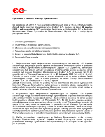 Ogłoszenie o zwołaniu Walnego Zgromadzenia Na podstawie art. 399 § 1 Kodeksu Spółek Handlowych oraz § 19 ust. 3 Statutu Spółki, Zarząd Spółki Akcyjnej Elektrociepłownia „Będzin” S.A. zwołuje na dzień 20 grudnia 2013 r. roku o godzinie 12°°, w siedzibie Spółki przy ul. Małobądzkiej 141 w Będzinie, Nadzwyczajne Walne Zgromadzenie Elektrociepłowni „Będzin” S.A. z następującym porządkiem obrad: 1. Otwarcie Zgromadzenia. 2. Wybór Przewodniczącego Zgromadzenia. 3. Stwierdzenie prawidłowości zwołania Zgromadzenia. 4. Przyjęcie porządku obrad Zgromadzenia. 5. Zmiany w składzie Rady Nadzorczej Spółki Elektrociepłownia „Będzin” S.A. 6. Zamknięcie Zgromadzenia. I. Akcjonariuszowi bądź akcjonariuszom reprezentującym co najmniej 1/20 kapitału zakładowego przysługuje prawo żądania umieszczenia określonych spraw w porządku obrad Walnego Zgromadzenia Elektrociepłowni „Będzin” S.A. Żądanie to, zawierające uzasadnienie lub projekt uchwały dotyczącej proponowanego punktu porządku obrad, powinno być złożone Zarządowi Elektrociepłowni „Będzin” S.A. nie później, niż 21 dni przed terminem Walnego Zgromadzenia, tj. do 29 listopada 2013 (art. 401 § 1 k.s.h.). Żądanie to może zostać złożone w postaci elektronicznej na adres mailowy Spółki [email protected] , bądź w formie pisemnej na adres: Zarząd Elektrociepłowni „Będzin” S.A. , ul. Małobądzka 141, 42-500 Będzin. Zarząd niezwłocznie, jednak nie później niż na osiemnaście dni przed wyznaczonym terminem Walnego Zgromadzenia, ogłosi zmiany w porządku obrad, wprowadzone na żądanie akcjonariusza lub akcjonariuszy. Ogłoszenie nowego porządku obrad nastąpi w sposób właściwy dla zwołania Walnego Zgromadzenia. II. Akcjonariusz bądź akcjonariusze reprezentujący co najmniej 1/20 kapitału zakładowego mogą przed terminem Walnego Zgromadzenia, w postaci elektronicznej na adres mailowy Spółki [email protected] , bądź w formie pisemnej na adres: Zarząd Elektrociepłowni „Będzin” S.A. , ul. Małobądzka 141, 42-500 Będzin, zgłaszać projekty uchwał dotyczące spraw wprowadzonych do porządku obrad Walnego Zgromadzenia lub spraw, które mają zostać wprowadzone do porządku obrad Walnego Zgromadzenia. Spółka niezwłocznie ogłasza projekty uchwał na stronie internetowej www.ecbedzin.pl. Akcjonariusz bądź akcjonariusze zgłaszający projekt uchwały powinni wraz z projektem uchwał przedstawić Spółce wystawione przez podmiot zaświadczenie o prawie udziału w Walnym Zgromadzeniu w celu identyfikacji ich jako uprawnionych akcjonariuszy Spółki. III. Każdy akcjonariusz, uczestniczący w Walnym Zgromadzeniu, może podczas Walnego Zgromadzenia zgłaszać projekty uchwał dotyczących spraw będących przedmiotem Walnego Zgromadzenia lub wprowadzonych do porządku obrad zgodnie z pkt. II powyżej. IV. Akcjonariusz będący osobą fizyczną może uczestniczyć w Walnym Zgromadzeniu Elektrociepłowni „Będzin” S.A. oraz wykonywać prawo głosu osobiście lub przez pełnomocnika. Akcjonariusz niebędący osobą fizyczną może uczestniczyć w Walnym Zgromadzeniu oraz wykonywać prawo głosu przez osobę uprawnioną do składania oświadczeń woli w jego imieniu lub przez pełnomocnika. Pełnomocnictwo winno być, pod rygorem nieważności, sporządzone w formie pisemnej i doręczone do protokołu Walnego Zgromadzenia lub udzielone w postaci elektronicznej. Formularz zawierający wzór pełnomocnictwa w postaci elektronicznej jest opublikowany na stronie internetowej Spółki pod adresem: www.ecbedzin.pl O udzieleniu pełnomocnictwa w postaci elektronicznej należy zawiadomić Spółkę przy wykorzystaniu środków komunikacji elektronicznej poprzez przesłanie wypełnionego formularza pełnomocnictwa w formacie PDF, pocztą elektroniczną na adres mailowy Spółki [email protected] . Informacja o udzieleniu pełnomocnictwa powinna zawierać podpis mocodawcy, zakres pełnomocnictwa i wskazanie liczby akcji, z których wykonywane będzie prawo głosu oraz datę Walnego Zgromadzenia, na którym prawa te będą wykonywane. Informacja powinna też zawierać dane kontaktowe mocodawcy (w tym numer telefonu lub mail) – zgodne z danymi wskazanymi w biurze maklerskim, które wystawiło dokument poświadczający prawo do udziału w Walnym Zgromadzeniu. Spółka zastrzega sobie prawo identyfikacji akcjonariusza i jego pełnomocnika oraz weryfikacji udzielonego pełnomocnictwa. Weryfikacja ta może polegać, w szczególności, na ustaleniu, przy pomocy biura maklerskiego, które wydało dokument poświadczający prawo do udziału w Walnym Zgromadzeniu, danych kontaktowych mocodawcy i zwrotnym pytaniu zadanym w formie elektronicznej lub kontakcie telefonicznym, mającym na celu potwierdzenie danych dotyczących tożsamości akcjonariusza i pełnomocnika oraz potwierdzenie faktu udzielenia pełnomocnictwa i jego zakresu. Brak udzielenia odpowiedzi na zadawane pytania w trakcie weryfikacji będzie traktowany jako brak możliwości weryfikacji udzielenia pełnomocnictwa i stanowić będzie podstawę dla odmowy dopuszczenia pełnomocnika do udziału w Walnym Zgromadzeniu. Weryfikacja telefoniczna będzie dokonywana niezwłocznie po uzyskaniu informacji o udzieleniu pełnomocnictwa w postaci elektronicznej. Spółka zastrzega sobie prawo do rejestracji rozmów. Prawo do reprezentowania akcjonariusza niebędącego osobą fizyczną winno wynikać z okazanego przy sporządzaniu listy obecności odpisu właściwego rejestru, składanego w oryginale lub kopii potwierdzonej za zgodność z oryginałem przez notariusza, ewentualnie ciągu pełnomocnictw. Osoba bądź osoby udzielające pełnomocnictwa w imieniu akcjonariusza niebędącego osobą fizyczną, powinny być uwidocznione w aktualnym odpisie z właściwego rejestru. Jeżeli pełnomocnikiem na Walnym Zgromadzeniu Elektrociepłowni „Będzin” S.A. jest członek zarządu, członek rady nadzorczej