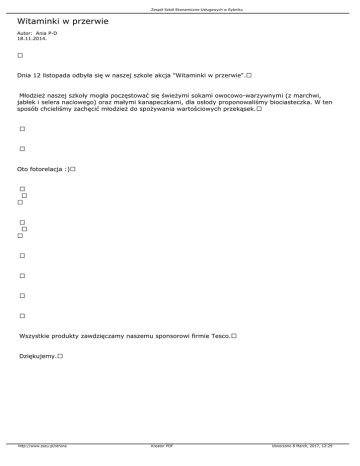 Zespół Szkół Ekonomiczno-Usługowych w Rybniku Witaminki w przerwie Autor: Ania P-D 18.11.2014. Dnia 12 listopada odbyła się w naszej szkole akcja "Witaminki w przerwie". Młodzież naszej szkoły mogła poczęstować się świeżymi sokami owocowo-warzywnymi (z marchwi, jabłek i selera naciowego) oraz małymi kanapeczkami, dla osłody proponowaliśmy biociasteczka. W ten sposób chcieliśmy zachęcić młodzież do spożywania wartościowych przekąsek. Oto fotorelacja :) Wszystkie produkty zawdzięczamy naszemu sponsorowi firmie Tesco. Dziękujemy. http://www.zseu.pl/strona Kreator PDF Utworzono 8 March, 2017, 12:29