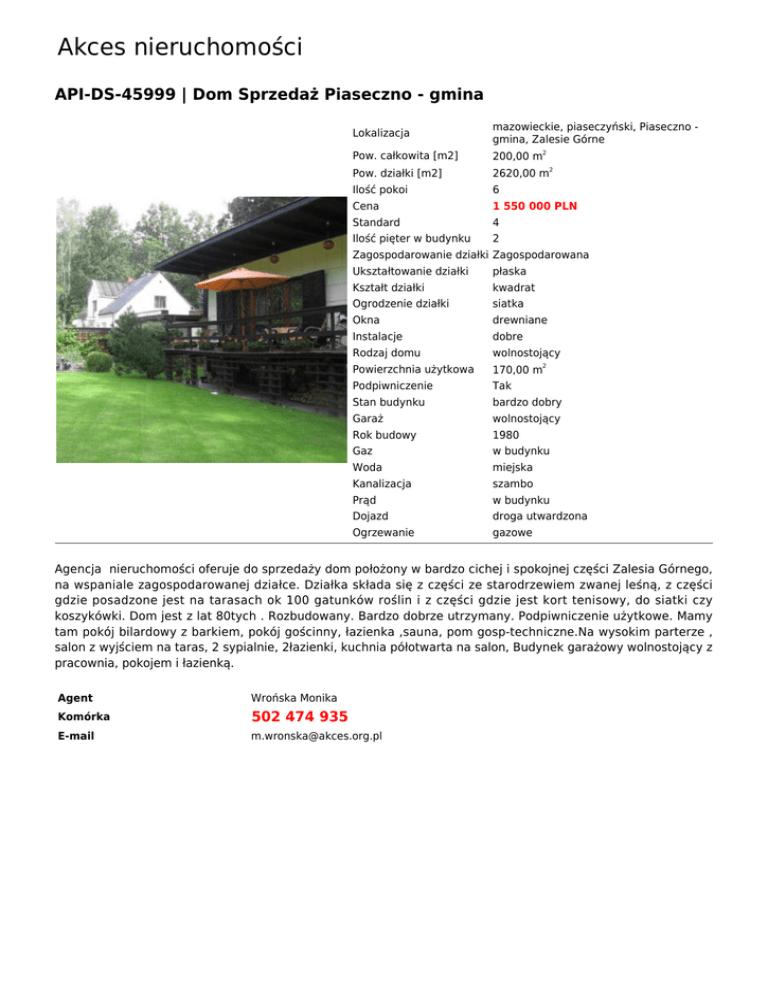 Akces nieruchomości API-DS-45999 | Dom Sprzedaż Piaseczno - gmina Lokalizacja mazowieckie, piaseczyński, Piaseczno gmina, Zalesie Górne Pow. całkowita [m2] 200,00 m2 Pow. działki [m2] 2620,00 m2 Ilość pokoi 6 Cena 1 550 000 PLN Standard 4 Ilość pięter w budynku 2 Zagospodarowanie działki Zagospodarowana Ukształtowanie działki płaska Kształt działki kwadrat Ogrodzenie działki siatka Okna drewniane Instalacje dobre Rodzaj domu wolnostojący Powierzchnia użytkowa 170,00 m2 Podpiwniczenie Tak Stan budynku bardzo dobry Garaż wolnostojący Rok budowy 1980 Gaz w budynku Woda miejska Kanalizacja szambo Prąd w budynku Dojazd droga utwardzona Ogrzewanie gazowe Agencja nieruchomości oferuje do sprzedaży dom położony w bardzo cichej i spokojnej części Zalesia Górnego, na wspaniale zagospodarowanej działce. Działka składa się z części ze starodrzewiem zwanej leśną, z części gdzie posadzone jest na tarasach ok 100 gatunków roślin i z części gdzie jest kort tenisowy, do siatki czy koszykówki. Dom jest z lat 80tych . Rozbudowany. Bardzo dobrze utrzymany. Podpiwniczenie użytkowe. Mamy tam pokój bilardowy z barkiem, pokój gościnny, łazienka ,sauna, pom gosp-techniczne.Na wysokim parterze , salon z wyjściem na taras, 2 sypialnie, 2łazienki, kuchnia półotwarta na salon, Budynek garażowy wolnostojący z pracownia, pokojem i łazienką. Agent Wrońska Monika Komórka 502 474 935 E-mail [email protected]