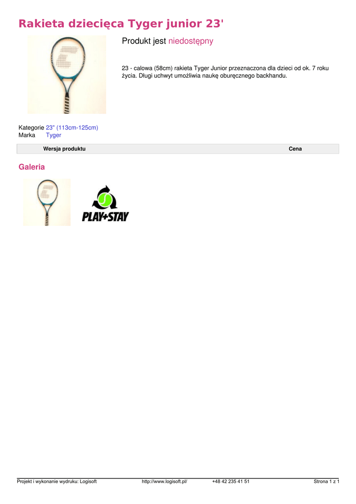 Rakieta dziecięca Tyger junior 23' Produkt jest niedostępny 23 - calowa (58cm) rakieta Tyger Junior przeznaczona dla dzieci od ok. 7 roku życia. Długi uchwyt umożliwia naukę oburęcznego backhandu. Kategorie 23" (113cm-125cm) Marka Tyger Wersja produktu Cena Galeria Projekt i wykonanie wydruku: Logisoft Powered by TCPDF (www.tcpdf.org) http://www.logisoft.pl/ +48 42 235 41 51 Strona 1 z 1