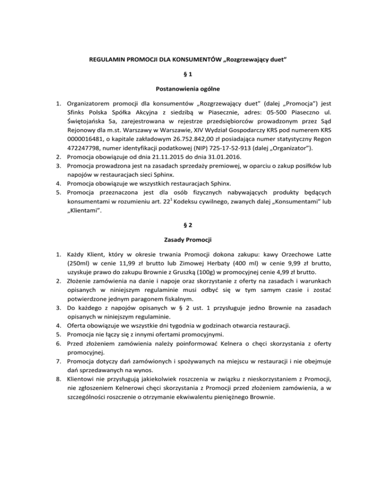 REGULAMIN PROMOCJI DLA KONSUMENTÓW „Rozgrzewający duet” §1 Postanowienia ogólne 1. Organizatorem promocji dla konsumentów „Rozgrzewający duet” (dalej „Promocja”) jest Sfinks Polska Spółka Akcyjna z siedzibą w Piasecznie, adres: 05-500 Piaseczno ul. Świętojańska 5a, zarejestrowana w rejestrze przedsiębiorców prowadzonym przez Sąd Rejonowy dla m.st. Warszawy w Warszawie, XIV Wydział Gospodarczy KRS pod numerem KRS 0000016481, o kapitale zakładowym 26.752.842,00 zł posiadająca numer statystyczny Regon 472247798, numer identyfikacji podatkowej (NIP) 725-17-52-913 (dalej „Organizator”). 2. Promocja obowiązuje od dnia 21.11.2015 do dnia 31.01.2016. 3. Promocja prowadzona jest na zasadach sprzedaży premiowej, w oparciu o zakup posiłków lub napojów w restauracjach sieci Sphinx. 4. Promocja obowiązuje we wszystkich restauracjach Sphinx. 5. Promocja przeznaczona jest dla osób fizycznych nabywających produkty będących konsumentami w rozumieniu art. 221 Kodeksu cywilnego, zwanych dalej „Konsumentami” lub „Klientami”. §2 Zasady Promocji 1. Każdy Klient, który w okresie trwania Promocji dokona zakupu: kawy Orzechowe Latte (250ml) w cenie 11,99 zł brutto lub Zimowej Herbaty (400 ml) w cenie 9,99 zł brutto, uzyskuje prawo do zakupu Brownie z Gruszką (100g) w promocyjnej cenie 4,99 zł brutto. 2. Złożenie zamówienia na danie i napoje oraz skorzystanie z oferty na zasadach i warunkach opisanych w niniejszym regulaminie musi odbyć się w tym samym czasie i zostać potwierdzone jednym paragonem fiskalnym. 3. Do każdego z napojów opisanych w § 2 ust. 1 przysługuje jedno Brownie na zasadach opisanych w niniejszym regulaminie. 4. Oferta obowiązuje we wszystkie dni tygodnia w godzinach otwarcia restauracji. 5. Promocja nie łączy się z innymi ofertami promocyjnymi. 6. Przed złożeniem zamówienia należy poinformować Kelnera o chęci skorzystania z oferty promocyjnej. 7. Promocja dotyczy dań zamówionych i spożywanych na miejscu w restauracji i nie obejmuje dań sprzedawanych na wynos. 8. Klientowi nie przysługują jakiekolwiek roszczenia w związku z nieskorzystaniem z Promocji, nie zgłoszeniem Kelnerowi chęci skorzystania z Promocji przed złożeniem zamówienia, a w szczególności roszczenie o otrzymanie ekwiwalentu pieniężnego Brownie. §3 Postanowienia końcowe 1. Niniejszy regulamin będzie udostępniany wszystkim zainteresowanym w restauracjach objętych Promocją oraz w siedzibie Organizatora. 2. W sprawach nieuregulowanych niniejszym regulaminem stosuje się przepisy Kodeksu Cywilnego oraz inne powszechnie obowiązujące przepisy prawa.