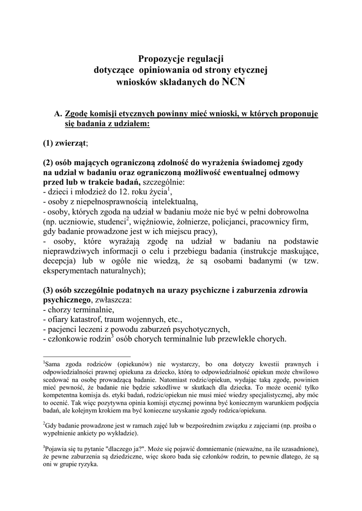 Propozycje regulacji dotyczące opiniowania od strony etycznej wniosków składanych do NCN A. Zgodę komisji etycznych powinny mieć wnioski, w których proponuje się badania z udziałem: (1) zwierząt; (2) osób mających ograniczoną zdolność do wyrażenia świadomej zgody na udział w badaniu oraz ograniczoną możliwość ewentualnej odmowy przed lub w trakcie badań, szczególnie: - dzieci i młodzież do 12. roku życia1, - osoby z niepełnosprawnością intelektualną, - osoby, których zgoda na udział w badaniu może nie być w pełni dobrowolna (np. uczniowie, studenci2, więźniowie, żołnierze, policjanci, pracownicy firm, gdy badanie prowadzone jest w ich miejscu pracy), - osoby, które wyrażają zgodę na udział w badaniu na podstawie nieprawdziwych informacji o celu i przebiegu badania (instrukcje maskujące, decepcja) lub w ogóle nie wiedzą, że są osobami badanymi (w tzw. eksperymentach naturalnych); (3) osób szczególnie podatnych na urazy psychiczne i zaburzenia zdrowia psychicznego, zwłaszcza: - chorzy terminalnie, - ofiary katastrof, traum wojennych, etc., - pacjenci leczeni z powodu zaburzeń psychotycznych, - członkowie rodzin3 osób chorych terminalnie lub przewlekle chorych. 1 Sama zgoda rodziców (opiekunów) nie wystarczy, bo ona dotyczy kwestii prawnych i odpowiedzialności prawnej opiekuna za dziecko, którą to odpowiedzialność opiekun może chwilowo scedować na osobę prowadzącą badanie. Natomiast rodzic/opiekun, wydając taką zgodę, powinien mieć pewność, że badanie nie będzie szkodliwe w skutkach dla dziecka. To może ocenić tylko kompetentna komisja ds. etyki badań, rodzic/opiekun nie musi mieć wiedzy specjalistycznej, aby móc to ocenić. Tak więc pozytywna opinia komisji etycznej powinna być koniecznym warunkiem podjęcia badań, ale kolejnym krokiem ma być konieczne uzyskanie zgody rodzica/opiekuna. Gdy badanie prowadzone jest w ramach zajęć lub w bezpośrednim związku z zajęciami (np. prośba o wypełnienie ankiety po wykładzie). 2 3 Pojawia się tu pytanie "dlaczego ja?". Może się pojawić domniemanie (nieważne, na ile uzasadnione), że pewne zaburzenia są dziedziczne, więc skoro bada się członków rodzin, to pewnie dlatego, że są oni w grupie ryzyka. B. Zgoda komisji etycznej jest wymagana w odniesieniu do badań: (4)polegających na aktywnej interwencji w zachowanie człowieka, zmierzających do zmiany tego zachowania, bez bezpośredniej ingerencji w działanie mózgu (np. treningi poznawcze, psychoterapia, psychokorekcja itp.). Dotyczy to również sytuacji, gdy zamierzona interwencja ma przynieść korzyść badanemu (np. usprawnić jego pamięć). Gdy ma mu przejściowo zaszkodzić (np. manipulacja nastrojem czy poziomem stresu), jest to wymagane tym bardziej. (5)dotyczących kwestii kontrowersyjnych (np. aborcja, in vitro, kara śmierci) albo wymagających zachowania szczególnej delikatności i rozwagi (np. przekonań religijnych lub postaw wobec grup mniejszościowych) (6)długotrwałych, męczących, wyczerpujących fizycznie lub psychicznie. C. Zgoda komisji bioetycznej (7)W przypadku badań polegających na aktywnej interwencji w stan organizmu lub psychiki (leki, środki psychoaktywne, substancje kontrastowe wprowadzane do krwiobiegu itp.) wymagana jest zgoda komisji bioetycznej, działającej np. przy akademii lub uniwersytecie medycznym. Uwaga: Zgoda komisji etycznej/bioetycznej jest wymagana już na etapie nadsyłania wniosku do NCN. Kiedy zgoda komisji etycznej nie jest wymagana? Samo dokonywanie pomiarów (ankiety kwestionariusze) nie wymaga zgody komisji etycznej (z zastrzeżeniem punktów 2, 3, 5, 6). Dotyczy to również pomiarów psychofizjologicznych (reakcja elektrodermalna, EEG, badanie fazowej lub tonicznej aktywności serca), z wyjątkiem PET (bo wymaga środka kontrastowego) i fMRI (bo naraża osobę badaną na działanie silnego pola magnetycznego i hałasu, a ponadto wymaga zachowania restrykcyjnych procedur kwalifikujących do udziału w badaniu). Przygotowali: Jerzy M. Brzeziński, Edward Nęcka, Zbigniew Spendel i Barbara Bokus