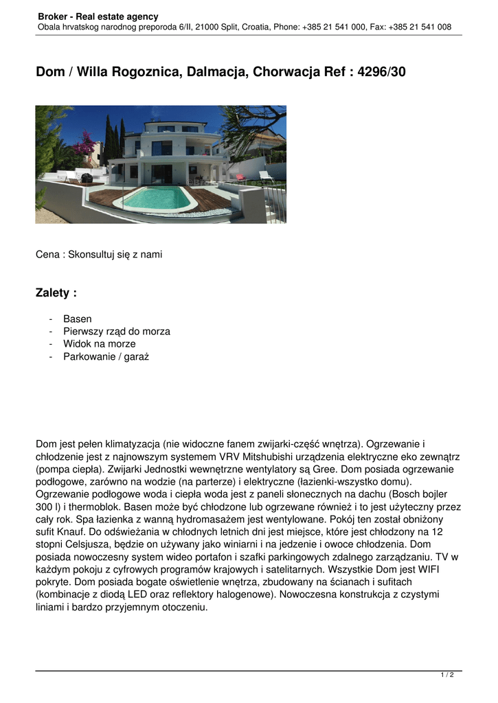 Broker - Real estate agency Obala hrvatskog narodnog preporoda 6/II, 21000 Split, Croatia, Phone: +385 21 541 000, Fax: +385 21 541 008 Dom / Willa Rogoznica, Dalmacja, Chorwacja Ref : 4296/30 Cena : Skonsultuj się z nami Zalety : - Basen Pierwszy rząd do morza Widok na morze Parkowanie / garaż Dom jest pełen klimatyzacja (nie widoczne fanem zwijarki-część wnętrza). Ogrzewanie i chłodzenie jest z najnowszym systemem VRV Mitshubishi urządzenia elektryczne eko zewnątrz (pompa ciepła). Zwijarki Jednostki wewnętrzne wentylatory są Gree. Dom posiada ogrzewanie podłogowe, zarówno na wodzie (na parterze) i elektryczne (łazienki-wszystko domu). Ogrzewanie podłogowe woda i ciepła woda jest z paneli słonecznych na dachu (Bosch bojler 300 l) i thermoblok. Basen może być chłodzone lub ogrzewane również i to jest użyteczny przez cały rok. Spa łazienka z wanną hydromasażem jest wentylowane. Pokój ten został obniżony sufit Knauf. Do odświeżania w chłodnych letnich dni jest miejsce, które jest chłodzony na 12 stopni Celsjusza, będzie on używany jako winiarni i na jedzenie i owoce chłodzenia. Dom posiada nowoczesny system wideo portafon i szafki parkingowych zdalnego zarządzaniu. TV w każdym pokoju z cyfrowych programów krajowych i satelitarnych. Wszystkie Dom jest WIFI pokryte. Dom posiada bogate oświetlenie wnętrza, zbudowany na ścianach i sufitach (kombinacje z diodą LED oraz reflektory halogenowe). Nowoczesna konstrukcja z czystymi liniami i bardzo przyjemnym otoczeniu. 1/2 Broker - Real estate agency Obala hrvatskog narodnog preporoda 6/II, 21000 Split, Croatia, Phone: +385 21 541 000, Fax: +385 21 541 008 ETICS termo Sistem elewacji 5-8 cm Fasada piorun poprzez LUXOMAT ceramika porcelany zarówno wewnątrz i na zewnątrz okładzina wokół pływanie basen Wood-IPE 3 miejsca parkingowe z szafkami zablokować hasłem na drzwiach wejściowych Nadzór wideo (8 kamer) przełączniki VIMAR Waterair pływanie basen SARA Hidromasage wanna KOLPA SAN OPERA (180 cm) Okna i drzwi ALU K z trójwarstwowego szkła. Dywan w pokoju 22 mm 2/2