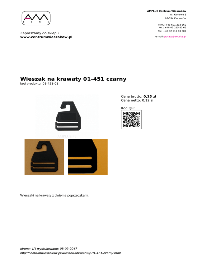 AMPLUS Centrum Wieszaków ul. Klonowa 8 95-054 Ksawerów kom.: +48 601 233 660 tel.: +48 42 215 82 66 fax: +48 42 212 80 602 Zapraszamy do sklepu www.centrumwieszakow.pl e-mail: [email protected] Wieszak na krawaty 01-451 czarny kod produktu: 01-451-01 Cena brutto: 0,15 zł Cena netto: 0,12 zł Kod QR: Wieszaki na krawaty z dwiema poprzeczkami. strona: 1/1 wydrukowano: 08-03-2017 http://centrumwieszakow.pl/wieszak-ubraniowy-01-451-czarny.html