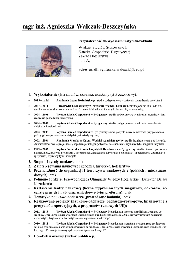 mgr inż. Agnieszka Walczak-Beszczyńska Przynależność do wydziału/instytutu/zakładu: Wydział Studiów Stosowanych Katedra Gospodarki Turystycznej Zakład Hotelarstwa bud. A, adres email: [email protected] 1. Wykształcenie (lata studiów, uczelnia, uzyskany tytuł zawodowy): 2015 – nadal 2007 – 2011 Uniwersytet Ekonomiczny w Poznaniu, Wydział Ekonomii, niestacjonarne studia doktoranckie na kierunku ekonomia, w trakcie praca doktorska na temat jakości i efektywności usług 2004 – 2005 Wyższa Szkoła Gospodarki w Bydgoszczy, studia podyplomowe w zakresie: organizacji i zarządzania gospodarką turystyczną 2004 – 2005 Wyższa Szkoła Gospodarki w Bydgoszczy, studia podyplomowe w zakresie: zarządzanie obiektami hotelarskimi 2003 – 2005 Wyższa Szkoła Gospodarki w Bydgoszczy studia podyplomowe w zakresie: przygotowania pedagogicznego z elementami dydaktyki szkoły wyższej 2002 – 2004 Akademia Morska w Gdyni, Wydział Administracyjny, studia drugiego stopnia na kierunku „towaroznawstwo”, specjalność: „organizacja usług turystyczno-hotelarskich”, uzyskany tytuł magistra inżyniera 1999 – 2002 Wyższa Pomorska Szkoła Turystyki i Hotelarstwa w Bydgoszczy, studia pierwszego stopnia na kierunku „turystyka i rekreacja”, specjalność: „zarządzanie turystyką i hotelarstwo”, specjalizacja: „polityka turystyczna”, uzyskany tytuł licencjata Akademia Leona Koźmińskiego, studia podyplomowe w zakresie: zarządzanie projektami 2. Stopnie i tytuły naukowe: brak 3. Zainteresowania naukowe: ekonomia, turystyka, hotelarstwo 4. Przynależność do organizacji i towarzystw naukowych : (polskich i międzynarodowych): brak 5. Pełnione funkcje: Przewodnicząca Olimpiady Wiedzy Hotelarskiej, Dyrektor Działu Kształcenia 6. Kształcenie kadry naukowej (liczba wypromowanych magistrów, doktorów, recenzje prac dr i hab. oraz wniosków o tytuł profesora): brak 7. Tematyka naukowo-badawcza (prowadzone badania): brak 8. Realizowane projekty (naukowo-badawcze, badawczo-rozwojowe, finansowane z programów operacyjnych, z programów ramowych UE): 2012 – 2015 Wyższa Szkoła Gospodarki w Bydgoszczy Koordynator projektu współfinansowanego ze środków Unii Europejskiej w ramach Europejskiego Funduszu Społecznego „Zintegrowany program nauczania matematyki, fizyki oraz informatyki–nowe wyzwanie w edukacji”. 2010 – 2011 Wyższa Szkoła Gospodarki w Bydgoszczy Koordynator wdrażania systemu prac aplikacyjności prac dyplomowych współfinansowanego ze środków Unii Europejskiej w ramach Europejskiego Funduszu Społecznego „Promocja i rozwój aplikacyjności prac naukowych” 9. Dorobek naukowy (wykaz publikacji): Marszańska M., Walczak-Beszczyńska A., 2014, Ruchoma baza parahotelarska (funkcja noclegowa) w środkach transportu. Zeszyty Naukowe (2014) WSG w Bydgoszczy Walczak-Beszczyńska, 2013 „Analiza pasażerskiego rynku transportu lotniczego w Polsce w latach 2009-2013, ze szczególnym uwzględnieniem pasażerskich połączeń lotniczych z Portu Lotniczego im. I.Paderewskiego w Bydgoszczy”, Materiały pokonferencyjne: Stan i rozwój regionalnej turystyki, rekreacji i rehabilitacji WSG w Bydgoszczy Zeszyty Naukowe (2013) WSG w Bydgoszczy Barczak M., Marszańska M, Walczak-Beszczyńska A., 2012, „Traktakt z Lizbony a sprawa Polski”, Zeszyty Ekonomiczne (2012) WSG w Bydgoszczy Barczak M., Saks E., Walczak-Beszczyńska A., Wilmańska K., 2010, Turystyka w województwie kujawskopomorskim w warunkach funkcjonowania Polski w Unii Europejskiej” Materiały pokonferencyjne: Stan i rozwój regionalnej turystyki, rekreacji i rehabilitacji WSG w Bydgoszczy, Barczak M., Marszańska M., Saks E., Walczak-Beszczyńska A., Wilmańska K., 2010, „Analiza pasażerskiego rynku transportu lotniczego w Polsce w latach 2004-2009, ze szczególnym uwzględnieniem pasażerskich połączeń lotniczych z Portu Lotniczego im. I.Paderewskiego w Bydgoszczy”, Materiały pokonferencyjne: Stan i rozwój regionalnej turystyki, rekreacji i rehabilitacji WSG w Bydgoszczy Barczak M., Marszańska M, Walczak-Beszczyńska A., 2009, „Etyka w gospodarce turystycznej”, Zeszyty Ekonomiczne (2009) WSG w Bydgoszczy Marszańska M., Walczak-Beszczyńska A., 2009, „SPA jako uatrakcyjnienie oferty hotelowej”, Zeszyty Naukowe (2009)WSG w Bydgoszczy Marszańska M., Walczak A., 2008, „Trendy we współczesnym hotelarstwie”, Zeszyty Naukowe WSG w Bydgoszczy (2008) Turystyka i rekreacja, Bydgoszcz Walczak A., 2006, „Ocena płynności i wypłacalności przedsiębiorstwa turystycznego”, [w:] Jakość usług i towarów w obrocie, Zeszyty Naukowe WSG w Bydgoszczy, (2006) Turystyka i rekreacja, Bydgoszcz 10. zyskane patenty (jeżeli są): brak 11. Zajęcia dydaktyczne (tytuły przedmiotów i rodzaj zajęć – wykłady, konwersatoria, seminaria): a. Ekonomika turystyki i rekreacji - ćwiczenia; b. Ekonomika transportu – ćwiczenia; c. Organizacja transportu lotniczego – ćwiczenia; d. Podstawy turystyki – ćwiczenia; e. Podstawy hotelarstwa – ćwiczenia; f. Obsługa ruchu turystycznego – ćwiczenia; g. Regulacje prawne funkcjonowania podmiotów turystycznych i hotelarskich ćwiczenia; h. Marketing usług turystycznych i gastronomicznych – ćwiczenia; i. Rynek usług hotelarskich – ćwiczenia; j. Zarządzanie hotelem – ćwiczenia; k. Metodyka nauczania przedmiotów turystyczno – hotelarskich – ćwiczenia; l. Wskaźniki rentowności obiektów hotelowych i gastronomicznych – ćwiczenia;