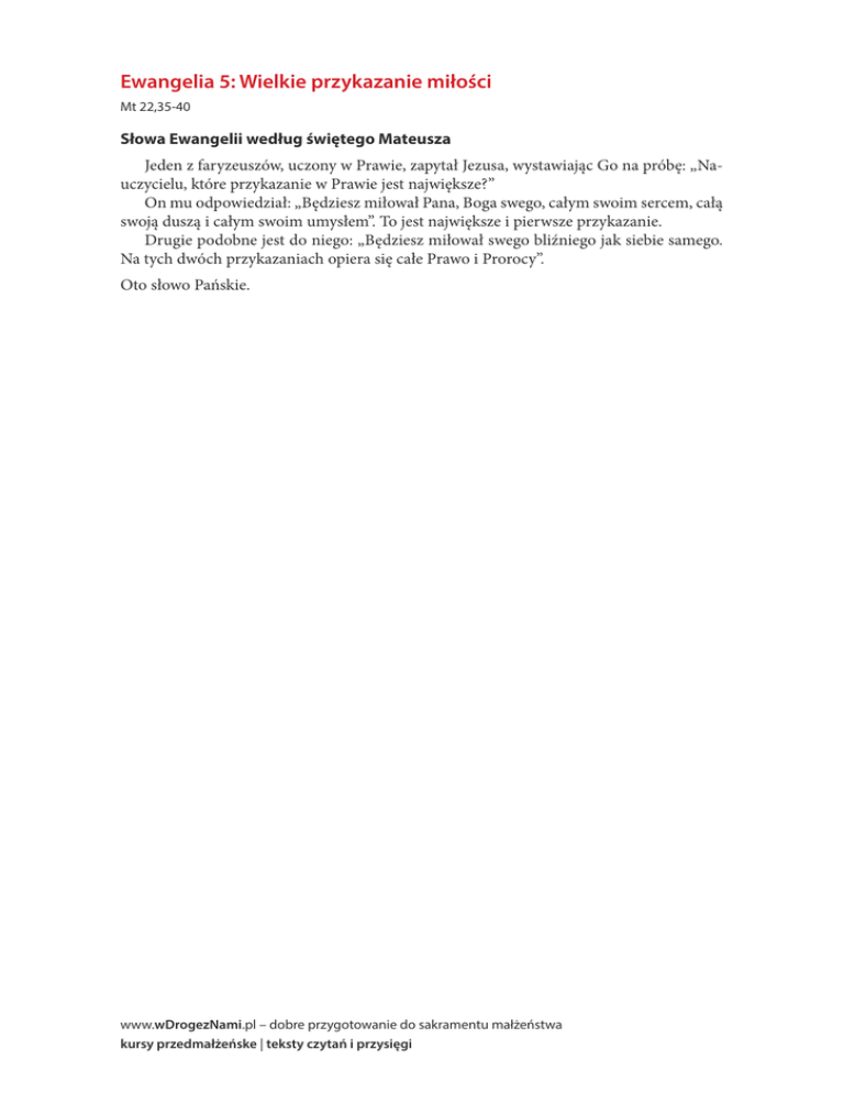 Ewangelia 5: Wielkie przykazanie miłości Mt 22,35-40 Słowa Ewangelii według świętego Mateusza Jeden z faryzeuszów, uczony w Prawie, zapytał Jezusa, wystawiając Go na próbę: „Nauczycielu, które przykazanie w Prawie jest największe?” On mu odpowiedział: „Będziesz miłował Pana, Boga swego, całym swoim sercem, całą swoją duszą i całym swoim umysłem”. To jest największe i pierwsze przykazanie. Drugie podobne jest do niego: „Będziesz miłował swego bliźniego jak siebie samego. Na tych dwóch przykazaniach opiera się całe Prawo i Prorocy”. Oto słowo Pańskie. www.wDrogezNami.pl – dobre przygotowanie do sakramentu małżeństwa kursy przedmałżeńske | teksty czytań i przysięgi