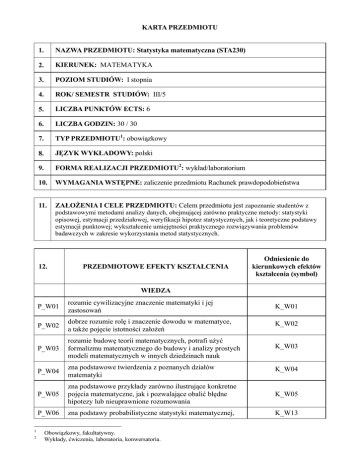 KARTA PRZEDMIOTU 1. NAZWA PRZEDMIOTU: Statystyka matematyczna (STA230) 2. KIERUNEK: MATEMATYKA 3. POZIOM STUDIÓW: I stopnia 4. ROK/ SEMESTR STUDIÓW: III/5 5. LICZBA PUNKTÓW ECTS: 6 6. LICZBA GODZIN: 30 / 30 7. TYP PRZEDMIOTU1: obowiązkowy 8. JĘZYK WYKŁADOWY: polski 9. FORMA REALIZACJI PRZEDMIOTU2: wykład/laboratorium 10. WYMAGANIA WSTĘPNE: zaliczenie przedmiotu Rachunek prawdopodobieństwa 11. ZAŁOŻENIA I CELE PRZEDMIOTU: Celem przedmiotu jest zapoznanie studentów z podstawowymi metodami analizy danych, obejmującej zarówno praktyczne metody: statystyki opisowej, estymacji przedziałowej, weryfikacji hipotez statystycznych, jak i teoretyczne podstawy estymacji punktowej; wykształcenie umiejętności praktycznego rozwiązywania problemów badawczych w zakresie wykorzystania metod statystycznych. 12. PRZEDMIOTOWE EFEKTY KSZTAŁCENIA Odniesienie do kierunkowych efektów kształcenia (symbol) WIEDZA 1 2 P_W01 rozumie cywilizacyjne znaczenie matematyki i jej zastosowań K_W01 P_W02 dobrze rozumie rolę i znaczenie dowodu w matematyce, a także pojęcie istotności założeń K_W02 P_W03 rozumie budowę teorii matematycznych, potrafi użyć formalizmu matematycznego do budowy i analizy prostych modeli matematycznych w innych dziedzinach nauk K_W03 P_W04 zna podstawowe twierdzenia z poznanych działów matematyki K_W04 P_W05 zna podstawowe przykłady zarówno ilustrujące konkretne pojęcia matematyczne, jak i pozwalające obalić błędne hipotezy lub nieuprawnione rozumowania K_W05 P_W06 zna podstawy probabilistyczne statystyki matematycznej, K_W13 Obowiązkowy, fakultatywny. Wykłady, ćwiczenia, laboratoria, konwersatoria. w szczególności podstawy teorii estymacji oraz weryfikacji hipotez statystycznych UMIEJĘTNOŚCI P_U01 potrafi w sposób zrozumiały, w mowie i na piśmie, przedstawiać poprawne rozumowania matematyczne, formułować twierdzenia i definicje K_U01 P_U02 posługuje się rachunkiem zdań i kwantyfikatorów i potrafi poprawnie używać go także w języku potocznym K_U02 P_U03 umie prowadzić łatwe i średnio trudne dowody metodą indukcji zupełnej; potrafi definiować funkcje i relacje rekurencyjne K_U03 P_U04 umie stosować system logiki klasycznej do formalizacji teorii matematycznych K_U04 P_U05 posługuje się językiem teorii mnogości, interpretując zagadnienia z różnych obszarów matematyki K_U06 P_U06 potrafi interpretować i wyjaśniać zależności funkcyjne, ujęte w postaci wzorów, tabel, wykresów, schematów i stosować je w zagadnieniach praktycznych K_U11 P_U07 umie wykorzystywać programy komputerowe w zakresie analizy danych K_U28 P_U08 umie badać podstawowe własności estymatorów parametrów rozkładu populacji oraz wyznaczać i interpretować podstawowe statystyki opisowe z próby K_U33 P_U09 umie przeprowadzić proste wnioskowanie statystyczne, także z wykorzystaniem programów komputerowych K_U34 P_U10 potrafi mówić o zagadnieniach matematycznych zrozumiałym, potocznym językiem K_U35 P_U11 potrafi posługiwać się wybranymi technikami statystycznej analizy wielowymiarowej K_U38 KOMPETENCJE SPOŁECZNE P_K01 ma świadomość ograniczenia poziomu swojej wiedzy i umiejętności, rozumie potrzebę ciągłego dokształcania się zawodowego i rozwoju osobistego, dokonuje samooceny własnych kompetencji i doskonali umiejętności, wyznacza kierunki własnego rozwoju i kształcenia K_K01 P_K02 potrafi precyzyjnie formułować pytania, służące pogłębieniu własnego zrozumienia danego tematu lub odnalezieniu brakujących elementów rozumowania K_K02 P_K03 potrafi formułować opinie na temat podstawowych zagadnień matematycznych K_K07 13. METODY OCENY EFEKTÓW KSZTAŁCENIA Symbol przedmiotowego efektu kształcenia Metody (sposoby) oceny3 Typ oceny4 Forma dokumentacji P_W02, P_W03, P_W04, P_W05, P_W06, P_U01, P_U02, P_U03, P_U04, P_U05, P_U06, P_U07, P_U08, P_U09, P_U10, P_U11, P_K02, P_K03 Ocenianie ciągłe, śródsemestralne zaliczenie w formie elektronicznej i pisemnej , końcowe zaliczenie w formie elektronicznej i pisemnej. Formująca P_W02, P_W03, P_W04, P_W05, P_W06, P_U01, P_U02, P_U03, P_U04, P_U05, P_U06, P_U07, P_U08, P_U09, P_U10, P_U11, P_K02, P_K03 Egzamin pisemny i w formie elektronicznej, egzamin ustny. Podsumowująca Egzamin w formie elektronicznej, pisemnej i ustnej. P_W01, P_K01 Kontrola obecności Kolokwia w formie elektronicznej i pisemnej. 14. KRYTERIA OCENY OSIĄGNIĘTYCH EFEKTÓW KSZTAŁCENIA (opisowe, procentowe, punktowe, inne ………………. formy oceny do wyboru przez wykładowcę) 3 4 EFEKTY KSZTAŁCENIA NA OCENĘ 3,0 NA OCENĘ 3,5 NA OCENĘ 4,0 NA OCENĘ 4,5 NA OCENĘ 5,0 P_W01, P_W02, P_W03, P_W04, P_W05, P_W06, P_U01, P_U02, P_U03, P_U04, P_U05, P_U06, P_U07, P_U08, P_U09, P_U10, P_U11, P_K01, P_K02, P_K03 50% - 59% 60% - 66% 67% - 76% 77% - 83% 84% - 100% Ocenianie ciągłe (bieżące przygotowanie do zajęć), śródsemestralne zaliczenie pisemne, śródsemestralne zaliczenie ustne, końcowe zaliczenia pisemne, końcowe zaliczenia ustne, egzamin pisemny, egzamin ustny, praca semestralna, ocena umiejętności ruchowych, praca dyplomowa, projekt, kontrola obecności Formująca, podsumowująca. 15. WARUNKI UZYSKANIA ZALICZENIA PRZEDMIOTU: Osiągnięcie założonych efektów kształcenia i pozytywny wynik: o zaliczenia o egzaminu pisemnego i w formie elektronicznej o egzaminu ustnego. 16. TREŚCI PROGRAMOWE Forma zajęć5 (liczba godz.) Treść zajęć Symbol przedmiotowych efektów kształcenia Wykłady Wykład (6 godz.) P_W01, P_W02, P_W03, P_W04, P_W05, P_W06, P_U01, P_U02, P_U03, P_U04, P_U05, P_U06, P_U07, P_U08, P_U10, P_K01, P_K02, P_K03 Wykład (10 godz.) P_W01, P_W02, P_W03, P_W04, P_W05, P_W06, P_U01, P_U02, P_U03, P_U04, P_U05, P_U06, P_U07, P_U08, P_U10, P_K01, P_K02, P_K03 Wykład (8 godz.) P_W01, P_W02, P_W03, P_W04, P_W05, P_W06, P_U01, P_U02, P_U03, P_U04, P_U05, P_U06, P_U07, P_U08, P_U09, P_U10, P_K01, P_K02, P_K03 Wykład (6 godz.) P_W01, P_W02, P_W03, P_W04, P_W05, P_W06, P_