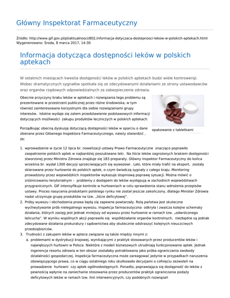 Główny Inspektorat Farmaceutyczny Źródło: http://www.gif.gov.pl/pl/aktualnosci/802,Informacja-dotyczaca-dostepnosci-lekow-w-polskich-aptekach.html Wygenerowano: Środa, 8 marca 2017, 14:30 Informacja dotycząca dostępności leków w polskich aptekach W ostatnich miesiącach kwestia dostępności leków w polskich aptekach budzi wiele kontrowersji. Wobec dramatycznych sygnałów spotkała się ze zdecydowanymi działaniami ze strony ustawodawców oraz organów rządowych odpowiedzialnych za zabezpieczenie zdrowia. Obecnie przyczyny braku leków w aptekach i rozwiązania tego problemu są prezentowane w przestrzeni publicznej przez różne środowiska, w tym również zainteresowane korzystnymi dla siebie rozwiązaniami grupy interesów. Istotne wydaje się zatem przedstawienie podstawowych informacji dotyczących możliwości zakupu produktów leczniczych w polskich aptekach. Porządkując obecną dyskusję dotyczącą dostępności leków w oparciu o dane zbierane przez Głównego Inspektora Farmaceutycznego, należy stwierdzić , opakowanie z tabletkami że: 1. wprowadzenie w życie 12 lipca br. nowelizacji ustawy Prawo Farmaceutyczne znacząco poprawiło zaopatrzenie polskich aptek w najbardziej poszukiwane leki. Na liście leków zagrożonych brakiem dostępności stworzonej przez Ministra Zdrowia znajduje się 183 preparaty. Główny Inspektor Farmaceutyczny do końca września br. wydał 1300 decyzji sprzeciwiających się wywozowi . Leki, które miały trafić na eksport, zostały skierowane przez hurtownie do polskich aptek, o czym świadczą sygnały z całego kraju. Monitoring prowadzony przez wojewódzkich inspektorów wykazuje stopniową poprawę sytuacji. Można mówić o zróżnicowaniu terytorialnym – problemy z dostępem do leków występują w zachodnich województwach przygranicznych. GIF intensyfikuje kontrole w hurtowniach w celu sprawdzenia stanu wdrożenia przepisów ustawy. Proces nasycenia produktami polskiego rynku nie został jeszcze zakończony, dlatego Minister Zdrowia nadal utrzymuje grupę produktów na tzw. „liście deficytowej”. 2. Próby wywozu i obchodzenia prawa będą się zapewne powtarzały. Rolą państwa jest skuteczne wychwytywanie prób nielegalnego wywozu. Inspekcja farmaceutyczna odkryła i zwalcza kolejne schematy działania, których zasięg jest jednak mniejszy od wywozu przez hurtownie w ramach tzw. „odwróconego łańcucha”. W wyniku wspólnych akcji poprawiło się współdziałanie organów kontrolnych, niezbędne są jednak zdecydowane działania prokuratury i sądownictwa aby skutecznie odstraszyć kolejnych nieuczciwych przedsiębiorców. 3. Trudności z zakupem leków w aptece związane są także między innymi z: a. problemami w dystrybucji krajowej, wynikającymi z praktyk stosowanych przez producentów leków i największych hurtowni w Polsce. Niektóre z modeli biznesowych utrudniają funkcjonowanie aptek. Jednak ingerencja resortu zdrowia w ten obszar zostałaby potraktowana jako próba ograniczania swobody działalności gospodarczej. Inspekcja farmaceutyczna może zareagować jedynie w przypadkach naruszenia obowiązującego prawa, co w ciągu ostatniego roku skutkowało decyzjami o cofnięciu zezwoleń na prowadzenie hurtowni czy aptek ogólnodostępnych. Ponadto, poprawiająca się dostępność do leków z pewnością wpłynie na zaniechanie stosowania przez producentów praktyk ograniczania podaży deficytowych leków w ramach tzw. linii interwencyjnych, czy podobnych rozwiązań b. niechęcią właścicieli aptek do magazynowania drogich produktów, których sprzedaż zagrożona jest dużym ryzykiem straty finansowej. Magazynowanie pełnego asortymentu wszystkich leków (10 000 pozycji) w każdej aptece prowadziłoby do dużych strat i konieczności utylizacji przeterminowanych produktów, w miejscach, gdzie pacjenci nie korzystają z konkretnej grupy produktów. W trakcie praktyki biznesowej aptekarze nauczyli się specyfiki swojej lokalizacji i najczęściej występujących schorzeń. W związku z tym nie w każdej aptece w Polsce pacjent może otrzymać pełen asortyment leków np.: leki specjalistyczne są zazwyczaj sprzedawane w pobliżu placówek specjalistycznych, w których lekarze ordynują c. niechęcią do stosowania leków – zamienników. Proponowane przez farmaceutów tańsze zamienniki deficytowych leków nie zawsze są akceptowane przez pacjentów. Ponadto stosowanie leków – zamienników ograniczane jest przez lekarską ordynację: „nie zamieniać”. Środowisko ekspertów skupione wokół Ministra Zdrowia przygotowuje projekt ustawy o zawodzie farmaceuty, koncentrującej się wokół wdrożenia idei opieki farmaceutycznej. W założeniach ustawy mają pojawić się zapisy, w których podstawowym mechanizmem konkurencyjności będzie poziom obsługi pacjenta, a nie stosowanie dyskryminujących modeli biznesowych, wykluczających obecnie funkcjonujące placówki obrotu detalicznego lekami. Wobec powyższych wyjaśnień, tytuł w Gazecie Wyborczej z dnia 5.10.2015. „CHOROBLIWY BRAK LEKÓW” jest krzywdzący, niesprawiedliwy i nie oddający rzeczywistości. ZAŁĄCZNIKI DO STRONY Informacja dotycząca dostępności leków w polskich aptekach (pdf,309.52 KB)