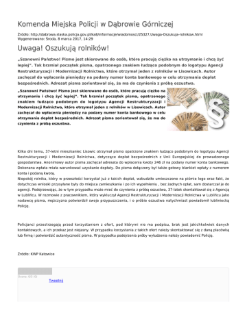 Komenda Miejska Policji w Dąbrowie Górniczej Źródło: http://dabrowa.slaska.policja.gov.pl/ka8/informacje/wiadomosci/25327,Uwaga-Oszukuja-rolnikow.html Wygenerowano: Środa, 8 marca 2017, 14:29 Uwaga! Oszukują rolników! „Szanowni Państwo! Pismo jest skierowane do osób, które pracują ciężko na utrzymanie i chcą żyć lepiej”. Tak brzmiał początek pisma, opatrzonego znakiem łudząco podobnym do logotypu Agencji Restrukturyzacji i Modernizacji Rolnictwa, które otrzymał jeden z rolników w Lisowicach. Autor zachęcał do wpłacenia pieniędzy na podany numer konta bankowego w celu otrzymania dopłat bezpośrednich. Adresat pisma zorientował się, że ma do czynienia z próbą oszustwa. „Szanowni Państwo! Pismo jest skierowane do osób, które pracują ciężko na utrzymanie i chcą żyć lepiej”. Tak brzmiał początek pisma, opatrzonego znakiem łudząco podobnym do logotypu Agencji Restrukturyzacji i Modernizacji Rolnictwa, które otrzymał jeden z rolników w Lisowicach. Autor zachęcał do wpłacenia pieniędzy na podany numer konta bankowego w celu otrzymania dopłat bezpośrednich. Adresat pisma zorientował się, że ma do czynienia z próbą oszustwa. Kilka dni temu, 37-letni mieszkaniec Lisowic otrzymał pismo opatrzone znakiem łudząco podobnym do logotypu Agencji Restrukturyzacji i Modernizacji Rolnictwa, dotyczące dopłat bezpośrednich z Unii Europejskiej do prowadzonego gospodarstwa. Anonimowy autor pisma zachęcał adresata do wpłacenia kwoty 246 zł na podany numer konta bankowego. Dokonana wpłata miała warunkować uzyskanie dopłaty. Do pisma dołączony był także gotowy blankiet wpłaty z numerem konta i podaną kwotą. Niepokój rolnika, który w przeszłości korzystał już z takich dopłat, wzbudziło umieszczone na piśmie logo oraz fakt, że dotychczas wnioski przysyłane były do miejsca zamieszkania i po ich wypełnieniu , bez żadnych opłat, sam dostarczał je do agencji. Podejrzewając, że w tym przypadku może mieć do czynienia z próbą oszustwa, 37-latek skontaktował się z Agencją w Lublińcu. W rozmowie z pracownikiem, który wykluczył Agencji Restrukturyzacji i Modernizacji Rolnictwa w Lublińcu jako nadawcę pisma, mężczyzna potwierdził swoje przypuszczenia, i o próbie oszustwa natychmiast powiadomił lubliniecką Policję. Policjanci przestrzegają przed korzystaniem z ofert, pod którymi nie ma podpisu, brak jest jakichkolwiek danych kontaktowych, a ich przekaz jest niejasny. W przypadku korzystania z takich ofert należy skontaktować się z daną placówką lub firmą i potwierdzić autentyczność pisma. W przypadku podejrzenia próby wyłudzenia należy powiadomić Policję. Źródło: KWP Katowice Ocena: 0/5 (0) Tweetnij