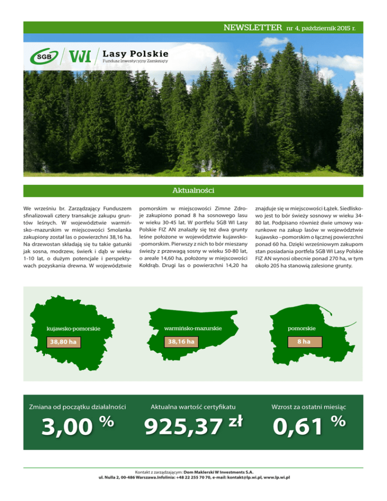 NEWSLETTER nr 4, październik 2015 r. Aktualności We wrześniu br. Zarządzający Funduszem sfinalizowali cztery transakcje zakupu gruntów leśnych. W województwie warmińsko–mazurskim w miejscowości Smolanka zakupiony został las o powierzchni 38,16 ha. Na drzewostan składają się tu takie gatunki jak sosna, modrzew, świerk i dąb w wieku 1-10 lat, o dużym potencjale i perspektywach pozyskania drewna. W województwie kujawsko-pomorskie pomorskim w miejscowości Zimne Zdroje zakupiono ponad 8 ha sosnowego lasu w wieku 30-45 lat. W portfelu SGB WI Lasy Polskie FIZ AN znalazły się też dwa grunty leśne położone w województwie kujawsko-pomorskim. Pierwszy z nich to bór mieszany świeży z przewagą sosny w wieku 50-80 lat, o areale 14,60 ha, położony w miejscowości Kołdrąb. Drugi las o powierzchni 14,20 ha warmińsko-mazurskie znajduje się w miejscowości Łążek. Siedliskowo jest to bór świeży sosnowy w wieku 3480 lat. Podpisano również dwie umowy warunkowe na zakup lasów w województwie kujawsko –pomorskim o łącznej powierzchni ponad 60 ha. Dzięki wrześniowym zakupom stan posiadania portfela SGB WI Lasy Polskie FIZ AN wynosi obecnie ponad 270 ha, w tym około 205 ha stanowią zalesione grunty. pomorskie 38,16 ha 38,80 ha Zmiana od początku działalności 3,00 % Aktualna wartość certyfikatu 925,37 zł 8 ha Wzrost za ostatni miesiąc 0,61 % Kontakt z zarządzającym: Dom Maklerski W Investments S.A. ul. Nulla 2, 00-486 Warszawa.Infolinia: +48 22 255 70 70, e-mail: [email protected], www.lp.wi.pl Plany na przyszłość Zarządzający Funduszem SGB WI Lasy Polskie FIZ AN aktualnie finalizuje zakup następujących zasobów leśnych: Województwo Powiat Pow. w ha Opis nieruchomości/lasu/uprawy małopolska gorlicki 19,08 Las mieszany: sosna, brzoza, jodła w wieku 50-75 lat kujawskopomorskie toruński 23,6 Las sosnowy w wieku 45-50 lat pomorskie kościerski 62,15 Las sosnowy w wieku 50-90 lat lubelskie włodawski 22,5 Las olchowy w wieku 40-60 lat łódzkie piotrkowski 11,09 Las sosnowy w wieku 35-40 lat pomorskie gdański 14,44 Na powierzchni 9 ha las mieszany w wieku 30-70 lat, na ok. 5 ha las świerkowy w wieku 25 lat podkarpackie krośnieński 20,19 Las mieszany w wieku 30-40 lat pomorskie sztumski 27,76 Las mieszany: sosna, brzoza, olsza, modrzew, dąb w wieku 20-70 lat zachodniopomorskie szczecinecki 19,21 Las mieszany sosnowo-brzozowy w wieku 40-60 lat lubuskie międzyrzecki 23,63 Las mieszany iglasto-liściasty, w wieku 30-60lat RAZEM 243,65 ha Ustawa o zmianie ustawy o lasach - Komentarz Zarządzającego 25 września br. Sejm RP znowelizował ustawę o lasach, mającą zabezpieczać lasy należące do Skarbu Państwa przed prywatyzacją. Ustawa dopuszcza możliwość sprzedaży lasów, ale tylko w celu realizacji inwestycji publicznych, np. dróg, bądź zrównoważonej polityki leśnej. Na początku października ustawa została zaakceptowana przez Senat. Nowela czeka na podpis prezydenta. Ustawa dotyczy tylko i wyłącznie zasobów leśnych bę- dących własnością Lasów Państwowych i jej zapisy nie będą miały wpływu na właścicieli prywatnych lasów oraz na funkcjonowanie Funduszu SGB WI Lasy Polskie FIZ AN. Plany zakupowe i zasoby Banku ziemi SGB WI Lasy Polskie FIZ AN Sitno – 19,21 ha drzewostan w wieku 40-60 lat Świechocin 23,63 ha Uście Gorlickie – 19,08 ha drzewostan w wieku 30-60 lat drzewostan wieku 50-75 lat WIERZCHUCICE ZIMNE ZDROJE drzewostan w wieku 40-60 lat SMOLANKA 38,16 HA POZORTY 16,75 GAJEWO 21,67 Wołczyny 22,5 ha ZALESIE 6,76 ha ŁĄŻEK 14,20 HA NAREJKI 30 ha KOŁACZ 13,64 NOWY DWÓR 16,33 ha Puławy – 20,19 ha LUBASZ 13,91 ha drzewostan w wieku 30-40 lat KOŁDRĄB 14,61 HA LEŚNICZÓWKA 15,77 ZDZIECHOWICE 32,70 Piechowice – 62,15 ha drzewostan w wieku 50-90 lat zakupione grunty planowane zakupy województwo, w którym fundusz posiada grunty województwo, w którym fundusz nie posiada gruntów Nowy Targ – 27,76 ha Michalin – 14,44 ha drzewostan w wieku 20-70 lat drzewostan w wieku 30-70 lat Nota prawna Niniejszy dokument służy wyłącznie celom informacyjnym i nie stanowi oferty, rekomendacji ani doradztwa inwestycyjnego. Wszelkie informacje dotyczące planów, oczekiwań, strategii, czy polityki inwestycyjnej stanowią odzwierciedlenie wiedzy i oczekiwań autora na moment sporządzenia niniejszego dokumentu, w związku z czym mogą one ulec, zmianie w zależności od rozwoju sytuacji na rynkach finansowych. W takim przypadku Dom Maklerski W Investments S.A. (DM WI SA) nie będzie zobowiązane do poinformowania uczestnika funduszu o zmianach, w tym także nie będzie zobowiązane do przesłania nowego dokumentu. Inwestowanie w fundusze inwestycyjne związane jest z ryzykiem i uczestnik powinien liczyć się z utratą zainwestowanych środków, a historyczne stopy zwrotu funduszu nie stanowią gwarancji osiągnięcia podobnych wyników w przyszłości. Fundusz nie gwarantuje osiągnięcia celu inwestycyjnego i oczekiwanej przez DM WISA stopy zwrotu. Prognozowane przyszłe stopy zwrotu oparte są na uzasadnionych założeniach wynikających z obiektywnych danych oraz nie są oparte na symulacji wyników w przeszłości ani nie odwołują się do takiej symulacji. Żadna z informacji przedstawionych powyżej nie uchyla ani ogranicza informacji na temat ryzyk i polityki inwestycyjnej funduszu zamieszczonych w przepisach prawa oraz właściwych dokumentach, w tym w szczególności w statucie i warunkach emisji. Jedynymi prawnie wiążącymi dokumentami są statut Funduszu oraz warunki emisji certyfikatów inwestycyjnych. W powyższych dokumentach inwestor znajdzie m.in. opis czynników ryzyka związanego z inwestowaniem oraz prawa i obowiązki wynikające z uczestnictwa w Funduszu. Przed nabyciem certyfikatów inwestycyjnych należy dokładnie zapoznać się z treścią warunków emisji certyfikatów inwestycyjnych oraz statutu Funduszu. W razie jakichkolwiek wątpliwości należy zasięgnąć kwalifikowa