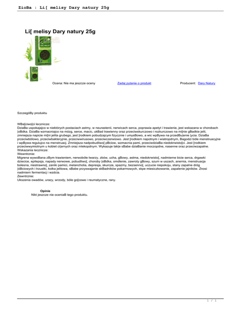 ZioBa : Li[ melisy Dary natury 25g Li[ melisy Dary natury 25g Ocena: Nie ma jeszcze oceny Zadaj pytanie o produkt Producent: Dary Natury SzczegóBy produktu WBa[ciwo[ci lecznicze: DziaBa uspokajajco w niektórych postaciach astmy, w neurastenii, nerwicach serca, poprawia apetyt i trawienie, jest wskazana w chorobach |oBdka. DziaBa wzmacniajco na mózg, serce, macic, ukBad trawienny oraz przeciwskurczowo i rozkurczowo na mi[nie gBadkie jelit, zmniejsza napicie mi[ni jelita grubego, jest [rodkiem pobudzajcym fizycznie i umysBowo, a wic wpBywa na przedBu|enie |ycia. DziaBa przeciwbólowo, przeciwbakteryjnie, przeciwwirusowo, przeciwczerwiowo. Jest [rodkiem napotnym i wiatropdnym, Bagodzi bóle menstruacyjne i wpBywa regulujco na menstruacj. Zmniejsza nadpobudliwo[ pBciow, wzmacnia pami, przeciwdziaBa niedokrwisto[ci. Jest [rodkiem przeciwwymiotnym u kobiet ci|arnych oraz mlekopdnym. Wykazuje tak|e sBabe dziaBanie moczopdne, nasenne oraz przeciwzapalne. Wskazania lecznicze: Wewntrznie: Migrena wywoBana zBym trawieniem, nerwobóle twarzy, zbów, ucha, gBowy, astma, niedokrwisto[, nadmierne bicie serca, drgawki dziecice, epilepsja, napady nerwowe, pobudliwo[, choroby |oBdka, omdlenie, zawroty gBowy, szum w uszach, anemia, menstruacja bolesna, niestrawno[, zaniki pamici, melancholia, depresja, skurcze, spazmy, bezsenno[, uczucie niepokoju, stany zapalne dróg |óBciowych i trzustki, kolka jelitowa, sBabe przyswajanie skBadników pokarmowych, skpe miesiczkowanie, zapalenie jajników. Znosi nadmiern fermentacj i wzdcia. Zewntrznie: Ukszenia owadów, urazy, wrzody, bóle go[cowe i reumatyczne, rany. Opinie Nikt jeszcze nie oceniaB tego produktu. 1 / 1