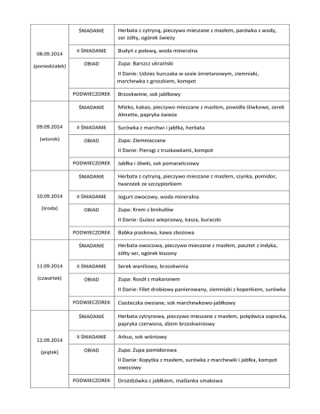 ŚNIADANIE 08.09.2014 (poniedziałek) II ŚNIADANIE OBIAD Herbata z cytryną, pieczywo mieszane z masłem, parówka z wody, ser żółty, ogórek świeży Budyń z polewą, woda mineralna Zupa: Barszcz ukraiński II Danie: Udziec kurczaka w sosie śmietanowym, ziemniaki, marchewka z groszkiem, kompot PODWIECZOREK ŚNIADANIE 09.09.2014 II ŚNIADANIE (wtorek) OBIAD Brzoskwinie, sok jabłkowy Mleko, kakao, pieczywo mieszane z masłem, powidła śliwkowe, serek Almette, papryka świeża Surówka z marchwi i jabłka, herbata Zupa: Ziemniaczana II Danie: Pierogi z truskawkami, kompot PODWIECZOREK ŚNIADANIE 10.09.2014 II ŚNIADANIE (środa) OBIAD Jabłka i śliwki, sok pomarańczowy Herbata z cytryną, pieczywo mieszane z masłem, szynka, pomidor, twarożek ze szczypiorkiem Jogurt owocowy, woda mineralna Zupa: Krem z brokułów II Danie: Gulasz wieprzowy, kasza, buraczki PODWIECZOREK ŚNIADANIE 11.09.2014 II ŚNIADANIE (czwartek) OBIAD Babka piaskowa, kawa zbożowa Herbata owocowa, pieczywo mieszane z masłem, pasztet z indyka, żółty ser, ogórek kiszony Serek waniliowy, brzoskwinia Zupa: Rosół z makaronem II Danie: Filet drobiowy panierowany, ziemniaki z koperkiem, surówka PODWIECZOREK ŚNIADANIE 12.09.2014 (piątek) II ŚNIADANIE OBIAD Ciasteczka owsiane, sok marchewkowo-jabłkowy Herbata cytrynowa, pieczywo mieszane z masłem, polędwica sopocka, papryka czerwona, dżem brzoskwiniowy Arbuz, sok wiśniowy Zupa: Zupa pomidorowa II Danie: Kopytka z masłem, surówka z marchewki i jabłka, kompot owocowy PODWIECZOREK Drożdżówka z jabłkiem, maślanka smakowa