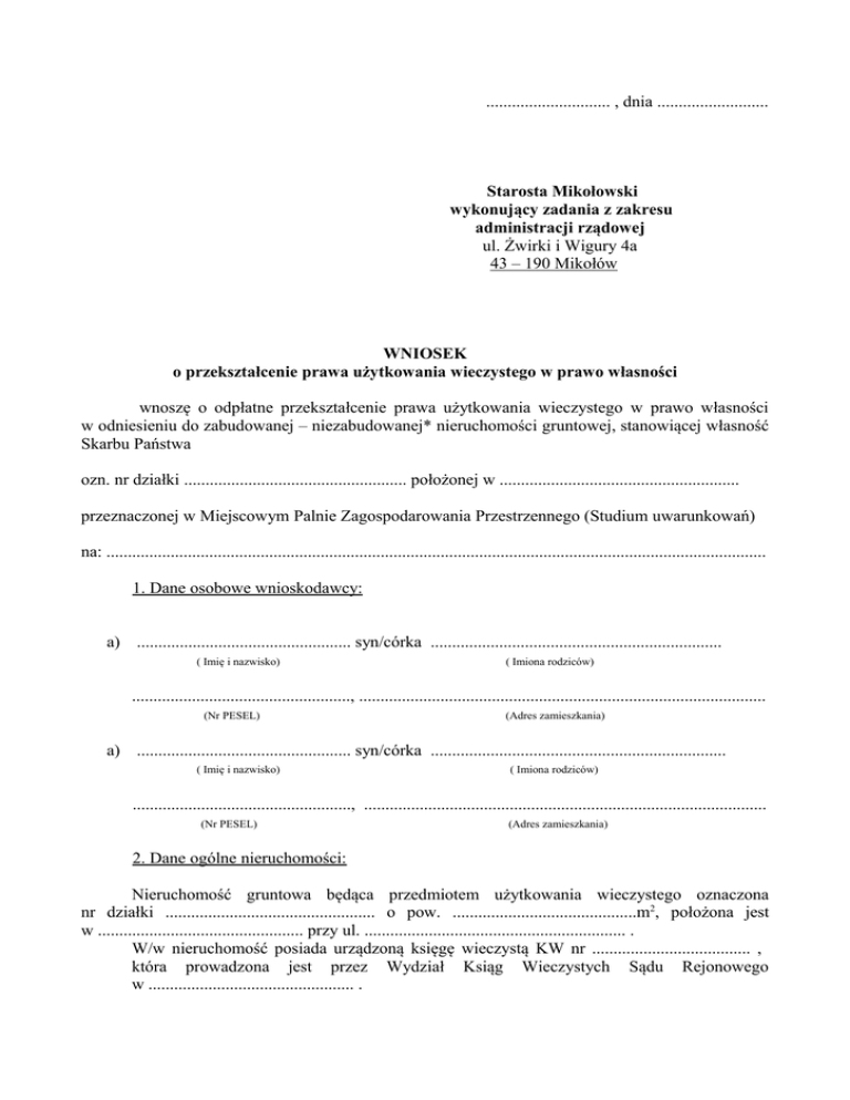 ............................. , dnia .......................... Starosta Mikołowski wykonujący zadania z zakresu administracji rządowej ul. Żwirki i Wigury 4a 43 – 190 Mikołów WNIOSEK o przekształcenie prawa użytkowania wieczystego w prawo własności wnoszę o odpłatne przekształcenie prawa użytkowania wieczystego w prawo własności w odniesieniu do zabudowanej – niezabudowanej* nieruchomości gruntowej, stanowiącej własność Skarbu Państwa ozn. nr działki .................................................... położonej w ........................................................ przeznaczonej w Miejscowym Palnie Zagospodarowania Przestrzennego (Studium uwarunkowań) na: .......................................................................................................................................................... 1. Dane osobowe wnioskodawcy: a) .................................................. syn/córka .................................................................... ( Imię i nazwisko) ( Imiona rodziców) ..................................................., ............................................................................................... (Nr PESEL) (Adres zamieszkania) a) .................................................. syn/córka ..................................................................... ( Imię i nazwisko) ( Imiona rodziców) ..................................................., .............................................................................................. (Nr PESEL) (Adres zamieszkania) 2. Dane ogólne nieruchomości: Nieruchomość gruntowa będąca przedmiotem użytkowania wieczystego oznaczona nr działki ................................................. o pow. ...........................................m2, położona jest w ................................................ przy ul. ............................................................. . W/w nieruchomość posiada urządzoną księgę wieczystą KW nr ..................................... , która prowadzona jest przez Wydział Ksiąg Wieczystych Sądu Rejonowego w ................................................ . 3. Dane prawne o nieruchomości: Okres trwania prawa użytkowania wieczystego przez wnioskodawcę i jego poprzedników prawnych do dnia wejścia w życie ustawy wynosi ........................ lat. a) na w/w nieruchomość gruntową prawo użytkowania wieczystego ustanowione zostało na podstawie : ................................................................................................................................. (aktu notarialnego, decyzji administracyjnej, orzeczenia sądu itp.) z dnia .................................................... dla ........................................................... . a) Prawo użytkowania wieczystego w/w nieruchomości nabyte zostało przez wnioskodawcę ........................................................................................................................... (podać szczegółowe dane o poprzednim użytkowniku) 4. Opłata roczna za użytkowanie wieczyste za przedmiotową nieruchomość gruntową wynosiła ...................................... zł. Ustaloną opłatę za przekształcenie prawa użytkowania wieczystego w prawo własności wpłacę jednorazowo/w ratach*. 5. Nieodpłatne ustanowienie prawa własności na w/w nieruchomość uzasadniam następującymi przesłankami: .................................................................................................................................................... .................................................................................................................................................... .................................................................................................................................................... (wymienić podstawy uzasadniające bezpłatne nabycie prawa własności) 6. Inne informacje o przedmiotowej nieruchomości: .................................................................................................................................................... .................................................................................................................................................... .................................................................................................................................................... (opisać charakter nieruchomości) 7. Oświadczenie użytkownika: Oświadczam, że zobowiązuję się do pokrycia kosztów operatu szacunkowego potrzebnego dookreślenia wartości gruntu. Przyjmuję do wiadomości, że w przypadku rezygnacji z wykupu koszty sporządzenia operatu szacunkowego nie podlegają zwrotowi. .......................................................................... (Podpisy wnioskodawców) Załączniki: • Aktualny odpis z księgi wieczystej *) niepotrzebne skreślić