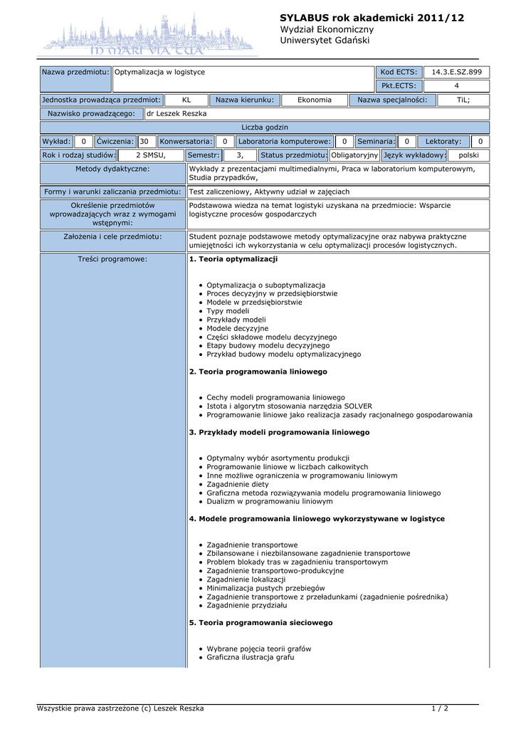 SYLABUS rok akademicki 2011/12 Wydział Ekonomiczny Uniwersytet Gdański Nazwa przedmiotu: Optymalizacja w logistyce Jednostka prowadząca przedmiot: Nazwisko prowadzącego: KL Nazwa kierunku: Ekonomia Kod ECTS: 14.3.E.SZ.899 Pkt.ECTS: 4 Nazwa specjalności: TiL; dr Leszek Reszka Liczba godzin Wykład: 0 Ćwiczenia: 30 Rok i rodzaj studiów: Konwersatoria: 2 SMSU, Metody dydaktyczne: Formy i warunki zaliczania przedmiotu: Określenie przedmiotów wprowadzających wraz z wymogami wstępnymi: Założenia i cele przedmiotu: Treści programowe: Semestr: 0 Laboratoria komputerowe: 3, 0 Seminaria: 0 Lektoraty: Status przedmiotu: Obligatoryjny Język wykładowy: polski Wykłady z prezentacjami multimedialnymi, Praca w laboratorium komputerowym, Studia przypadków, Test zaliczeniowy, Aktywny udział w zajęciach Podstawowa wiedza na temat logistyki uzyskana na przedmiocie: Wsparcie logistyczne procesów gospodarczych Student poznaje podstawowe metody optymalizacyjne oraz nabywa praktyczne umiejętności ich wykorzystania w celu optymalizacji procesów logistycznych. 1. Teoria optymalizacji Optymalizacja o suboptymalizacja Proces decyzyjny w przedsiębiorstwie Modele w przedsiębiorstwie Typy modeli Przykłady modeli Modele decyzyjne Części składowe modelu decyzyjnego Etapy budowy modelu decyzyjnego Przykład budowy modelu optymalizacyjnego 2. Teoria programowania liniowego Cechy modeli programowania liniowego Istota i algorytm stosowania narzędzia SOLVER Programowanie liniowe jako realizacja zasady racjonalnego gospodarowania 3. Przykłady modeli programowania liniowego Optymalny wybór asortymentu produkcji Programowanie liniowe w liczbach całkowitych Inne możliwe ograniczenia w programowaniu liniowym Zagadnienie diety Graficzna metoda rozwiązywania modelu programowania liniowego Dualizm w programowaniu liniowym 4. Modele programowania liniowego wykorzystywane w logistyce Zagadnienie transportowe Zbilansowane i niezbilansowane zagadnienie transportowe Problem blokady tras w zagadnieniu transportowym Zagadnienie transportowo-produkcyjne Zagadnienie lokalizacji Minimalizacja pustych przebiegów Zagadnienie transportowe z przeładunkami (zagadnienie pośrednika) Zagadnienie przydziału 5. Teoria programowania sieciowego Wybrane pojęcia teorii grafów Graficzna ilustracja grafu Wszystkie prawa zastrzeżone (c) Leszek Reszka 1/2 0 SYLABUS rok akademicki 2011/12 Wydział Ekonomiczny Uniwersytet Gdański 6. Przykłady modeli programowania sieciowego Model transportowy z przeładunkami Model najkrótszej trasy Model maksymalnego przepływu 7. Teoria programowania nieliniowego Cechy modeli programowania nieliniowego 8. Przykłady modeli programowania nieliniowego Modele z nieliniową funkcją celu Modele z nieliniowymi warunkami ograniczającymi Wykaz literatury podstawowej i uzupełniającej: Lektury obowiązkowe: M. Chaberek: Makro- i mikroekonomiczne aspekty wsparcia logistycznego. Wydawnictwo Uniwersytetu Gdańskiego Gdansk 2002. J. W. Wiśniewski: Instrumenty decyzyjne przedsiębiorcy. Instytut Wydawniczy, GRAVIS, Toruń 2002. Lektury uzupełniające: L. Reszka: Optymalizacja wykorzystania wykwalifikowanych zasobów kadrowych firm globalnych jako przykład funkcji wsparcia logistycznego [W:] M. Duczmal (red.): Wymiary globalizacji. Aspekty społeczno-ekonomiczne. Wydawnictwa Wyższej Szkoły Zarządzania i Administracji w Opolu, Opole 2002. L. Reszka: Optymalizacja hurtowej sieci dystrybucyjnej jako zadanie logistyczne [W:] Rucińska D. (red.): Zeszyty Naukowe Uniwersytetu Gdańskiego. Ekonomika Transportu Lądowego. Nr 24 . Wydawnictwo Uniwersytetu Gdańskiego Gdansk 2003. Kontakt: [email protected], Wszystkie prawa zastrzeżone (c) Leszek Reszka 2/2