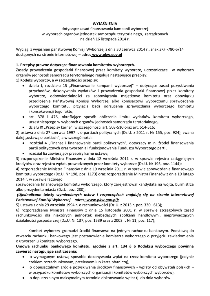 WYJAŚNIENIA dotyczące zasad finansowania kampanii wyborczej w wyborach organów jednostek samorządu terytorialnego, zarządzonych na dzień 16 listopada 2014 r. Wyciąg z wyjaśnień państwowej Komisji Wyborczej z dnia 30 czerwca 2014 r., znak ZKF -780-5/14 dostępnych na stronie internetowej – adres www.pkw.gov.pl 1. Przepisy prawne dotyczące finansowania komitetów wyborczych. Zasady prowadzenia gospodarki finansowej przez komitety wyborcze, uczestniczące w wyborach organów jednostek samorządu terytorialnego regulują następujące przepisy: 1) Kodeks wyborczy, a w szczególności przepisy: działu I, rozdziału 15 „Finansowanie kampanii wyborczej” – dotyczące zasad pozyskiwania przychodów, dokonywania wydatków i prowadzenia gospodarki finansowej przez komitety wyborcze, odpowiedzialności za zobowiązania majątkowe komitetu oraz obowiązku przedłożenia Państwowej Komisji Wyborczej albo komisarzowi wyborczemu sprawozdania wyborczego komitetu, przyjęcia bądź odrzucenia sprawozdania wyborczego komitetu i konsekwencji tego faktu, art. 378 i 476, określające sposób obliczania limitu wydatków komitetu wyborczego, uczestniczącego w wyborach organów jednostek samorządu terytorialnego, działu IX „Przepisy karne”, w szczególności art. 503-510 oraz art. 514-516; 2) ustawa z dnia 27 czerwca 1997 r. o partiach politycznych (Dz.U. z 2011 r. Nr 155, poz. 924), zwana dalej „ustawą o partiach”, a w szczególności: rozdział 4 „Finanse i finansowanie partii politycznych”, dotyczący m.in. źródeł finansowania partii politycznych oraz tworzenia i funkcjonowania Funduszu Wyborczego partii, rozdział 6a zawierający przepisy karne ustawy; 3) rozporządzenie Ministra Finansów z dnia 12 września 2011 r. w sprawie rejestru zaciągniętych kredytów oraz rejestru wpłat, prowadzonych przez komitety wyborcze (Dz.U. Nr 193, poz. 1144); 4) rozporządzenie Ministra Finansów z dnia 19 września 2011 r. w sprawie sprawozdania finansowego komitetu wyborczego (Dz.U. Nr 198, poz. 1173) oraz rozporządzenie Ministra Finansów z dnia 19 lutego 2014 r. w sprawie łącznego sprawozdania finansowego komitetu wyborczego, który zarejestrował kandydata na wójta, burmistrza albo prezydenta miasta (Dz.U. poz. 280); (Ujednolicone teksty wymienionych ustaw i rozporządzeń znajdują się na stronie internetowej Państwowej Komisji Wyborczej – adres: www.pkw.gov.pl); 5) ustawa z dnia 29 września 1994 r. o rachunkowości (Dz.U. z 2013 r. poz. 330 i 613); 6) rozporządzenie Ministra Finansów z dnia 15 listopada 2001 r. w sprawie szczególnych zasad rachunkowości dla niektórych jednostek niebędących spółkami handlowymi, nieprowadzących działalności gospodarczej (Dz.U. Nr 137, poz. 1539 oraz z 2003 r. Nr 11, poz. 117); Komitet wyborczy gromadzi środki finansowe na jednym rachunku bankowym. Podstawą do otwarcia rachunku bankowego jest postanowienie komisarza wyborczego o przyjęciu zawiadomienia o utworzeniu komitetu wyborczego. Umowa rachunku bankowego komitetu, zgodnie z art. 134 § 6 Kodeksu wyborczego powinna zawierać następujące zastrzeżenia: o wymaganym ustawą sposobie dokonywania wpłat na rzecz komitetu wyborczego (jedynie czekiem rozrachunkowym, przelewem lub kartą płatniczą), o dopuszczalnym źródle pozyskiwania środków finansowych - wpłaty od obywateli polskich – w przypadku komitetów wyborczych organizacji i komitetów wyborczych wyborców), o dopuszczalnym maksymalnym terminie dokonywania wpłat tj. do dnia wyborów. Pełnomocnik finansowy, który nie wprowadza do umowy rachunku bankowego komitetu zastrzeżeń określonych w art. 134 § 6 Kodeksu wyborczego popełnia wykroczenie, określone w art. 505 § 2 tegoż Kodeksu. Przepisy Kodeksu wyborczego wprowadzają następujące zakazy i ograniczenia w finansowaniu komitetów wyborczych: 1) komitety wyborcze mogą pozyskiwać środki finansowe jedynie na cele związane z wyborami (art. 129 § 1 Kodeksu wyborczego); 2) pozyskiwanie środków finansowych jest dozwolone dopiero od dnia wydania przez właściwy organ wyborczy postanowienia o przyjęciu zawiadomienia o utworzeniu komitetu wyborczego (art. 129 § 2 pkt 1 Kodeksu wyborczego); 3) zabronione jest pozyskiwanie środków po dniu wyborów (art. 129 § 2 pkt 2 Kodeksu wyborczego ) Pełnomocnik finansowy komitetu wyborczego ma obowiązek sporządzenia i przedłożenia organowi wyborczemu, który przyjął zawiadomienie o jego utworzeniu sprawozdania o przychodach, wydatkach i zobowiązaniach finansowych komitetu, w tym o uzyskanych kredytach bankowych i warunkach ich uzyskania – w terminie 3 miesięcy od dnia wyborów (art. 142 § 1 Kodeksu wyborczego). Uwaga! Termin przedłożenia sprawozdania finansowego upływa dla komitetów, których kandydaci nie biorą udziału w ponownym głosowaniu — w dniu 16 lutego 2015r., dla komitetów, których kandydaci uczestniczą w ponownym głosowaniu — w dniu 2 marca 2015r. Obowiązek sprawozdawczy dotyczy także komitetów, które uległy rozwiązaniu przed dniem wyborów. Sprawozdanie finansowe przedkładają one w tym samym terminie, co pozostałe komitety. Uwaga! Obowiązek sprawozdawczy dotyczy wszystkich komitetów wyborczych, bez względu na to, czy komitet pozyskiwał środki finansowe, zaciągał zobowiązania oraz dokonywał wydatków Sprawozdanie finansowe można przesłać pocztą na adres : Komisarz Wyborczy w Zamościu ul. Partyzantów 3 22-400 Zamość lub składać bezpośrednio w siedzibie Delegatury Krajowego Biura Wyborczego w Zamościu, ul. Partyzantów 3, pokój 230 w godz. 7.30 – 15.30. W celu uzyskania dodatkowych informacji kontakt telefoniczny – 84 – 6384703 Komisarz Wyborczy w Zamościu /-/ Teresa Renata Bodys