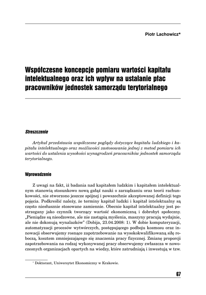 Piotr Lachowicz* Wspó³czesne koncepcje pomiaru wartoœci kapita³u intelektualnego oraz ich wp³yw na ustalanie p³ac pracowników jednostek samorz¹du terytorialnego Streszczenie Artyku≥ przedstawia wspÛ≥czesne poglπdy dotyczπce kapita≥u ludzkiego i kapita≥u intelektualnego oraz moøliwoúci zastosowania jednej z metod pomiaru ich wartoúci do ustalenia wysokoúci wynagrodzeÒ pracownikÛw jednostek samorzπdu terytorialnego. Wprowadzenie Z uwagi na fakt, iø badania nad kapita≥em ludzkim i kapita≥em intelektualnym stanowiπ stosunkowo nowπ ga≥πü nauki o zarzπdzaniu oraz teorii rachunkowoúci, nie stworzono jeszcze spÛjnej i powszechnie akceptowanej definicji tego pojÍcia. PodkreúliÊ naleøy, øe terminy kapita≥ ludzki i kapita≥ intelektualny sπ czÍsto nies≥usznie stosowane zamiennie. Obecnie kapita≥ intelektualny jest postrzegany jako czynnik tworzπcy wartoúÊ ekonomicznπ i dobrobyt spo≥eczny. ÑPieniπdze sπ nieodzowne, ale nie zastπpiπ myúlenia, maszyny pracujπ wydajnie, ale nie dokonujπ wynalazkÛwî (Dobija, 23.04.2008: 1). W dobie komputeryzacji, automatyzacji procesÛw wytwÛrczych, postÍpujπcego podboju kosmosu oraz innowacji obserwujemy rosnπce zapotrzebowanie na wysokokwalifikowanπ si≥Í roboczπ, kosztem zmniejszajπcego siÍ znaczenia pracy fizycznej. ZmianÍ proporcji zapotrzebowania na rodzaj wykonywanej pracy obserwujemy zw≥aszcza w nowoczesnych organizacjach opartych na wiedzy, ktÛre zatrudniajπ i inwestujπ w tzw. * Doktorant, Uniwersytet Ekonomiczny w Krakowie. 67 WSPÓ£CZESNA EKONOMIA Nr 2/2008(6) pracownikÛw wiedzy, dysponujπcych wysokπ wartoúciπ kapita≥u intelektualnego. CzÍsto zastanawiamy siÍ, dlaczego jedne firmy radzπ sobie lepiej niø inne, dysponujπce podobnymi aktywami materialnymi? Wynika to zazwyczaj z przewagi w posiadanym kapitale intelektualnym. PodkreúliÊ naleøy rÛwnieø, øe Ñduøa wartoúÊ dodana, przypadajπca na jednego pracownika, wskazuje na wysokie kwalifikacje personelu, co jest charakterystyczne dla branø opierajπcych siÍ na wiedzy, w ktÛrych w≥asnoúÊ intelektualna odgrywa znaczπcπ rolÍî (Jashapara, 2006: 334). To samo zjawisko wystÍpuje rÛwnieø w przypadku porÛwnania jednostek samorzπdu terytorialnego. Dysponujπc podobnym potencja≥em jedne odnoszπ duøe sukcesy i cieszπ siÍ zaufaniem mieszkaÒcÛw inne sπ przedmiotem krytyki. W niniejszej pracy przedstawiono moøliwoúci wykorzystania jednej ze wspÛ≥czesnych koncepcji pomiaru wartoúci kapita≥u ludzkiego jako wyjúciowej podstawy ustalania p≥ac pracownikÛw jednostek samorzπdu terytorialnego. PorÛwnano teø uzyskane wyniki z wielkoúciami uzyskanymi w oparciu o metodÍ tradycyjnπ. 1. Historyczne podejúcie do pojÍcia kapita≥u intelektualnego Dr John Lightfoot, rektor Collegium åw. Katarzyny w Cambridge, twierdzi≥, øe úwiat zosta≥ stworzony 23 paüdziernika 4004 roku p.n.e. o godzinie dziewiπtej rano. Biorπc pod uwagÍ symbolicznπ rolÍ Cambridge jako oúrodka naukowego oraz rozwÛj teorii naukowych od XVII wieku do czasÛw nowoøytnych naleøy podkreúliÊ, iø wspÛ≥czesna nauka ustali≥a domniemany wiek geologiczny kuli ziemskiej dopiero w wyniku badaÒ ostatnich dwudziestu lat. Ustalenie wieku geologicznego ziemi wynika bezpoúrednio z posiadania przez rodzaj ludzki cechy zwanej obecnie kapita≥em intelektualnym. Posiadanie przez ludzi cechy wyrÛøniajπcej ich spoúrÛd innych gatunkÛw zdolnoúciπ do przyswajania wiedzy i zdobywania doúwiadczenia pozwoli≥o na powstanie cywilizacji. Od czasÛw staroøytnych ludzie obserwowali procesy zwiπzane z tworzeniem siÍ kapita≥u intelektualnego, choÊ oczywiúcie samo pojÍcie kapita≥u nie by≥o wÛwczas znane. W staroøytnym Egipcie w≥adzÍ rÛwnπ czÍsto w≥adzy faraonÛw posiadali kap≥ani, bÍdπcy zazwyczaj uczonymi dysponujπcymi wiedzπ naukowπ i doúwiadczeniem stanowiπcymi dla przeciÍtnego, nawet dobrze urodzonego poddanego przys≥owiowπ Ñczarnπ magiÍî. W≥adza kap≥anÛw wynika≥a bezpoúrednio z intelektu, a nie (jak to mia≥o miejsce w spo≥eczeÒstwach pierwotnych) z si≥y fizycznej. W V wieku n.e., podczas wojny peloponeskiej, Grecy zauwaøyli, øe niewykwalifikowany niewolnik pracujπcy w kamienio≥omach Laurionu dawa≥ dziennie dochÛd pozwalajπcy w ciπgu trzech do czterech lat na amortyzacjÍ kwoty wy≥oøonej na jego zakup. W podobnym mniej wiÍcej czasie amortyzowa≥a siÍ kwota wy≥oøona na zakup niewolnika wykwalifikowanego, ktÛry by≥ znacznie droøszy, lecz ktÛrego praca przynosi≥a o wiele wiÍkszy dochÛd (Kumaniecki, 1965: 210). Przedstawiony przyk≥ad dowodzi, øe juø w staroøytnej Grecji kapita≥ intelektualny ludzi wykonujπcych pracÍ stanowi≥ przedmiot gospodarki towarowo ñ pieniÍønej. 68 WSPÓ£CZESNA EKONOMIA Nr 2/2008(6) 2. PojÍcie kapita≥u W literaturze cytuje siÍ wiele definicji kapita≥u, np. Kamerschen, Mc Kenzie, Nardinelli (1992: 4) twierdzπ, øe kapita≥ to Ñ[dobra inwestycyjne] obejmujπce wszelki wynik procesu produkcyjnego, ktÛry przeznaczony jest do pÛüniejszego wykorzystania w procesie produkcyjnymî. J. Schumpeter (1960: 186) twierdzi≥, øe Ñkapita≥ nie jest niczym innym jak tylko düwigniπ, za pomocπ ktÛrej przedsiÍbiorca podporzπdkowuje sobie potrzebne mu konkretne dobra, niczym innym jak tylko úrodkiem skierowania czynnikÛw produkcji do nowych form ich wykorzystania lub narzucenia produkcji nowego kierunkuî. Musimy stwierdziÊ, iø nie powsta≥a jeszcze uznawana przez wiÍkszoúÊ reprezentantÛw nauk ekonomicznych definicja kapita≥u. ÑZgodnie z definicjπ podanπ przez E. von Bˆhm-Bawerek, s≥owo Ñkapita≥î pochodzi od ≥aciÒskiego capita lis, przymiotnika korespondujπcego z rzeczownikiem caput, oznaczajπcym g≥owÍ. Podstawowe uøycie tego terminu dotyczy≥o sumy poøyczonych pieniÍdzy, czyli g≥Ûwnej czÍúci d≥ugu rÛøniπcej siÍ od odsetek. Niewielkie uogÛlnienie prowadzi d