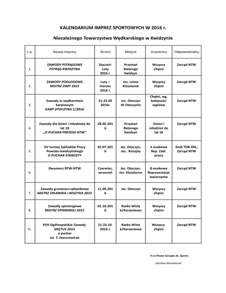 KALENDARIUM IMPREZ SPORTOWYCH W 2016 r. Niezależnego Towarzystwa Wędkarskiego w Kwidzynie L.p. Nazwa imprezy Termin Miejsce Uczestnicy Odpowiedzialny ZAWODY PSTRĄGOWE PSTRĄG KWIDZYNA StyczeńLuty 2016 r. Przystań Batorego Kwidzyn Wszyscy chętni Zarząd NTW 1. ZAWODY PODLODOWE MISTRZ ZIMY 2015 Luty – marzec 2016 r. Jez. Leśne Klasztorek Wszyscy chętni Zarząd NTW 2. 3. Zawody w wędkarstwie karpiowym KARP OTOCZYNA 1/2016 21-22.05 2016r. Jez. Otoczyn W Otoczynie Chętni, wg. kolejności zapisów Zawody dla dzieci i młodzieży do lat 18 ,,O PUCHAR PREZESA NTW” 28.05.201 6 Przystań Batorego Kwidzyn Dzieci i młodzież do lat 16 Zarząd NTW 4. 5. XV turniej Zakładów Pracy Powiatu kwidzyńskiego O PUCHAR STAROSTY 02.07.201 6 Jez. Otoczyn, Jez.. Rozajny 3 osobowe Rep. Zakł. pracy Klub TOR-PAL, Zarząd NTW Dwumecz BTW-NTW Czerwiec, wrzesień Jez. Otoczyn, Jez. Klasztorne 8-osobowe Reprezentacje towarzystw Zarząd NTW Zawody gruntowo-spławikowe MISTRZ SPŁAWIKA I KOSZYKA 2015 11.09.201 6 Jez. Otoczyn Wszyscy chętni Zarząd NTW 7. Zawody spinningowe MISTRZ SPINNINGU 2015 01.10.201 6 Rzeka Wisła k/Korzeniewa Wszyscy chętni Zarząd NTW 8. XVII Ogólnopolskie Zawody MIĘTUS 2015 o puchar im. T. Jaworowicza 21-23.10. 2016 r. Rzeka Wisła k/Korzeniewa Wszyscy chętni Zarząd NTW 6. 9.. Zarząd NTW V-ce Prezes Zarządu ds. Sportu Zdzisław Biesiekierski
