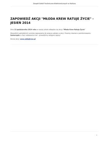 Zespół Szkół Techniczno-Elektronicznych w Kaliszu ZAPOWIEDŹ AKCJI "MŁODA KREW RATUJE ŻYCIE" JESIEŃ 2014 Dnia 13 października 2014 roku w naszej szkole odbędzie się akcja "Młoda Krew Ratuje Życie" Wszystkich pełnoletnich uczniów zapraszamy do wzięcia udziału w akcji. Prosimy również o poinformowaniu Samorządu o chęci oddawania krwi - prowadzimy wstępne zapisy! Strona akcji: www.oddajkrew.pl 1