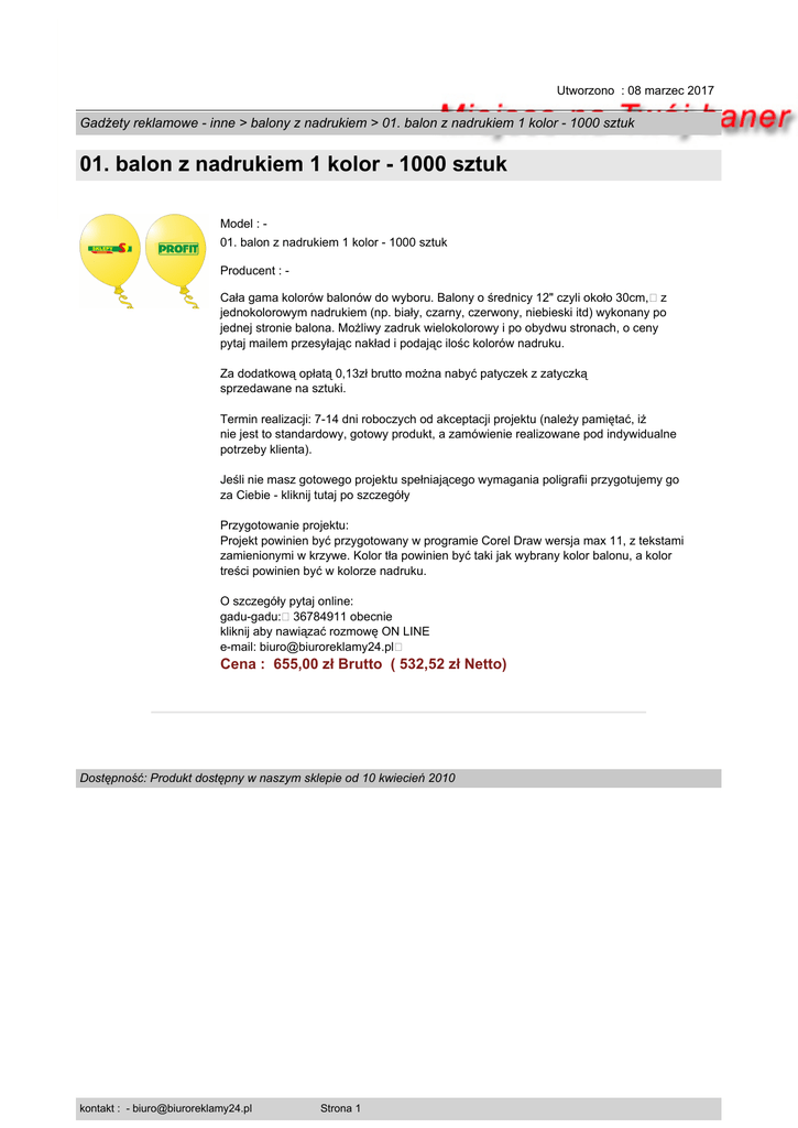 Utworzono : 08 marzec 2017 Gadżety reklamowe - inne > balony z nadrukiem > 01. balon z nadrukiem 1 kolor - 1000 sztuk 01. balon z nadrukiem 1 kolor - 1000 sztuk Model : 01. balon z nadrukiem 1 kolor - 1000 sztuk Producent : Cała gama kolorów balonów do wyboru. Balony o średnicy 12" czyli około 30cm,�z jednokolorowym nadrukiem (np. biały, czarny, czerwony, niebieski itd) wykonany po jednej stronie balona. Możliwy zadruk wielokolorowy i po obydwu stronach, o ceny pytaj mailem przesyłając nakład i podając ilośc kolorów nadruku. Za dodatkową opłatą 0,13zł brutto można nabyć patyczek z zatyczką sprzedawane na sztuki. Termin realizacji: 7-14 dni roboczych od akceptacji projektu (należy pamiętać, iż nie jest to standardowy, gotowy produkt, a zamówienie realizowane pod indywidualne potrzeby klienta). Jeśli nie masz gotowego projektu spełniającego wymagania poligrafii przygotujemy go za Ciebie - kliknij tutaj po szczegóły Przygotowanie projektu: Projekt powinien być przygotowany w programie Corel Draw wersja max 11, z tekstami zamienionymi w krzywe. Kolor tła powinien być taki jak wybrany kolor balonu, a kolor treści powinien być w kolorze nadruku. O szczegóły pytaj online: gadu-gadu:�36784911 obecnie kliknij aby nawiązać rozmowę ON LINE e-mail: [email protected]� Cena : 655,00 zł Brutto ( 532,52 zł Netto) Dostępność: Produkt dostępny w naszym sklepie od 10 kwiecień 2010 kontakt : - [email protected] Strona 1