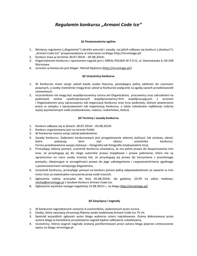 Regulamin konkursu „Armani Code Ice” §1 Postanowienia ogólne 1. 2. 3. 4. Niniejszy regulamin („Regulamin”) określa warunki i zasady, na jakich odbywa się konkurs („Konkurs”): „Armani Code Ice” przeprowadzony w Internecie na blogu http://mrvintage.pl/ Konkurs trwa w terminie 30.07.2014r - 05.08.2014r. Organizatorem konkursu i sponsorem nagród jest L OREAL POLSKA SP Z O O, ul. Daniszewska 4, 03-230 Warszawa. Jurorem w Konkursie jest bloger: Michał Kędziora (http://mrvintage.pl/) §2 Uczestnicy konkursu 1. 2. W Konkursie może wziąć udział każda osoba fizyczna, posiadająca pełną zdolność do czynności prawnych, a osoby małoletnie mogą brać udział w Konkursie wyłącznie za zgodą swoich przedstawicieli ustawowych. Uczestnikami nie mogą być współpracownicy Jurora ani Organizatora, pracownicy oraz zatrudnieni na podstawie umów cywilnoprawnych współpracownicy firm współpracujących z Jurorem i Organizatorem przy opracowaniu lub organizacji Konkursu oraz inne podmioty, którym powierzono prace w związku z opracowaniem lub organizacją Konkursu, a także członkowie najbliższej rodziny wyżej wymienionych osób (małżonkowie, rodzice, rodzeństwo, dzieci). §3 Terminy i zasady konkursu 1. 2. 3. 4. 5. 6. 7. 8. Konkurs odbywa się w dniach: 30.07.2014r - 05.08.2014r. Konkurs organizowany jest na terenie Polski. W Konkursie można wziąć udział jednokrotnie. Zasady konkursu: Zadaniem konkursowym jest przygotowanie własnej stylizacji lub zestawu ubrań, które pokazują letni styl ubioru uczestnika konkursu. Forma przedstawienia swojej stylizacji – fotografia lub fotografie (maksymalnie trzy). Przesyłając własny pomysł, uczestnik Konkursu oświadcza, że ma pełne prawo do dysponowania nim oraz, że przysługują jej do niego autorskie prawa majątkowe i prawa pokrewne, które nie są ograniczone na rzecz osoby trzeciej lub, że przysługują jej prawa do korzystania z przesłanego pomysłu, obejmujące w szczególności prawo do jego udostępniania i rozpowszechniania zgodnego z postanowieniami niniejszego Regulaminu. Uczestnik konkursu, przesyłając pomysł na konkurs ponosi pełną odpowiedzialność za zawarte w nim treści oraz za ewentualne naruszenie praw osób trzecich. Zgłoszenia należy przesyłać do dnia 05.08.2014r. do godziny: 23:59 na adres mailowy: [email protected] z tytułem Konkurs Armani Code Ice. Ogłoszenie wyników nastąpi najpóźniej 15.08.2014 r., na blogu http://mrvintage.pl/ §4 Zwycięzcy i nagrody 1. 2. 3. 4. W konkursie nagrodzonych zostanie 4 uczestników, wyłonionych przez Jurora. Osoby, które zwyciężą otrzymają flakony wody toaletowej Armani Code Ice 75 ml. Spośród wszystkich zgłoszeń autor bloga wybierze cztery najciekawsze. Ocena dokonywana przez autora bloga w kontekście przydzielania nagród będzie całkowicie subiektywna. Uczestnicy, którzy wygrali nagrody zostaną poinformowani przez autora bloga poprzez umieszczenie wpisu na blogu mrvintage.pl. 5. Po wyłonieniu laureatów, powinni się oni skontaktować z autorem bloga poprzez adres: [email protected], nie później jednak niż w terminie do dnia 20.08.2014 r. Po tym terminie laureat nagrody traci do niej prawo. 6. Treść wiadomości, o której mowa w ust. 8 powinna zawierać co najmniej: imię i nazwisko, adres pocztowy na terenie Rzeczpospolitej Polskiej, pod który powinna zostać nadana nagroda, nr telefonu. 7. Nagrodzonemu Zwycięzcy nie przysługuje prawo do zamiany nagrody rzeczowej na jej ekwiwalent pieniężny lub rzecz innego rodzaju. 8. Podmiotem odpowiedzialnym za wysyłkę nagród jest ich organizator - L OREAL POLSKA SP Z O O. 9. Nagrody rzeczowe zostaną przekazane Zwycięzcom za pośrednictwem firmy kurierskiej. 10. Organizator oświadcza, że nagrody są zwolnione z podatku dochodowego od osób fizycznych na zasadzie art. 21 ust. 1 pkt. 68 ustawy z dnia 26 lipca 1991 r. o podatku dochodowym od osób fizycznych. §5 Dane Osobowe 1. 2. 3. Administratorem danych osobowych Uczestników konkursu jest Organizator. Uczestnikom przysługuje prawo dostępu do swoich danych osobowych oraz prawo do ich poprawiania. Uczestnik przystępując do Konkursu wyraża zgodę na przetwarzanie swoich danych osobowych przez Organizatora w celu realizacji Konkursu. §6 Odpowiedzialność 1. Organizator nie ponosi odpowiedzialności za doręczenie i terminowość doręczenia przez właściwych operatorów, w tym za pośrednictwem systemów teleinformatycznych (również poczty elektronicznej) listów, wiadomości i przesyłek kierowanych do i przez Uczestników, ani za przerwy i inne nieprawidłowości w funkcjonowaniu stron internetowych, za pośrednictwem których zamieszczane będą Zgłoszenia. Organizator nie ponosi również odpowiedzialności za ewentualne problemy techniczne, mające wpływ na wypełnienie warunków uczestnictwa w Konkursie. 2. Organizator nie ponosi odpowiedzialności za nieprzestrzeganie przez Uczestników postanowień niniejszego Regulaminu, w szczególności jeżeli treść Zgłoszenia będzie sprzeczna z prawem, będzie naruszać prawa osób trzecich, będzie sprzeczna z dobrymi obyczajami, albo będzie zawierać lub opisywać sytuacje lub zdarzenia, które mogą powodować zagrożenie dla zdrowia lub życia ludzi lub zwierząt. 3. Zgłoszenia przesłane przez Uczestnika w związku z wzięciem przez niego udziału w Konkursie muszą być całkowicie oryginalne, a w szczególności nie mogą stanowić opracowań innych utworów, nie mogą w nich być wykorzystywane jakiekolwiek ilustracje, zdjęcia lub inne elementy, do których prawa przysługiwałyby osobom trzecim. Uczestnik poprzez przesłanie zdjęcia potwierdza, że przysługują mu do zdjęcia/filmu wszelkie prawa autorskie w rozumieniu ustawy z dnia 4 lutego 1994 r. o prawie autorskim i prawach pokrewnych (Dz.U. Nr 24, poz. 83 z późn. zm.). Uczestnik poprzez wysłanie zdjęcia w ramach Zgłoszenia wyraża zgodę na rozpowszechnianie jego wizerunku w ramac
