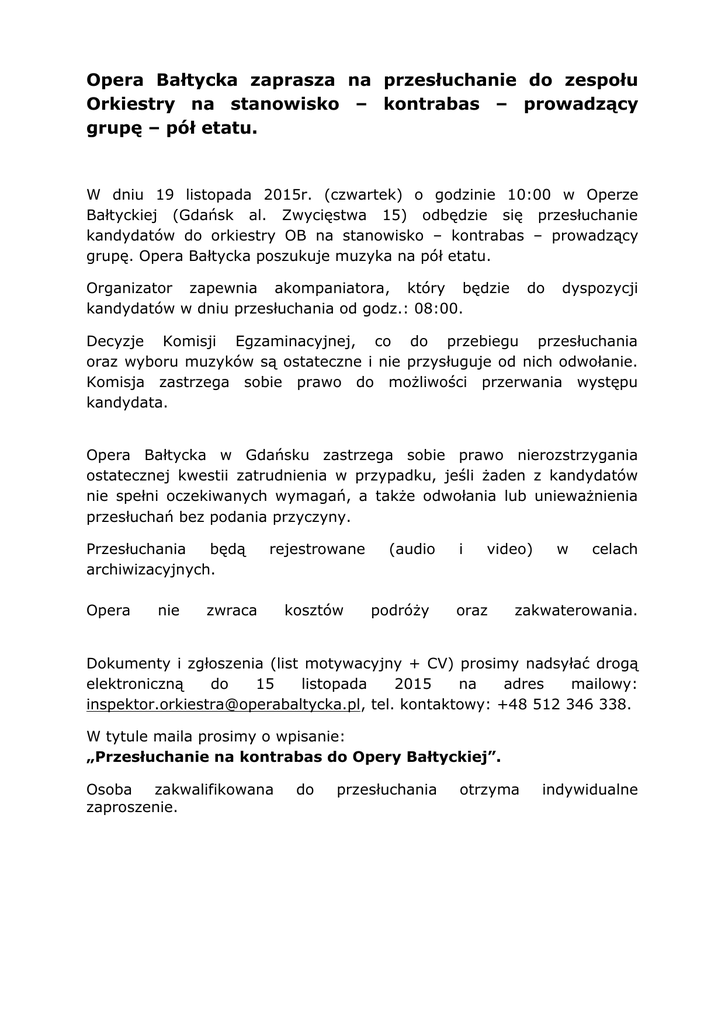 Opera Bałtycka zaprasza na przesłuchanie do zespołu Orkiestry na stanowisko – kontrabas – prowadzący grupę – pół etatu. W dniu 19 listopada 2015r. (czwartek) o godzinie 10:00 w Operze Bałtyckiej (Gdańsk al. Zwycięstwa 15) odbędzie się przesłuchanie kandydatów do orkiestry OB na stanowisko – kontrabas – prowadzący grupę. Opera Bałtycka poszukuje muzyka na pół etatu. Organizator zapewnia akompaniatora, który będzie kandydatów w dniu przesłuchania od godz.: 08:00. do dyspozycji Decyzje Komisji Egzaminacyjnej, co do przebiegu przesłuchania oraz wyboru muzyków są ostateczne i nie przysługuje od nich odwołanie. Komisja zastrzega sobie prawo do możliwości przerwania występu kandydata. Opera Bałtycka w Gdańsku zastrzega sobie prawo nierozstrzygania ostatecznej kwestii zatrudnienia w przypadku, jeśli żaden z kandydatów nie spełni oczekiwanych wymagań, a także odwołania lub unieważnienia przesłuchań bez podania przyczyny. Przesłuchania będą archiwizacyjnych. Opera nie rejestrowane zwraca kosztów (audio podróży i video) oraz w celach zakwaterowania. Dokumenty i zgłoszenia (list motywacyjny + CV) prosimy nadsyłać drogą elektroniczną do 15 listopada 2015 na adres mailowy: [email protected], tel. kontaktowy: +48 512 346 338. W tytule maila prosimy o wpisanie: „Przesłuchanie na kontrabas do Opery Bałtyckiej”. Osoba zakwalifikowana zaproszenie. do przesłuchania otrzyma indywidualne Program przesłuchań na kontrabas – prowadzący grupę: ETAP I (za kotarą): 1. Do wyboru: K. D. von Dittersdorf – Koncert na kontrabas D-dur nr 2 – część I z kadencją; J. B. Vanhal – Koncert na kontrabas Es-dur – część I z kadencją; 2. Do wyboru: G. Bottesini – Koncert na kontrabas h-moll nr 2 - część I z kadencją S. Kusewicki – Koncert na kontrabas Op. 3 - część I 3. Dowolny utwór solo. ETAP II: Studia orkiestrowe – fragmenty do przygotowania: G. Verdi – Rigoletto G. Verdi – Otello – akt IV G. Verdi – Aida – akt IV G. Verdi - Traviata G. Puccini – Madama Butterfly K. Penderecki – Ubu Rex G. Mahler – Symfonia nr 1, cz. 3 solo I. Strawiński – Pulcinella – solo R. Wagner – Walkiria W. A. Mozart – Czarodziejski flet W. A. Mozart – Wesele Figara R. Strauss – Don Juan S. Prokofiew – Suita symfoniczna z filmu "Porucznik Kiże", op. 60 Studia orkiestrowe dla zainteresowanych osób w formacie PDF dostępne są tutaj. Przy dużej liczbie kandydatów czas trwania przesłuchań może zostać skrócony. W przypadku wyrównanego poziomu finalistów ETAPU II dopuszcza się ETAP III, czyli czynne uczestnictwo w próbie orkiestry do aktualnego repertuaru Opery Bałtyckiej. Terminy Etapu III będą ustalane indywidualnie.